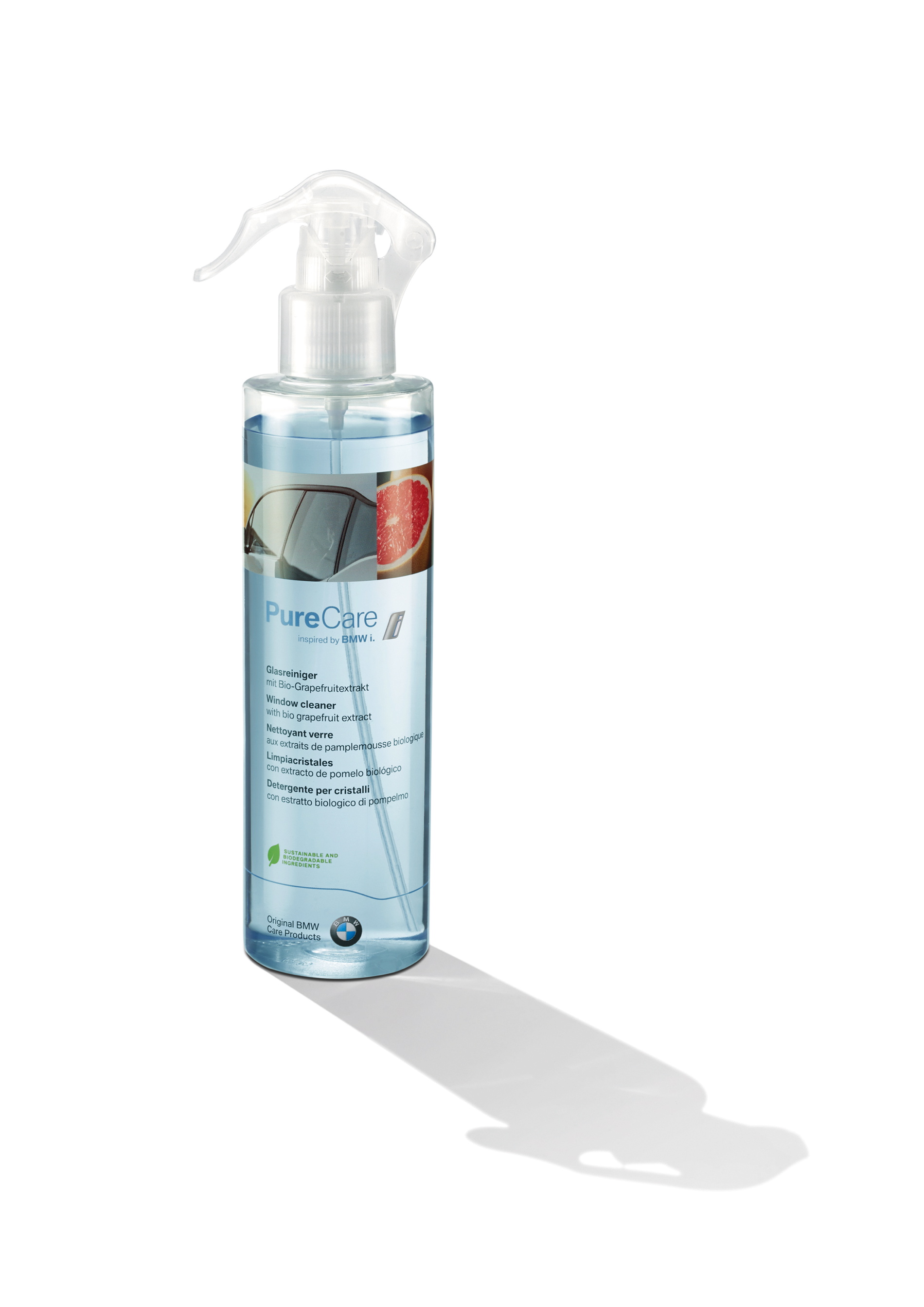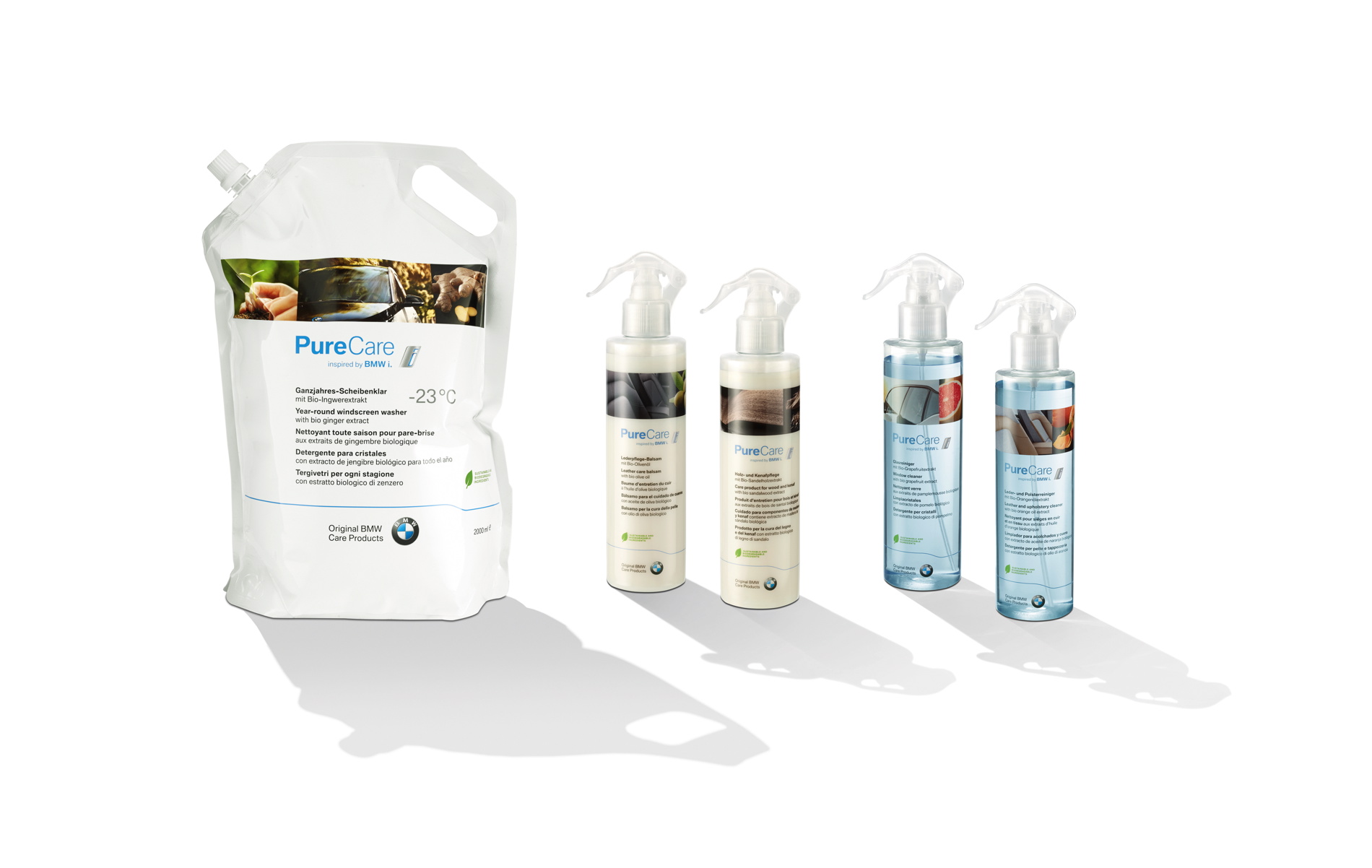All care products are most economical in use and contain natural ingredients that not only achieve outstanding results but are also biodegradable and environmentally compatible. The natural ingredients are gained entirely from food industry waste that is not suitable for human consumption such as orange peel, for example. The production of spray bottles and labels is also carried out in an environmentally friendly, resource-saving manner. Water and energy consumption in particular is very low. With their caring effect, products from PureCare inspired by BMW i also contribute towards the value retention of the vehicle.