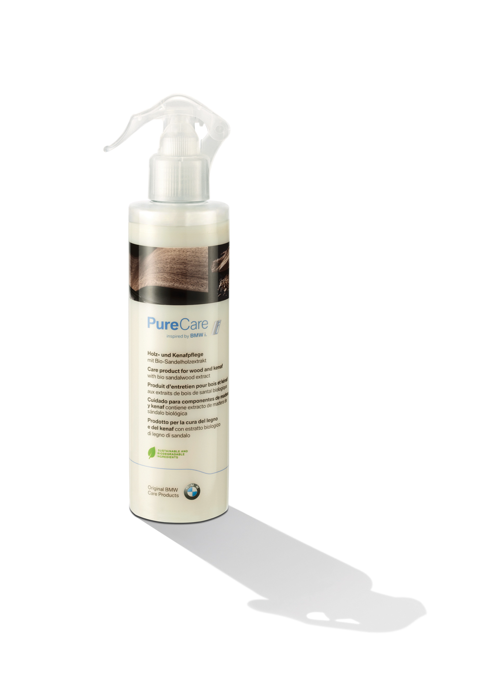 Wood and kenaf care from PureCare inspired by BMW i contains organic sandalwood extract and was designed especially for cleaning porous materials such as kenaf and eucalyptus wood. It is not only ideal for the care of moisture-sensitive surfaces, but also provides lasting effective protection.
