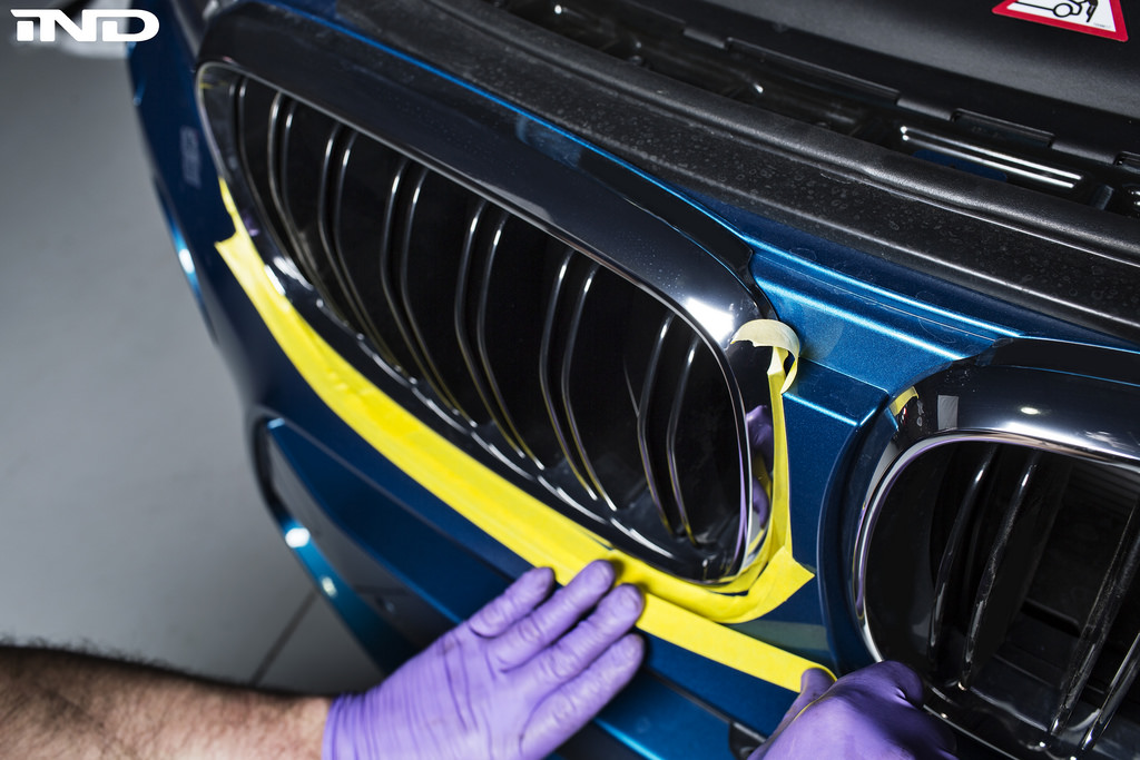 Step 1: The first step in this procedure is to mask the area on the bottom and sides of the front kidney grilles. This is a precautionary step to protect the vehicles paint.