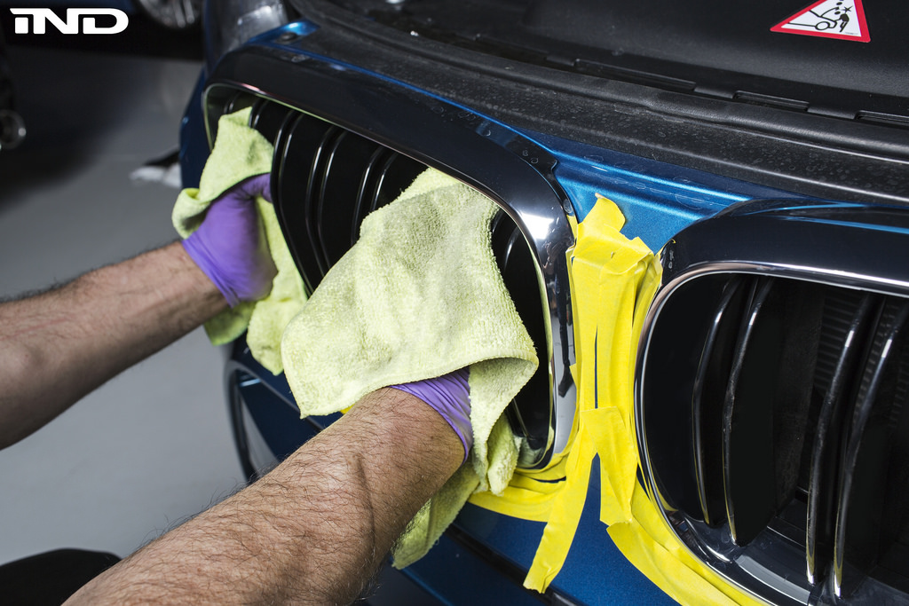 Step 5: Remove the painters tape and install the gloss black kidney grilles. The grilles will click into place.