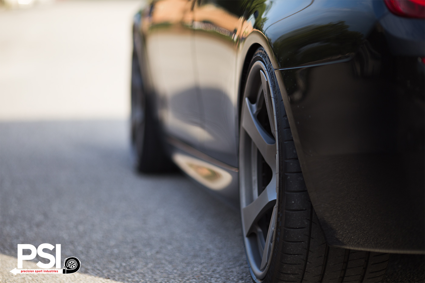 Well aware that a misstep can sink an otherwise fantastic build, PSI settled on the striking RS102M model, with their unmistakable 5-spoke design. The directional design resembles a ship’s propellers, and is impossible to ignore out on the street, while the Satin Charcoal Gray finish offsets the Sapphire Black body paint. They had the inner barrels custom painted to match the centers and lips for a seamless match.