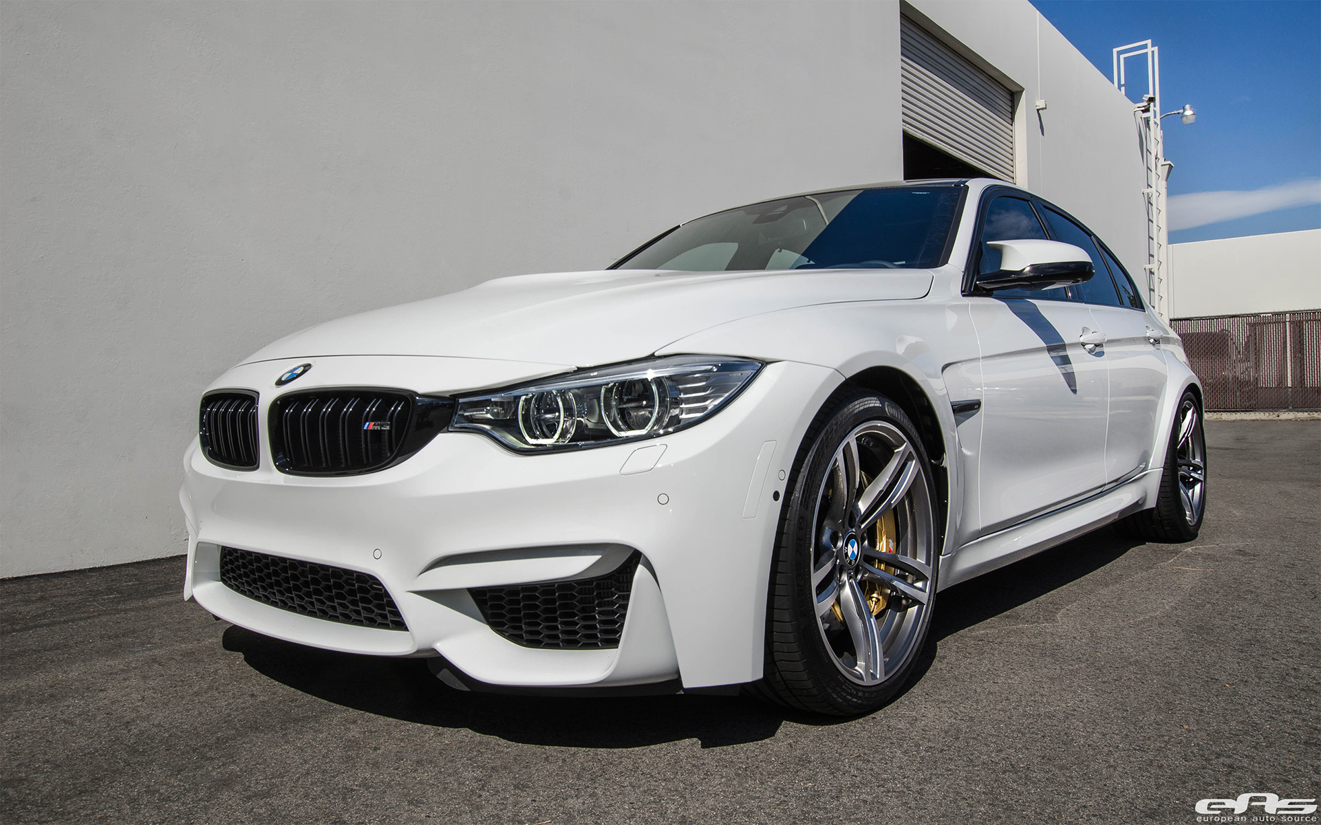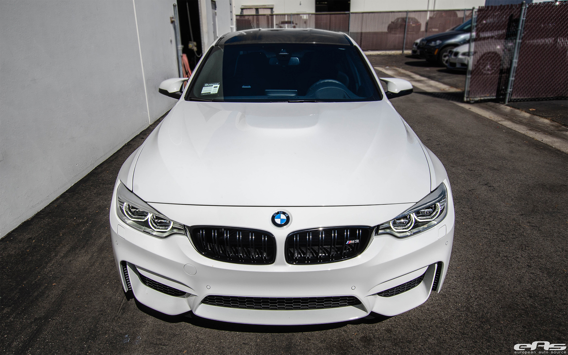 BMW F80 M3Â seen here comes with a set of M Carbon Ceramic Brakes and yellow calipers for improved braking power. Additionally European Auto Source added a black kidney grille and black side air vents along with black painted side reflectors. Inside, the car features orange stitching which looks great alongside a carbon fiber interior trim.