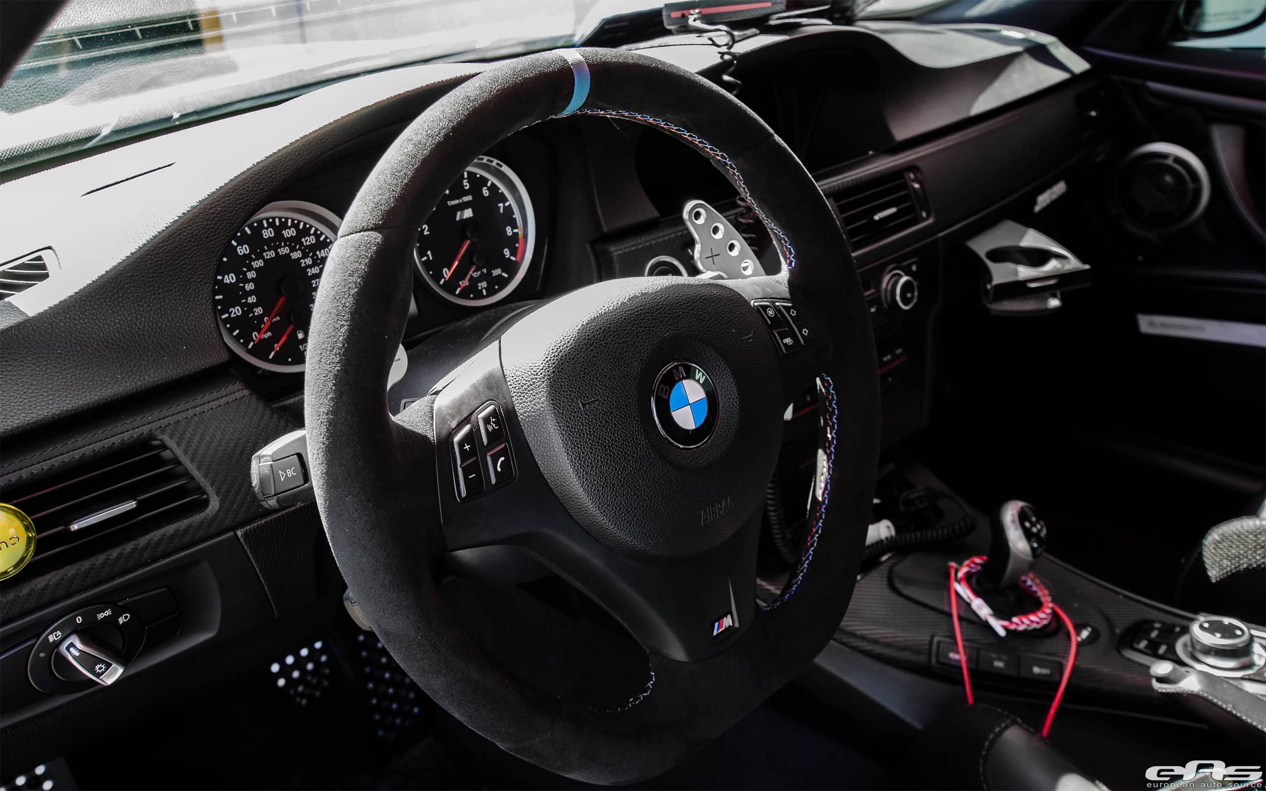 The M Performance Parts steering wheel wrapped in alcantara adds more hand grip and control on the track. Even though this BMW E92 M3 can take it out with the best of them on the track, it is also street legal.