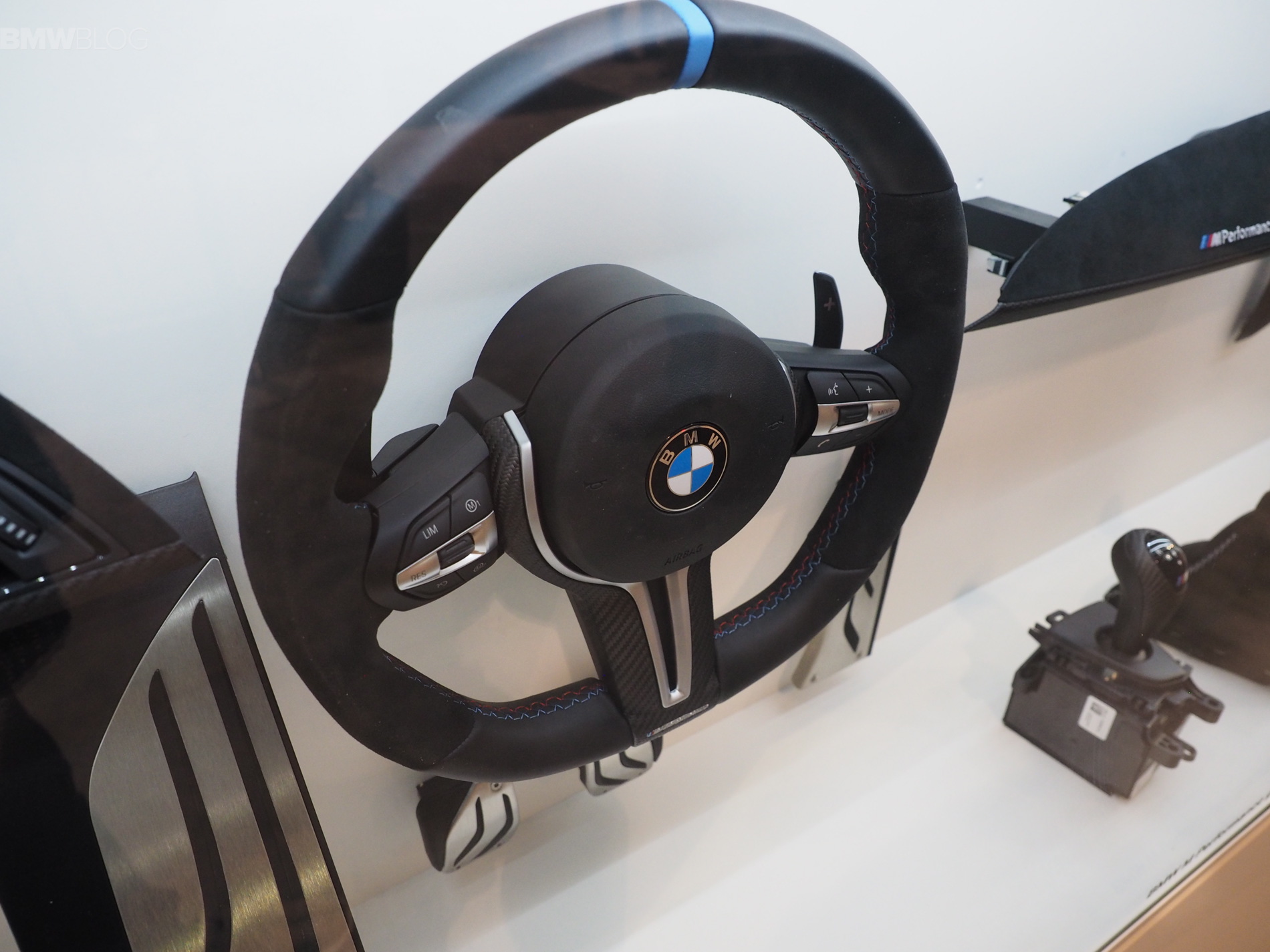 BMW showcased their new M Performance steering wheel with Alcantara cover and an open-pore carbon fiber trim element. The steering wheel is similar to the one for the M4 – the only variation is the carbon fiber weave. This is still a prototype and some small details might change when it goes in production.