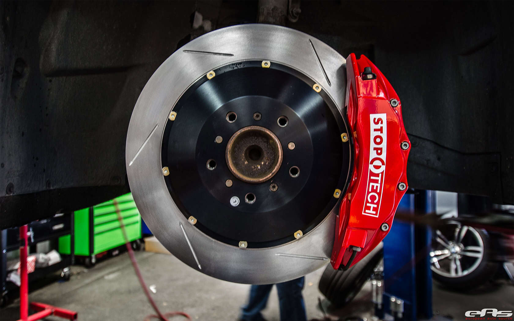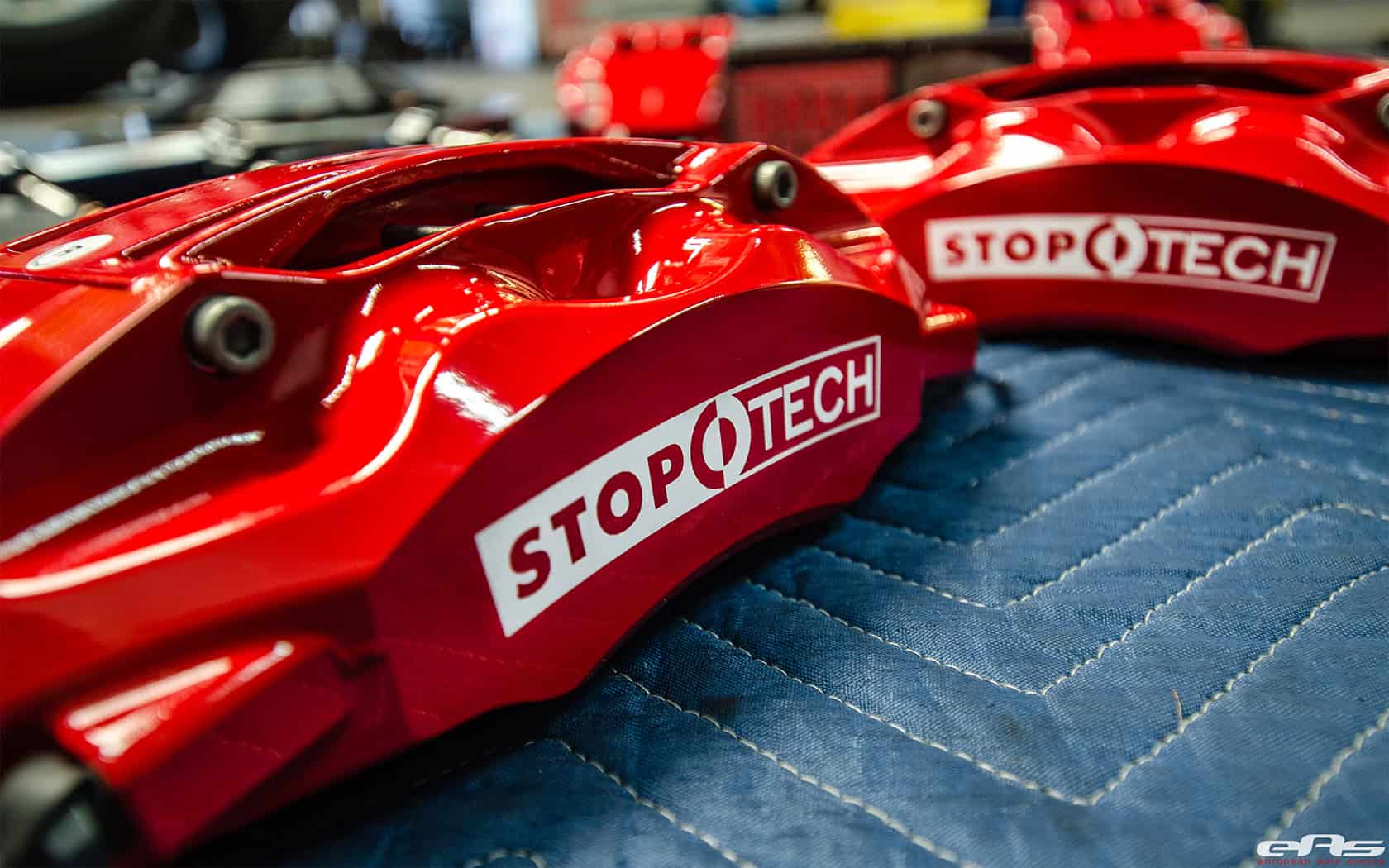 Up in the front is the ST-60 6-piston caliper with a 355mm cross-drilled rotor; in the rear is the ST-40 4-piston caliper with a 345mm cross-drilled rotor. With these StopTech brakes at all four corners, this M3 now has the stopping power to match the performance of the car.