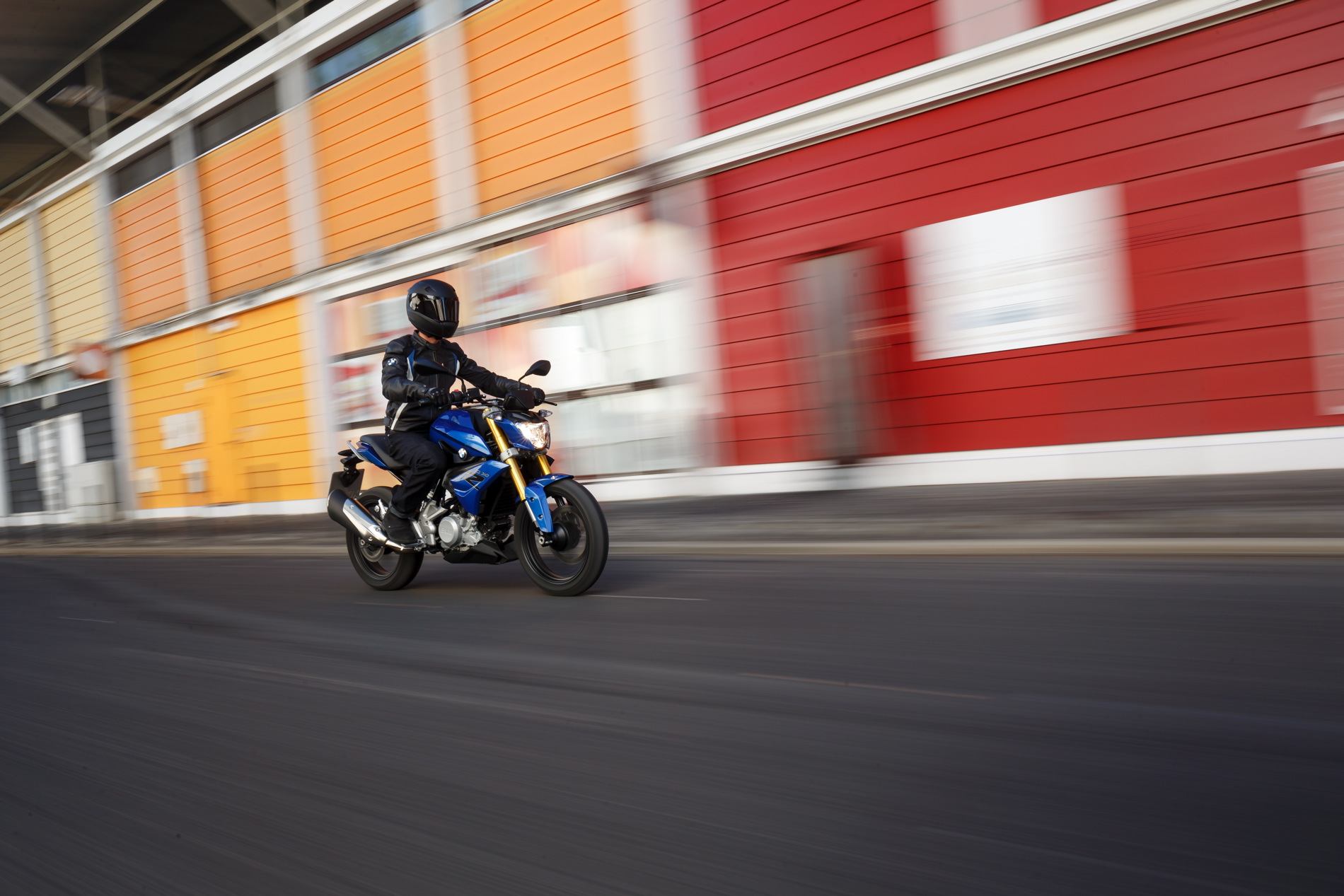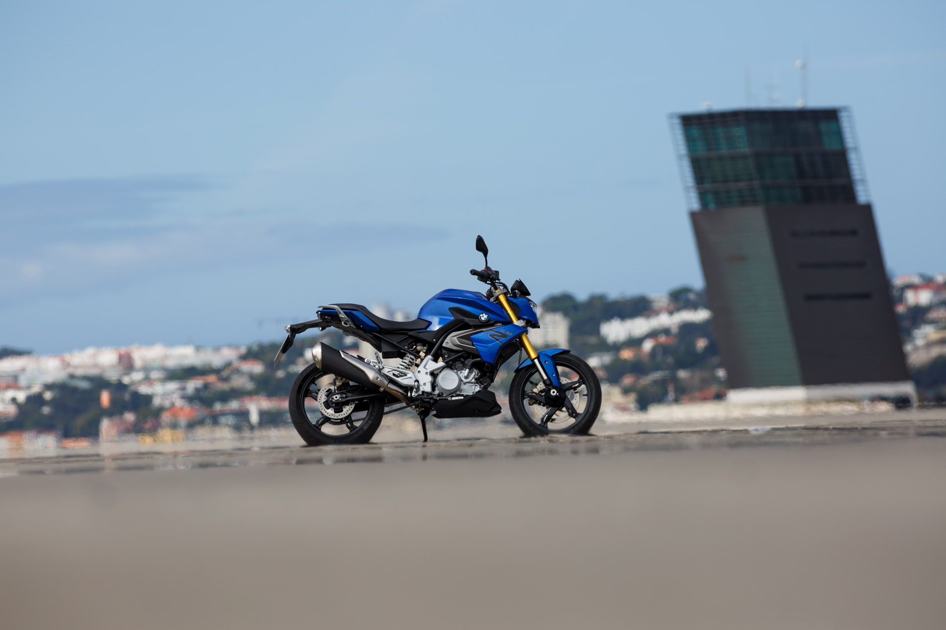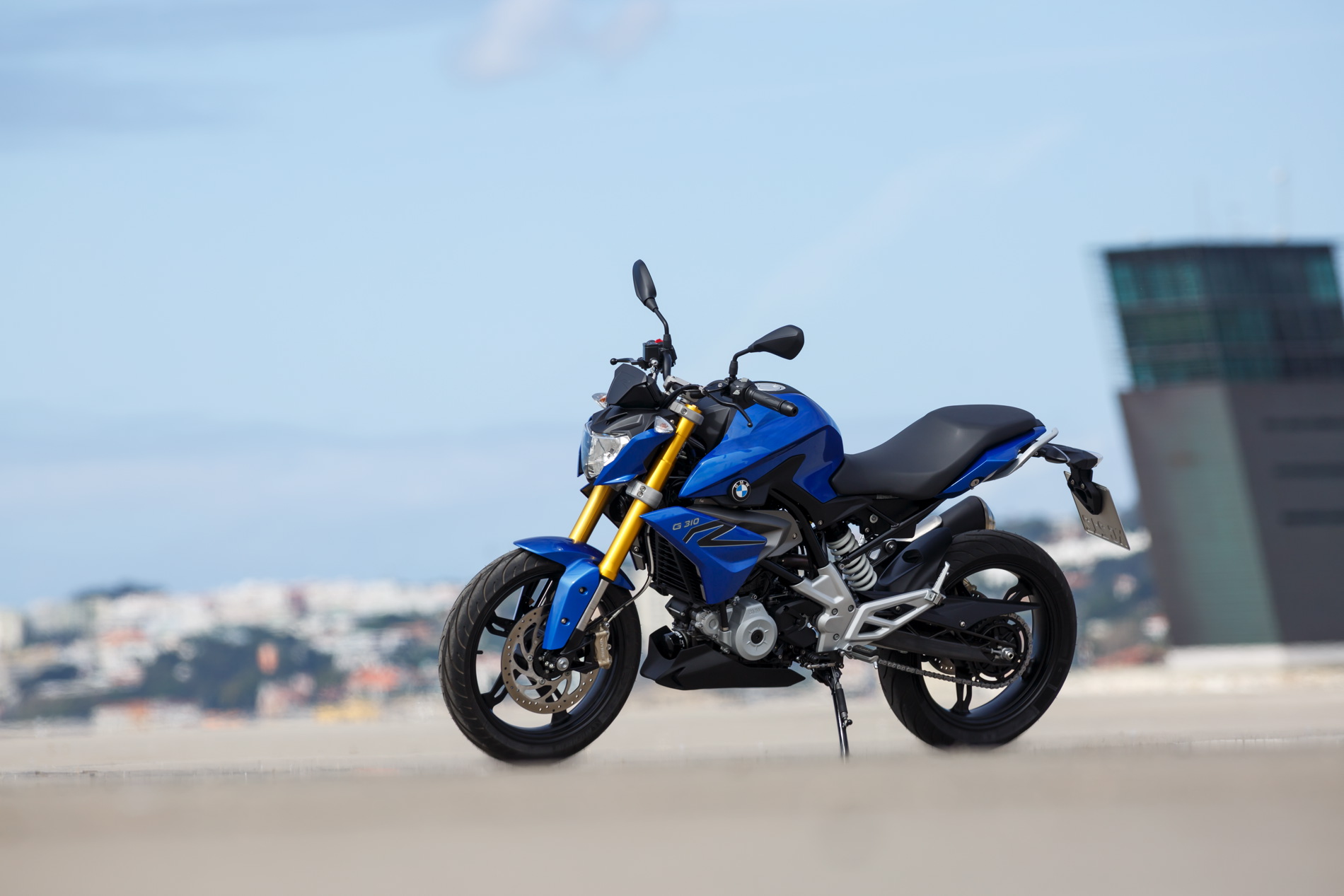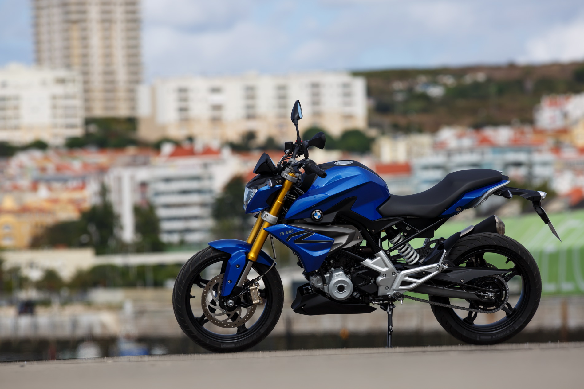 The powerfully expressive design of the BMWÂ GÂ 310Â R instantly reveals its agile, dynamic character, making a clear statement within its own segment. It has an unmistakeable visual kinship with athletic family members such as the BMW S 1000 R. The small headlamp mask with striking headlamp, dynamically modelled fuel tank trim elements and characteristic roadster proportions with a striking front section and dynamic rear give the BMWÂ GÂ 310Â R a mature presence on the road. Precisely modelled surfaces define the dynamic side view. The compact, dynamic proportions and the short wheelbase promise fast changes of direction, while the high rear conveys a lightness that is suggestive of the bike’s sporty genes. In spite of the clearly visible naked bike character of the BMWÂ GÂ 310Â R, the side surfaces in body colour create a closed silhouette in athletic style. High-end details such as a standard upside-down fork, quality materials, supplementary fittings and excellent workmanship all reflect the finest within the segment, clearly underscoring the premium aspiration of the BMWÂ GÂ 310Â R.