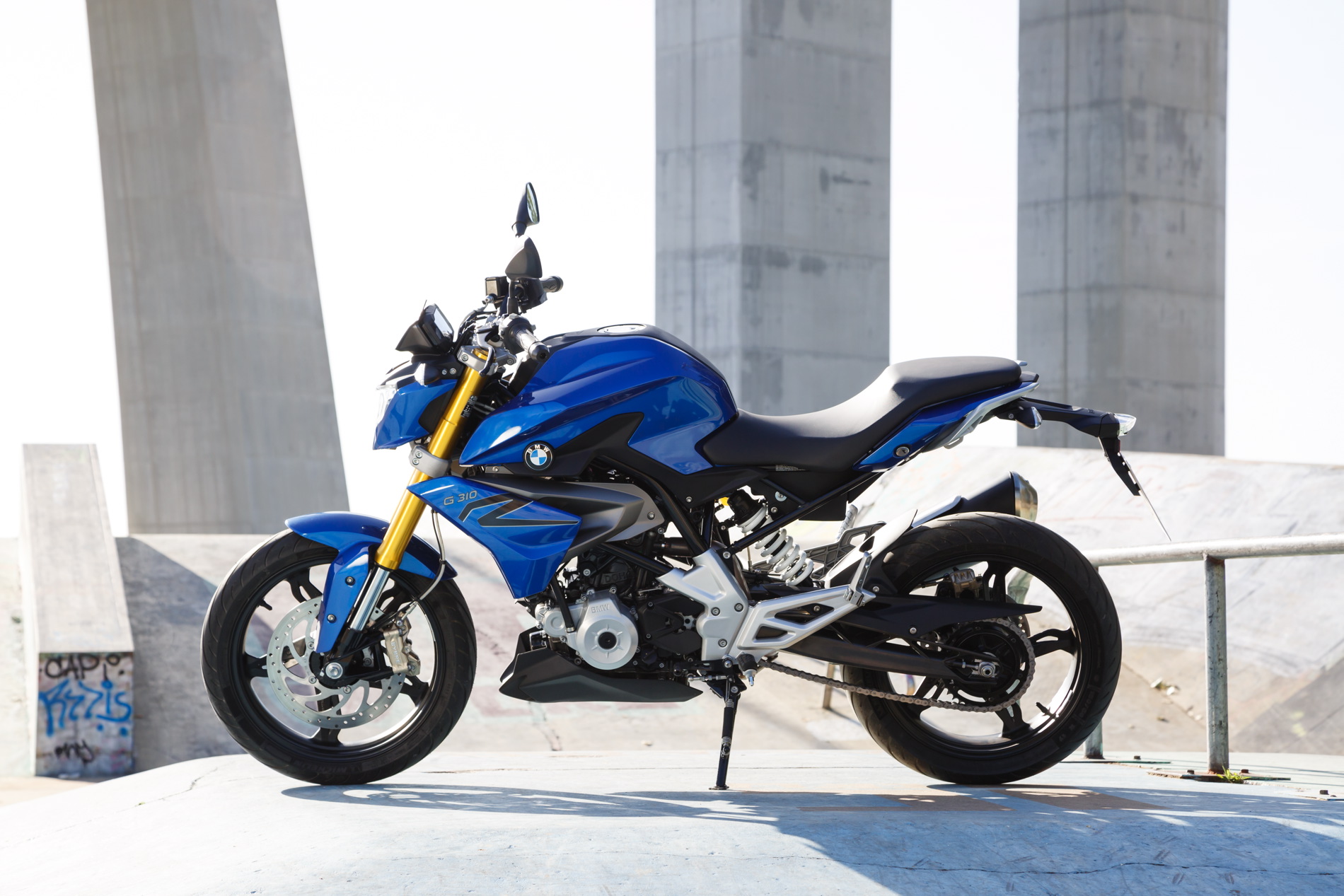The centrepiece of the new BMWÂ GÂ 310Â R is a completely newly developed 313 cc liquid-cooled single-cylinder engine with four valves and two overhead camshafts together with electronic fuel injection. The capacity of 313Â cc results from a bore of 80 millimetres and a stroke of 62.1 millimetres.