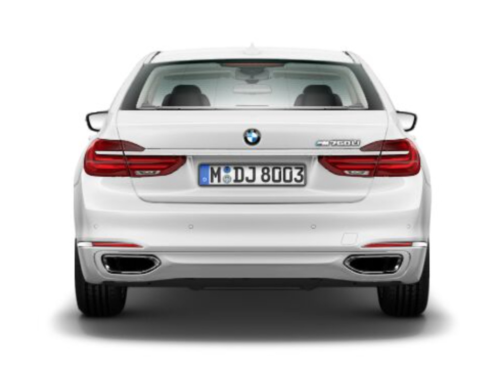 The design with a vertical strut within the oval tailpipes provides the look of four tailpipes and delivers connoisseurs a discreet indication of the top model with twelve-cylinder engine. As we have already announced some time ago, there will be the 760er of the new generation G11 / G12 only in the long version (G12), the short 7 Series Sedan (G11) will not be available with V12 engine.