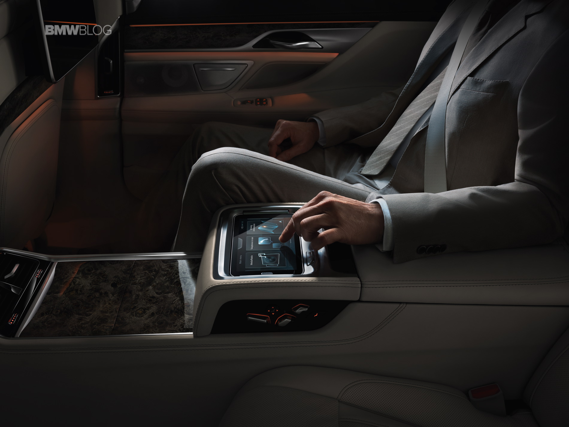 The multifunction control unit BMW Touch Command in the new BMW 7 Series has been perfectly tailored to the needs of passengers sitting in the rear of the car. The tablet with seven-inch display is integrated in the central armrest and can be taken out. This means that BMW Touch Command can be used on all seats as well as outside the vehicle. BMW Touch Command permits control of the information, entertainment and communication system, as well as comfort functions like air-conditioning, seat adjustment and interior lighting. It can also be used to surf the Internet, play back external audio and video files, or as a games console. Networking is carried out using a WiFi hotspot integrated in the vehicle.