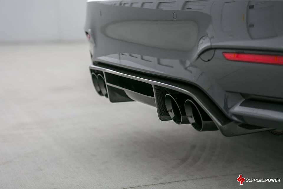 In terms of performance, Supreme Power gave the BMW M3 an AWE Tuning non-resonated exhaust system with 90mm Diamond Black tips which allow the engine to breath more freely, a set of KW height-adjustable springs with 1.2″ Front/0.75″ Rear lowering, and Macht Schnell wheel spacers (15mm front and 12mm rear) for a much sportier stance.