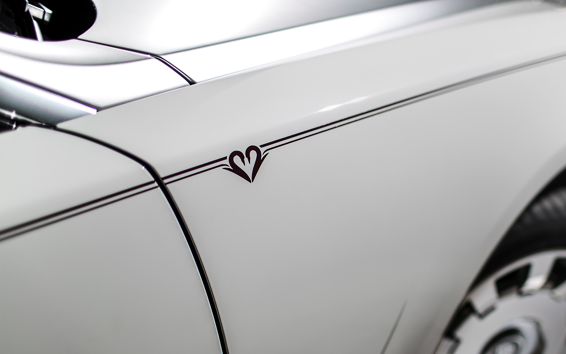 Echoing the theme of a swan’s elegant, pure and loyal approach to love, the Ghost ‘Eternal Love’ features a two-tone exterior of English White and Silver Satin. The interior leather is Seashell, whilst the headrest embroidery, seat stitching and interior car roof are Hotspur Red. A Bespoke clock, painted to match the Bespoke Tudor Oak wood panel, and illuminated treadplates both bear the words ‘Love is Eternity’. A final touch of sophistication is lent to the car by a two-tone steering wheel to achieve this level of added perfection.
