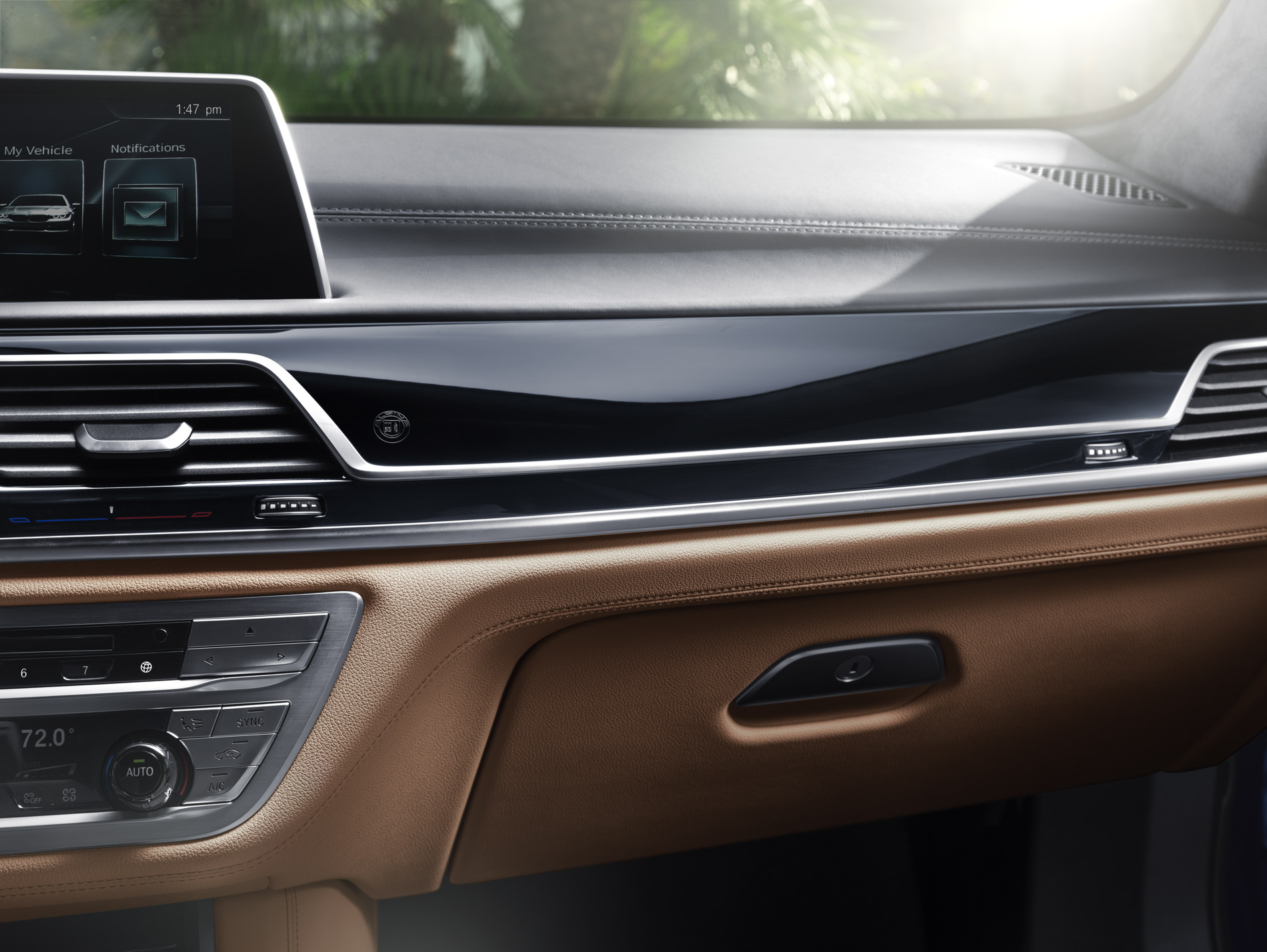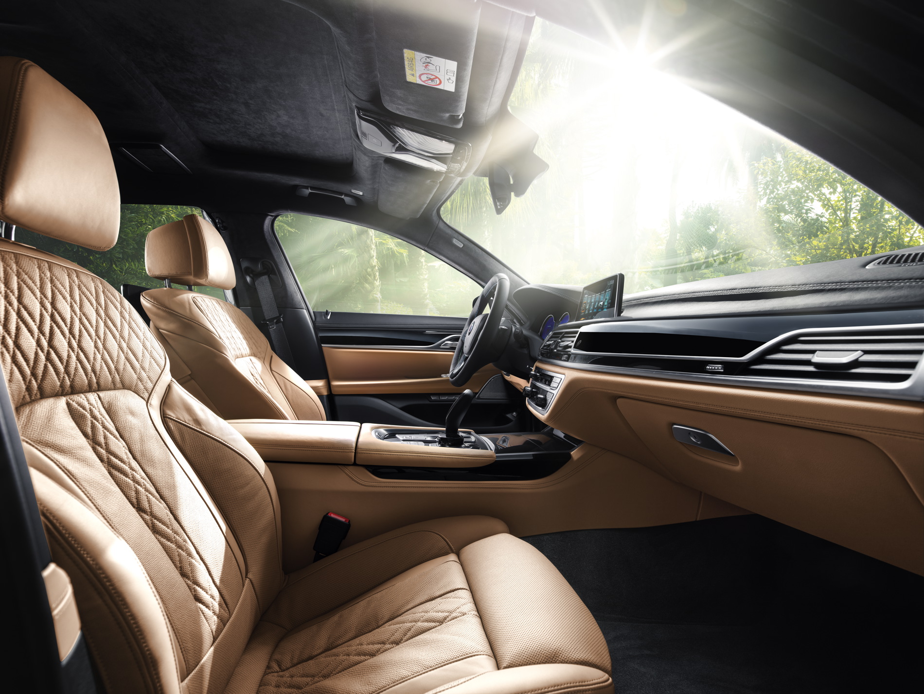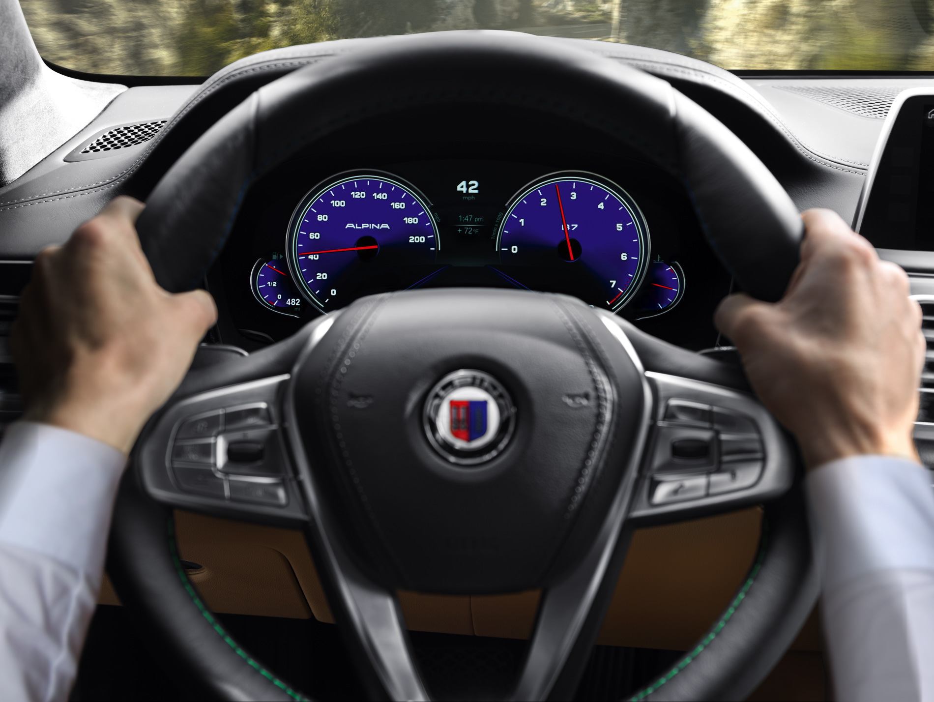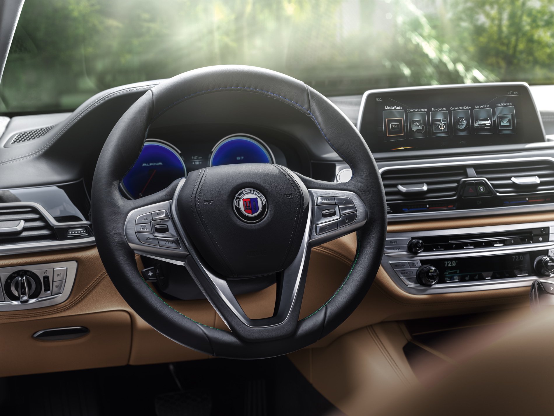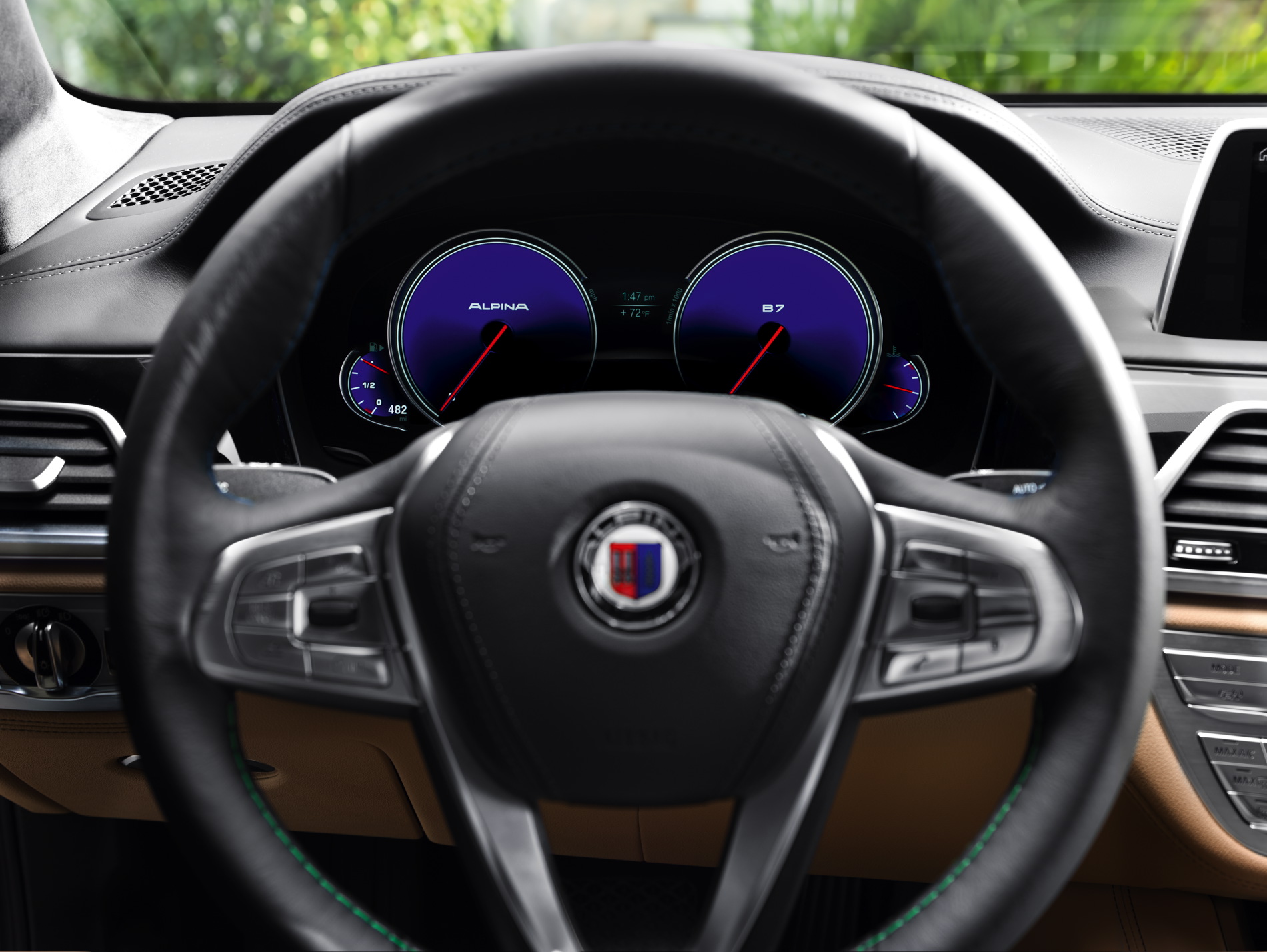 ALPINA details add exclusivity and individual style to the interior. Hand-finished using exceptionally high-quality LAVALINA leather, the sports steering wheel with blue and green stitching is captivating at the very first touch due to its gentle feel. Timeless Piano lacquer or classic Myrtle Luxury Wood – the ALPINA interior trim, door sills with blue illumination, ALPINA B7 model inscriptions and an individual production plaque are further examples of exclusive equipment features in the new BMW ALPINA B7 xDrive.