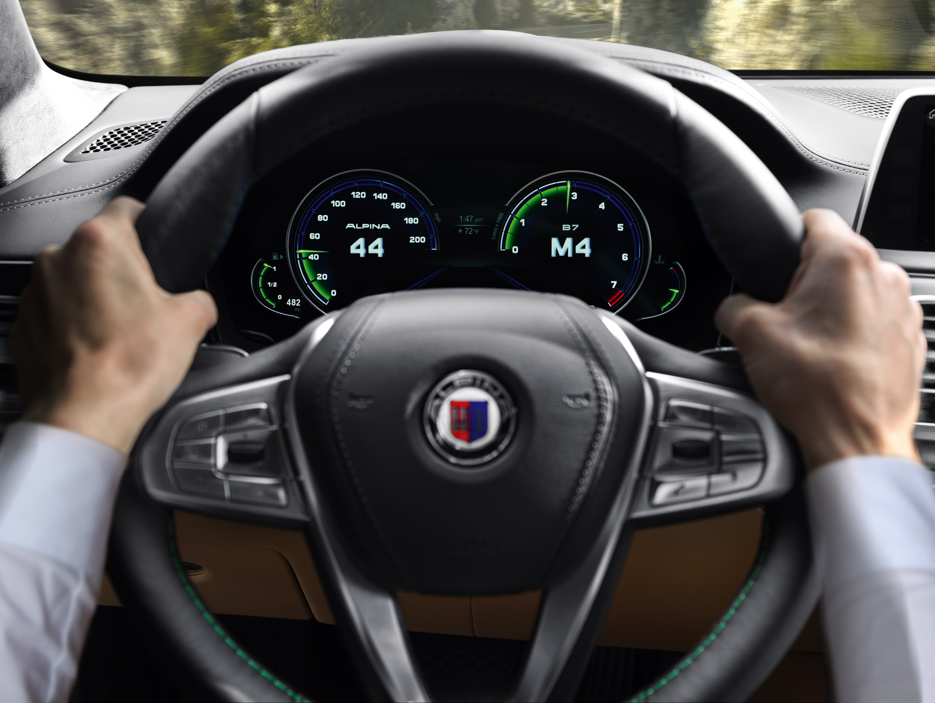 Another exclusive ALPINA design is the full-color digital instrument panel in LED technology. In Comfort Mode it offers a classic look featuring round instruments with blue background and red needles. In Sport Mode the display changes to a more dynamic design with blue and green drag indicators and a focus on primary information, such as the centrally positioned permanent digital speed read-out.