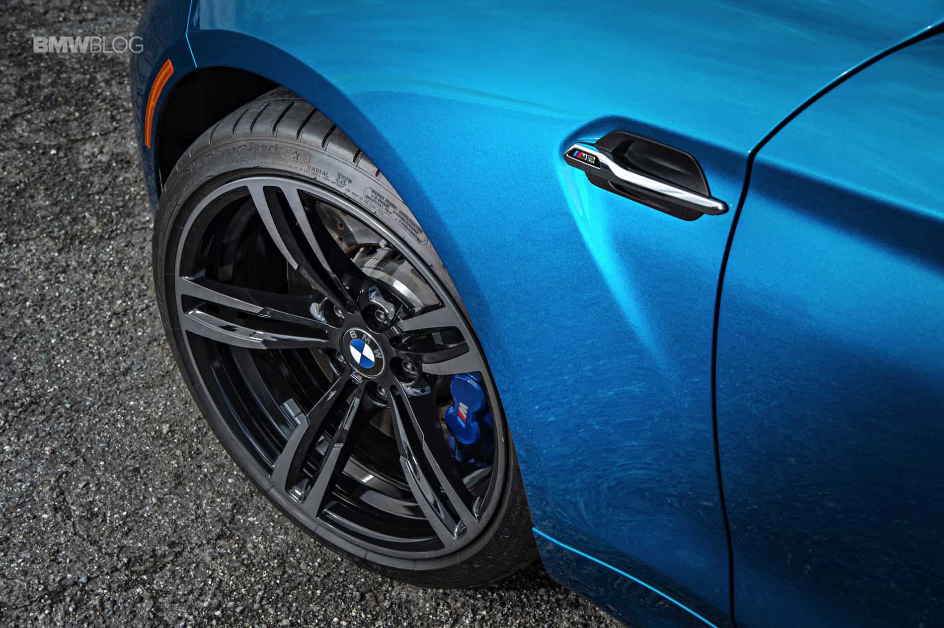 The M2s we drove were wearing racing brake pads and they felt amazing, with tons of bite and zero fade throughout both track and street driving. The M2 features four-pots at the front with 380mm discs and two-piston calipers at the rear with 370mm discs. M2-specifically designed 245 and 265 Michelin Pilot Super Sport tires are fitted to 19-inch wheels. The PSS tires are custom made for the M2 and BMW engineers said the front pair focuses on turn in and the rears on linear traction. A star on the tires it indicates that they have been tested on the BMW car.