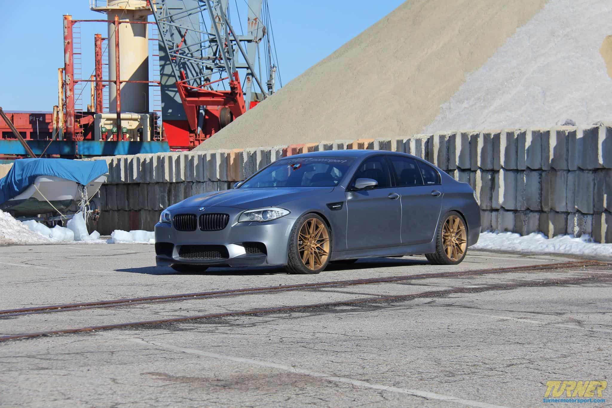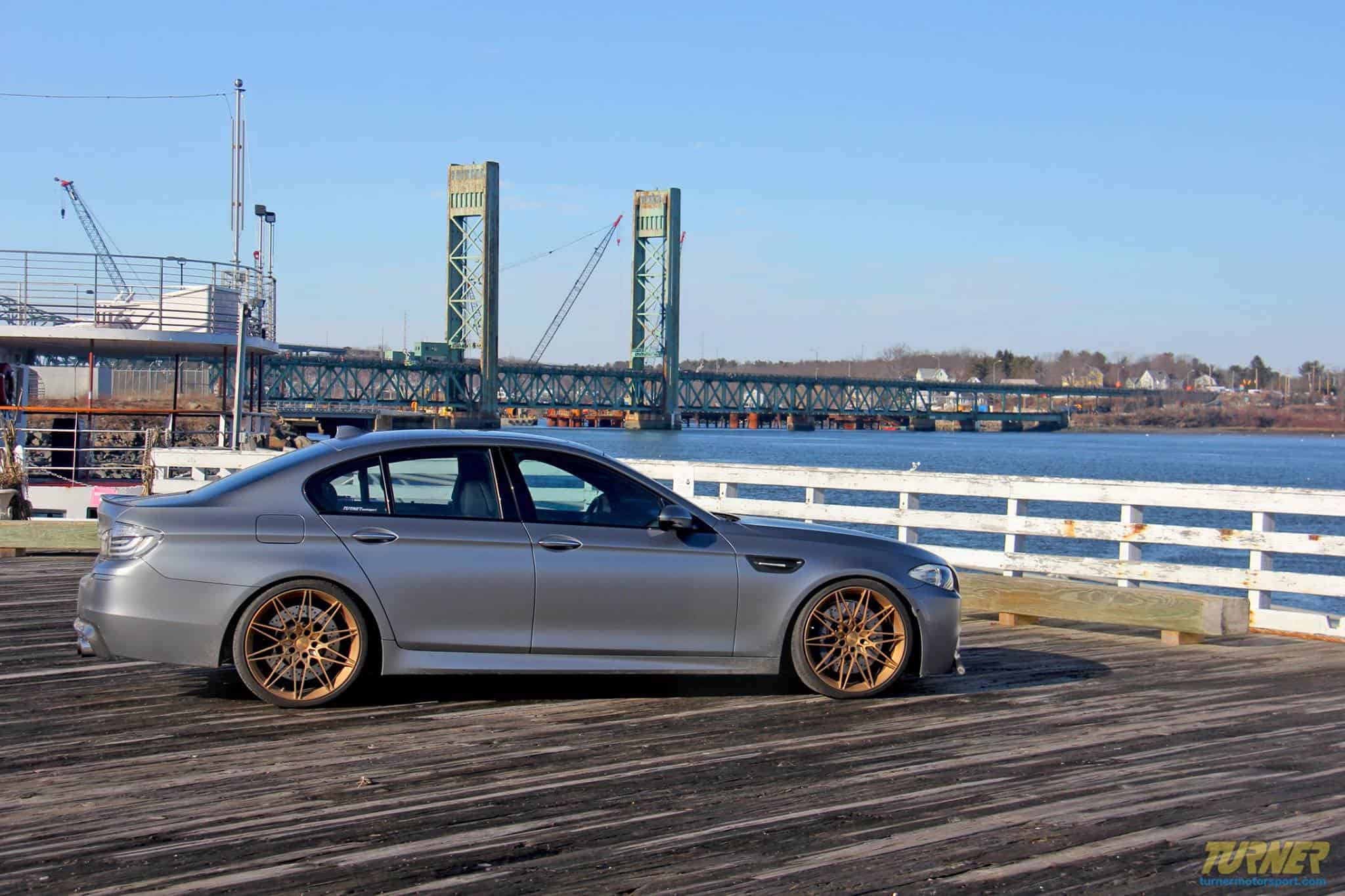 Turner Motorsport gives their BMW M5 project a new visual upgrade. The folks at Turner installed a set of custom Forgeline MT1 Monoblock Wheels in Matte Gold Powder coat on the Frozen Grey F10 M5. The MT1 features a ten spoke mesh design, unique deeply-cut diamonds machined into the base of each spoke around the center of the wheel, deep concave profile, and radically-chamfered outer edge.