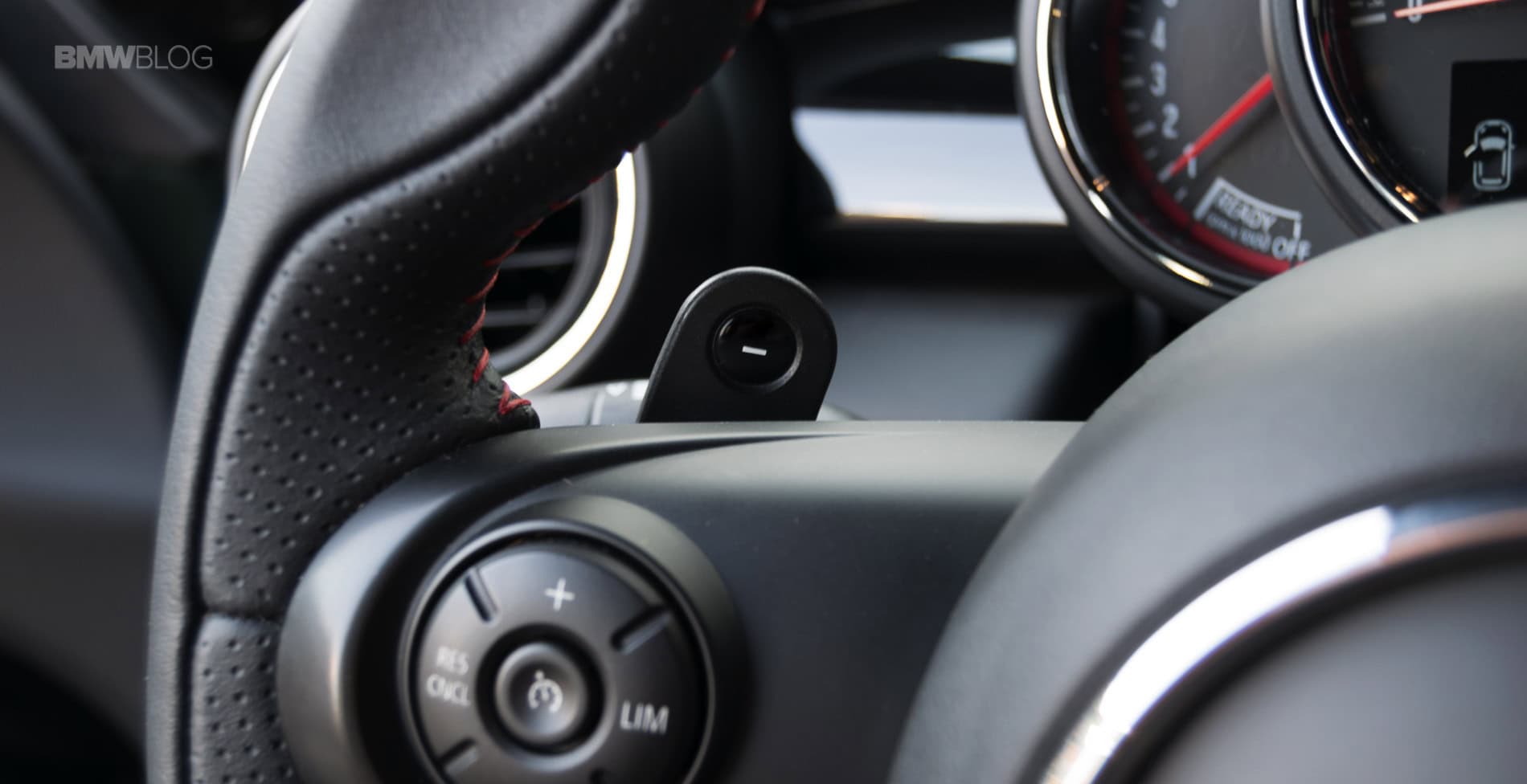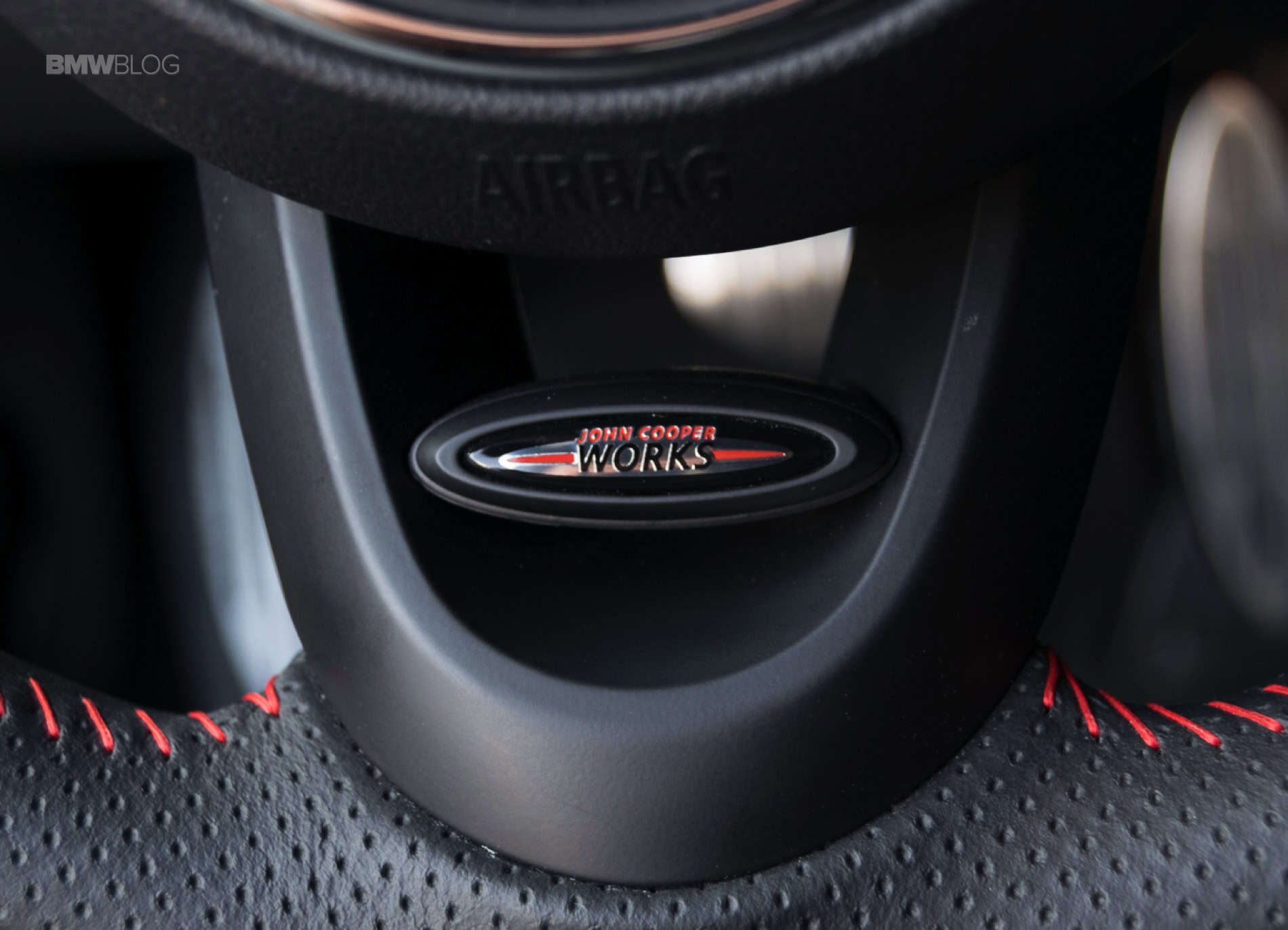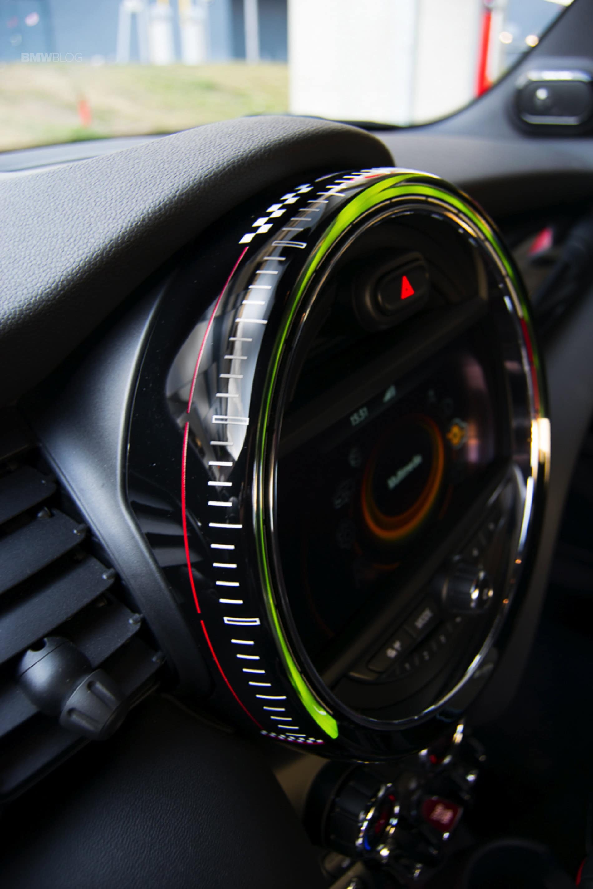Another such example is the center infotainment screen that is surrounded by the new LED lights you can find on all MINIs with a twist. Its outer shell is now featuring the same design as the speedometer, with strips and a checkered flag motif on the right side. On top of it sits the JCW badge.
