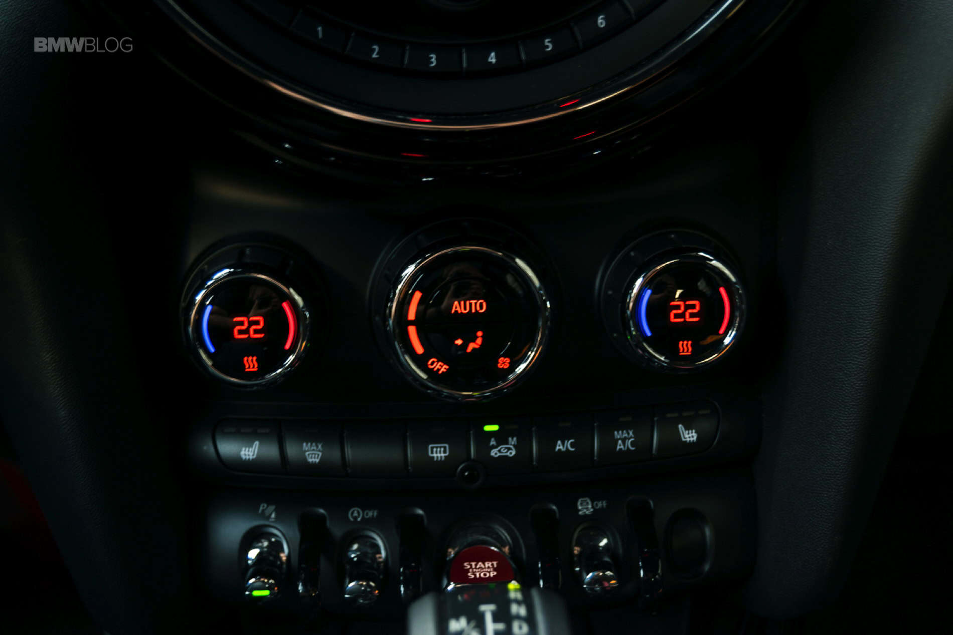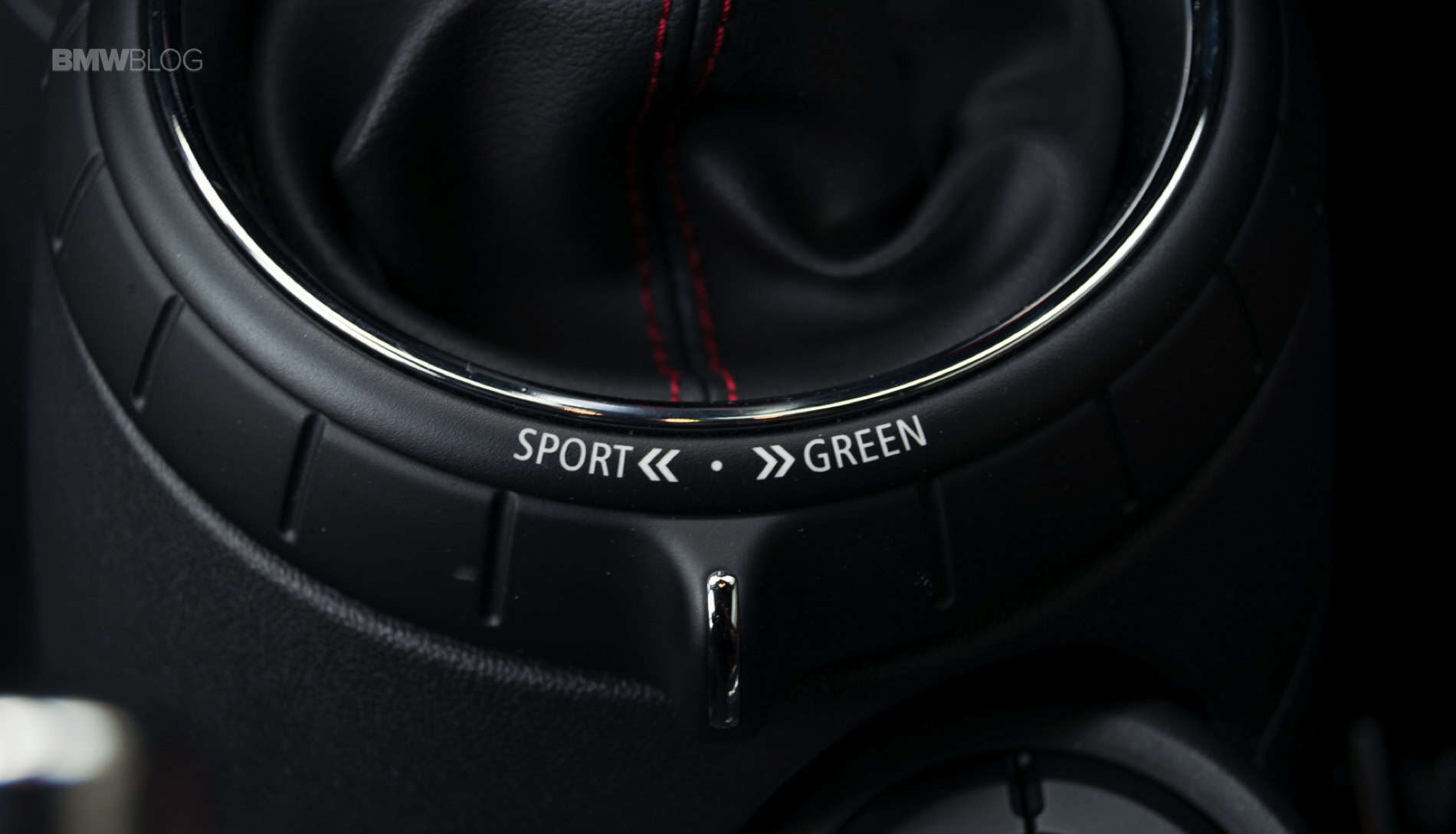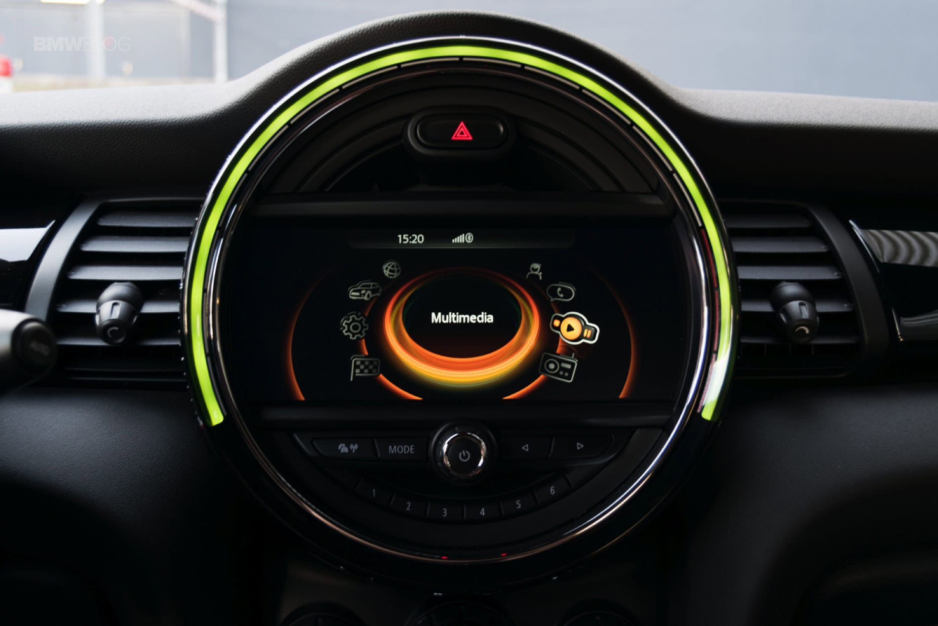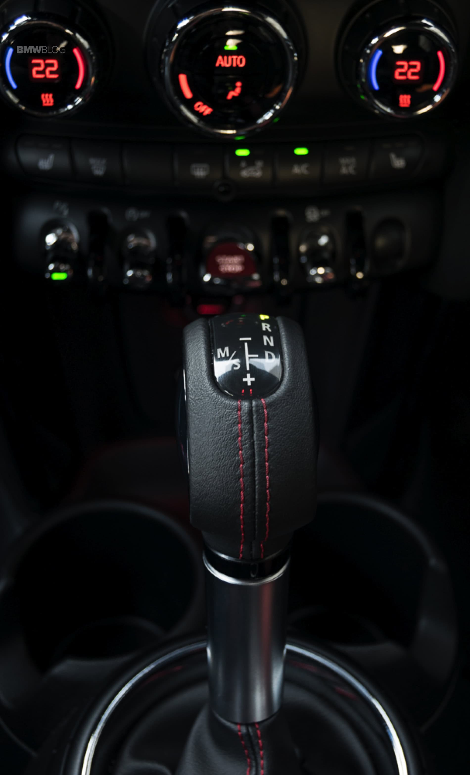 Another such example is the center infotainment screen that is surrounded by the new LED lights you can find on all MINIs with a twist. Its outer shell is now featuring the same design as the speedometer, with strips and a checkered flag motif on the right side. On top of it sits the JCW badge.