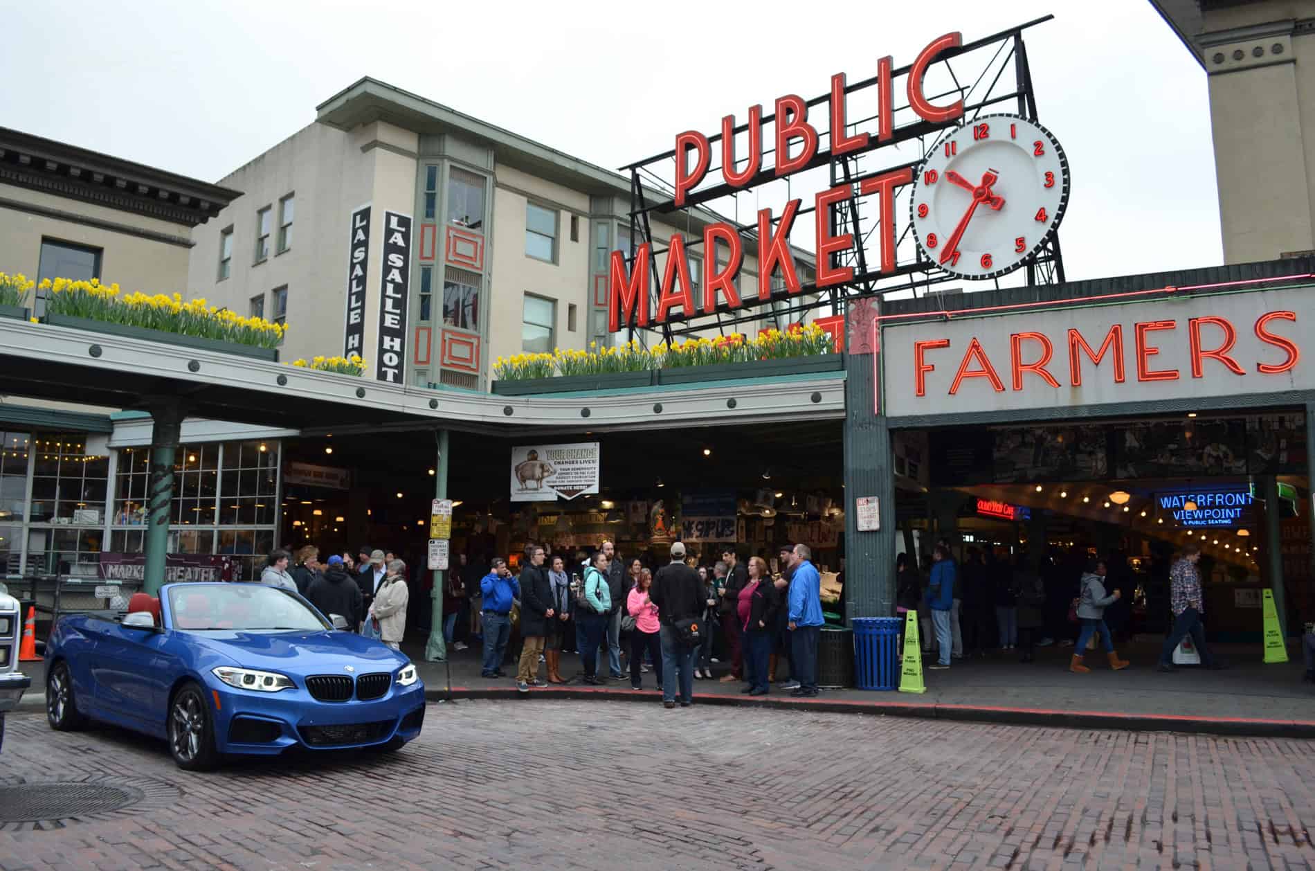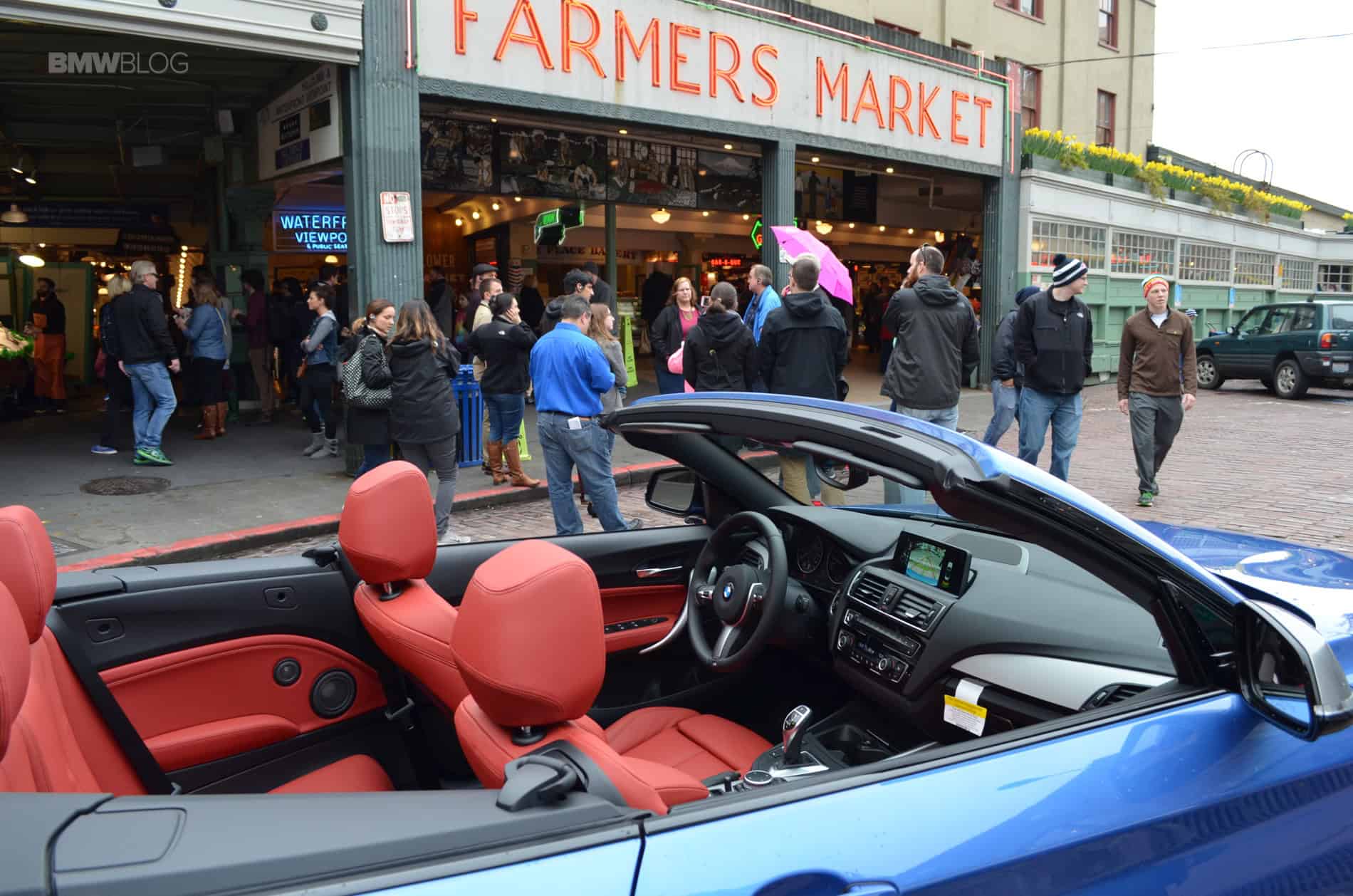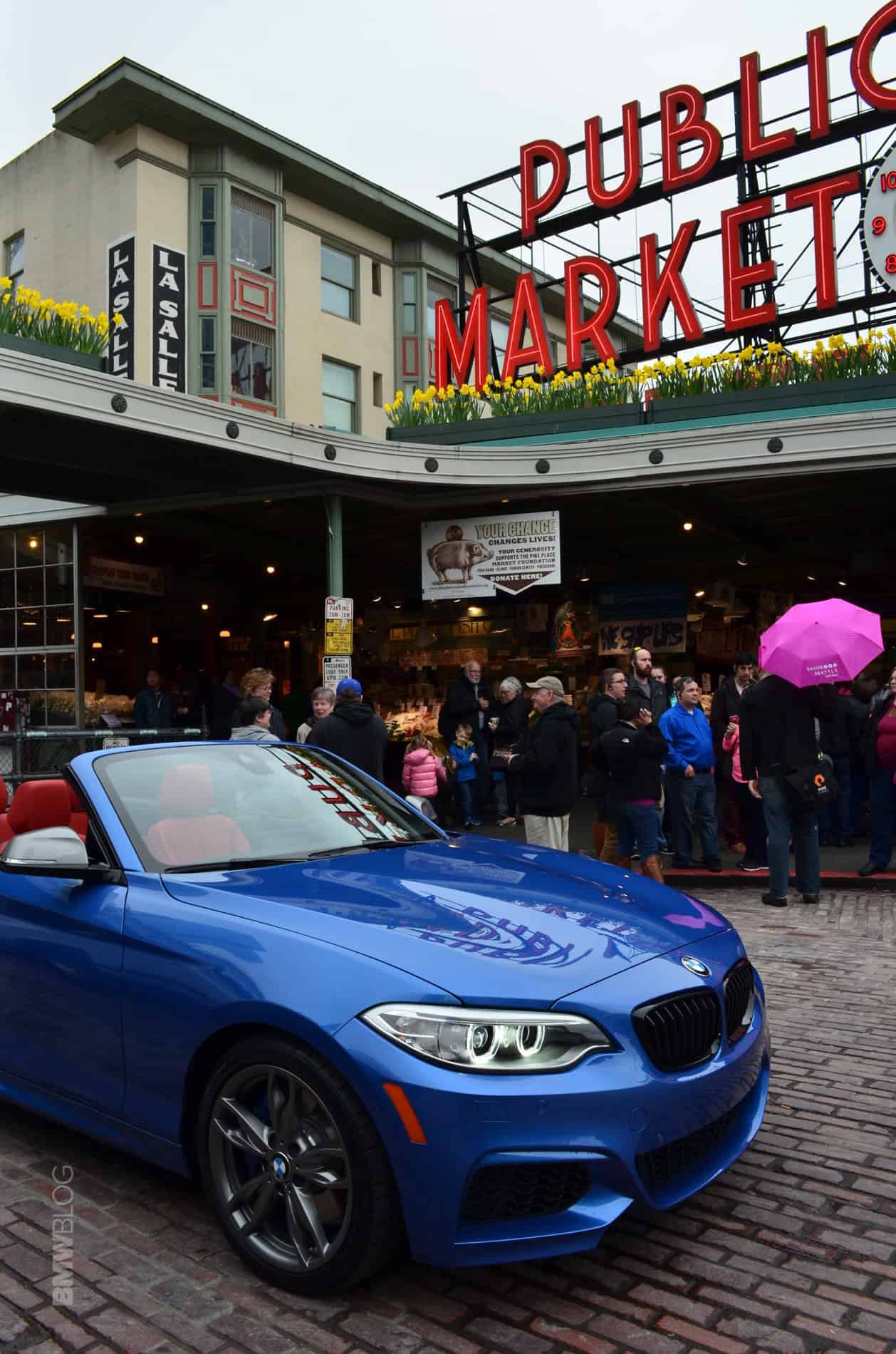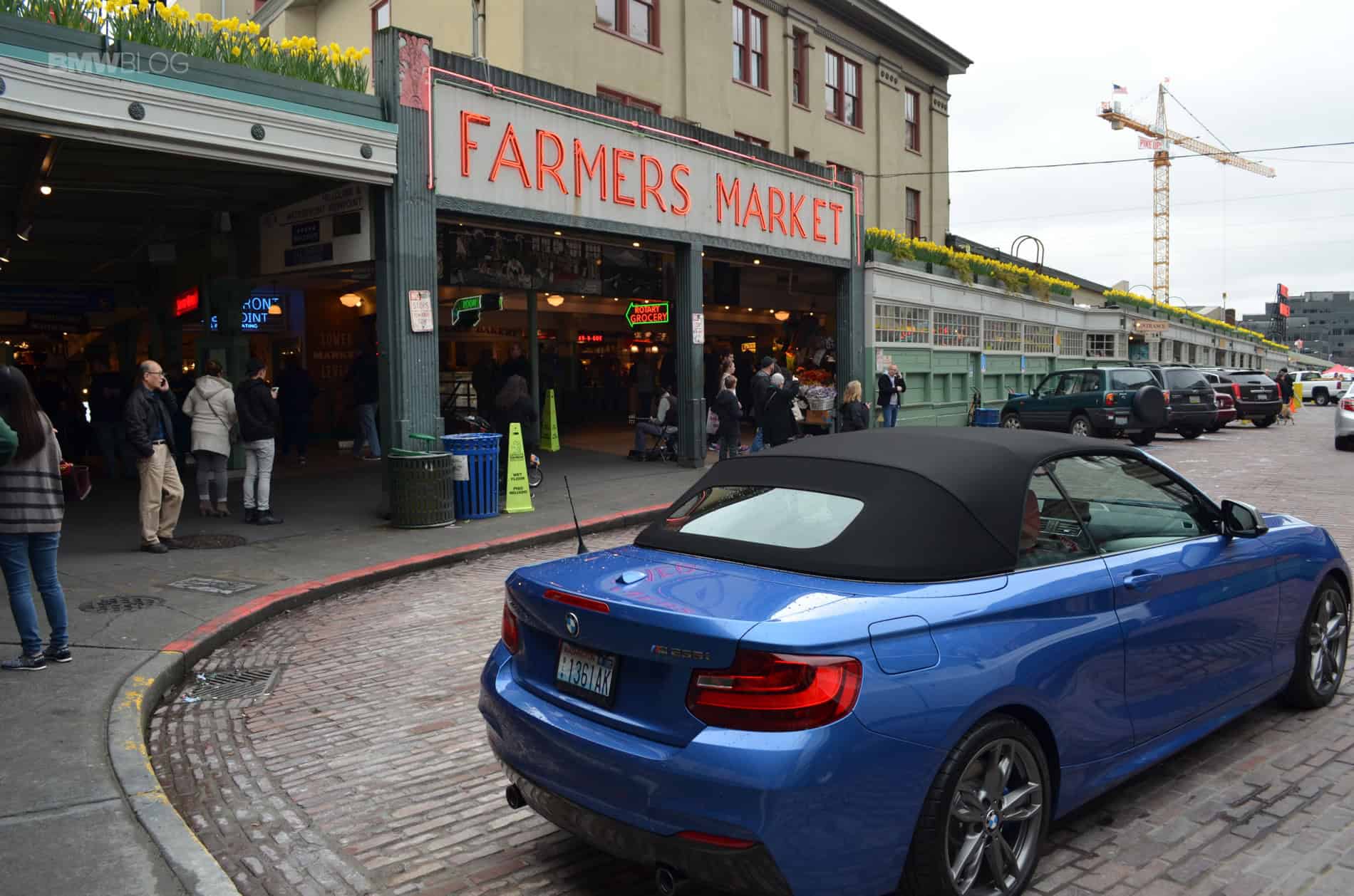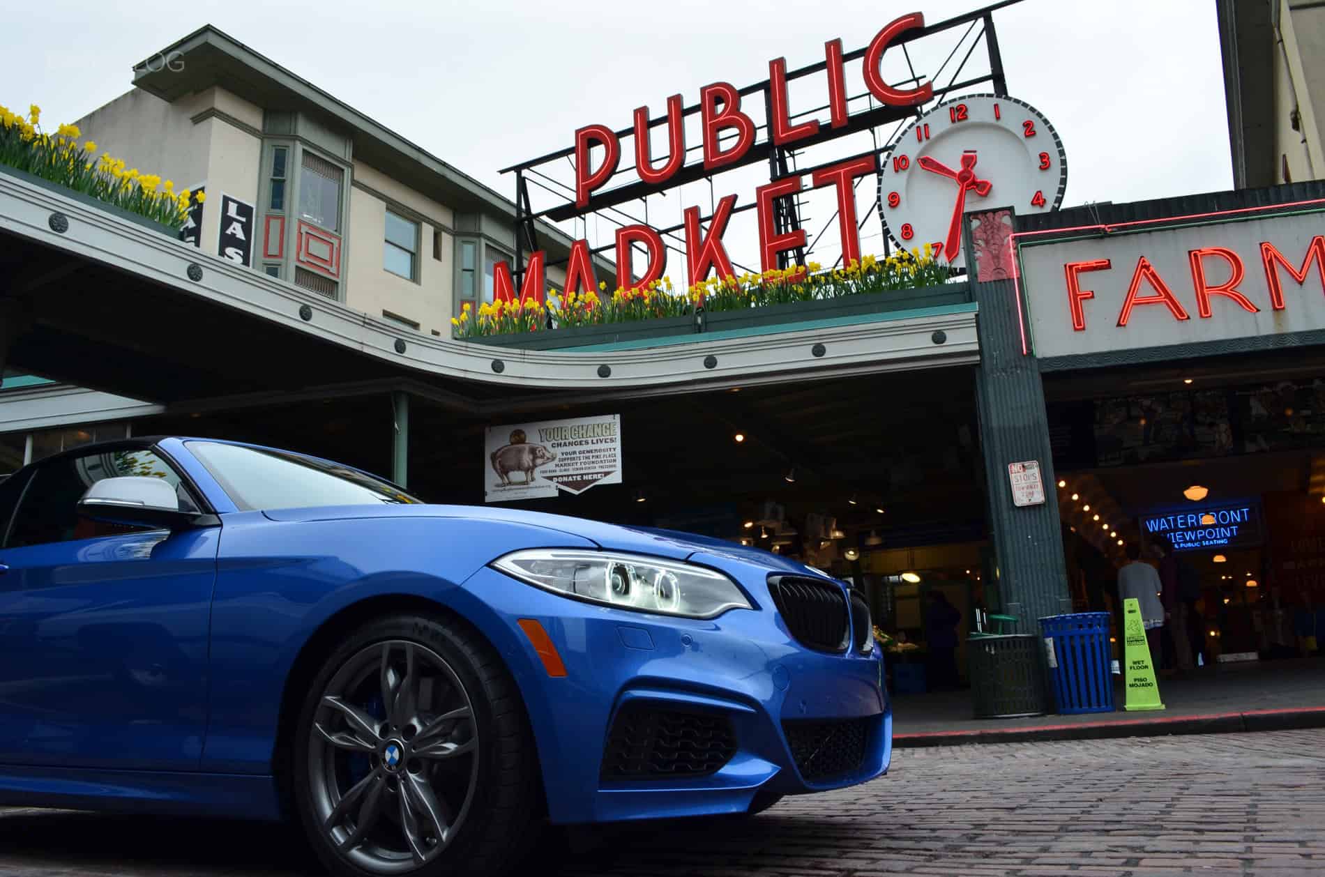 Before I head back to BMW Seattle I decide to stop by the historical Pike Place Market. There I know I’ll find lots of people and lots of shops and hopefully a good parking spot for another photo session. Once I arrive I spot a prime parking area right next to the iconic Public Market Center. I step out of the car and cross the crowded street to take some distance shots, but this turns out to be more difficult than it sounds. As it were, everyone wants to take a picture by the sign, holding a Starbucks coffee, sitting next to and posing with a brand new BMW M235i equipped in Superman livery.