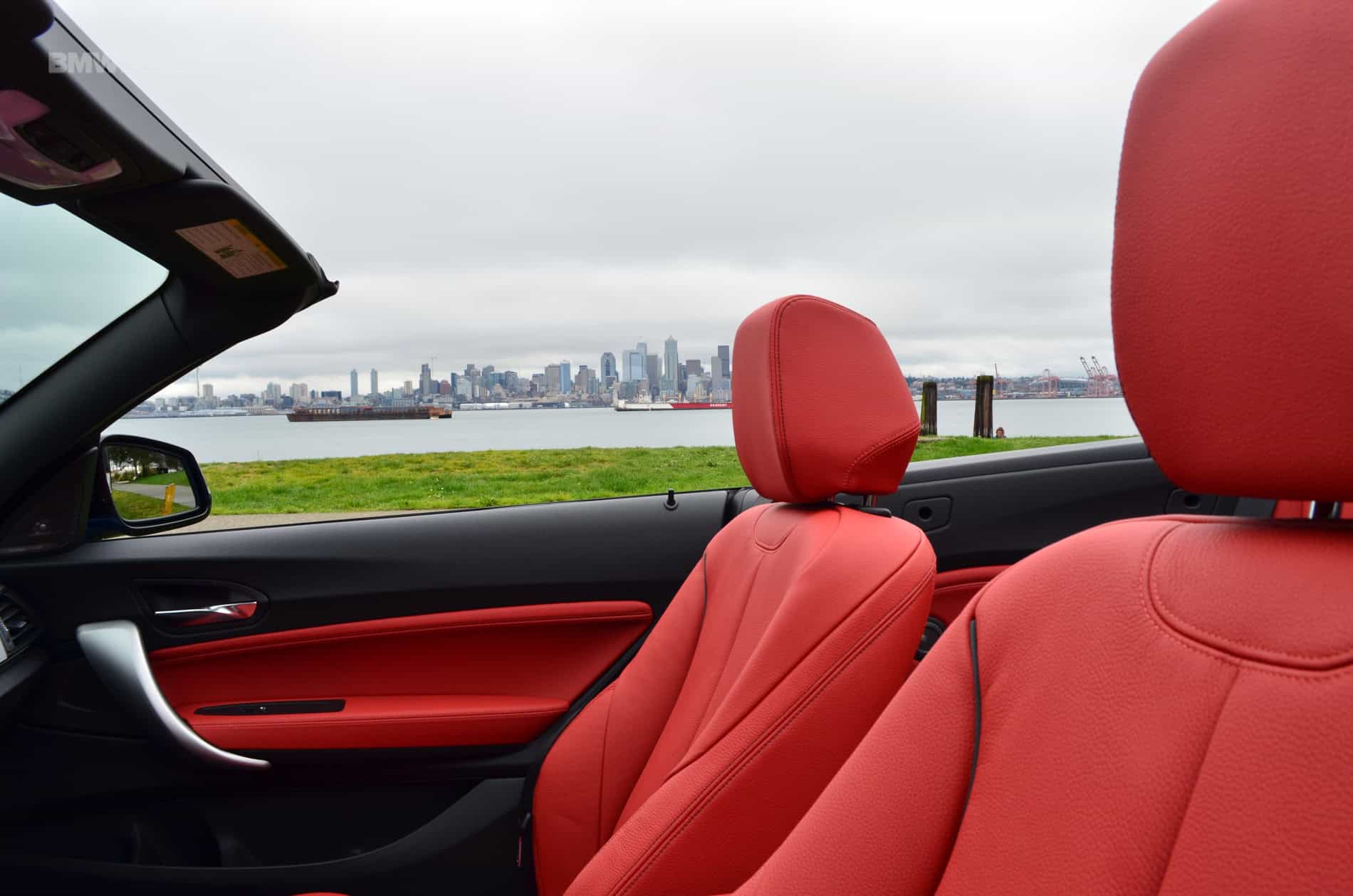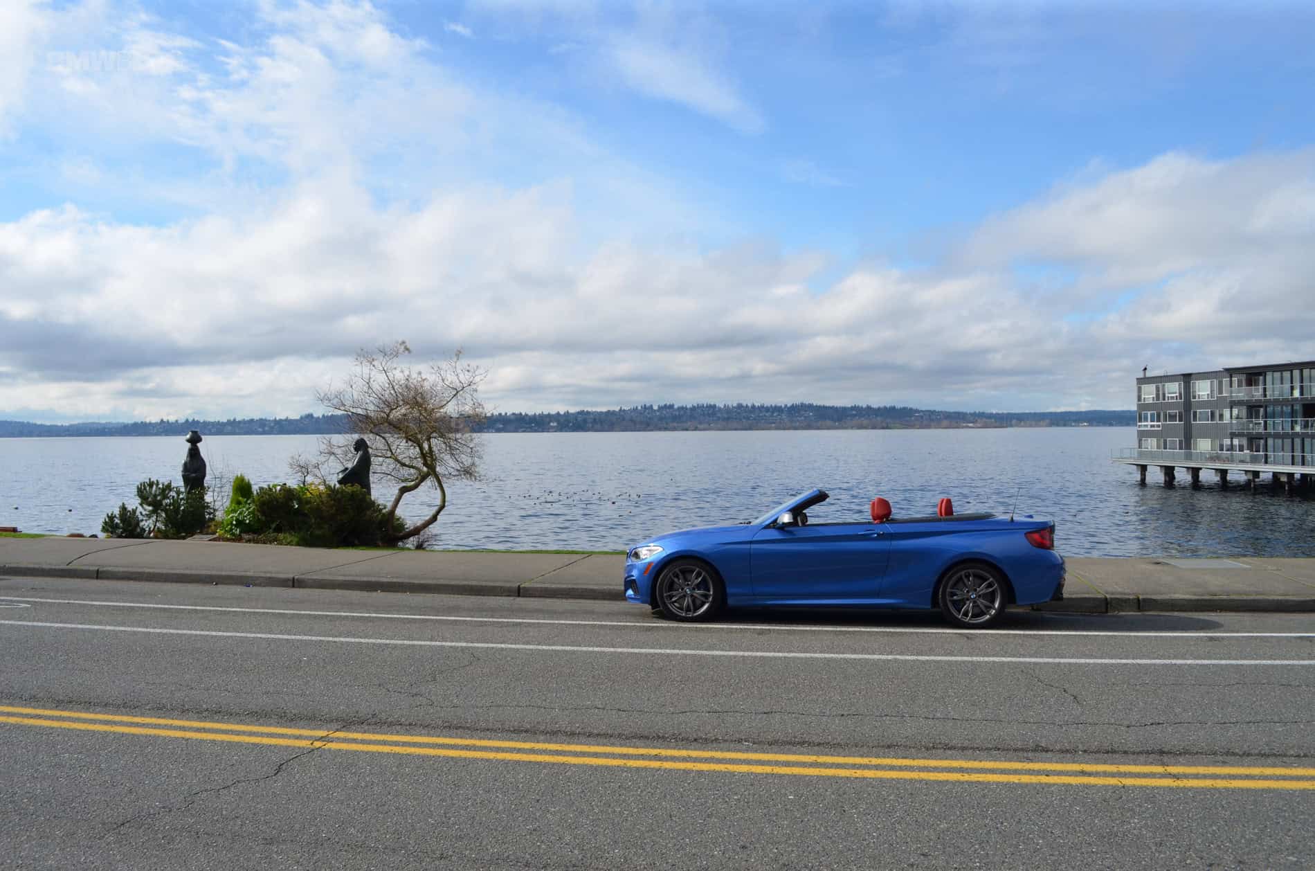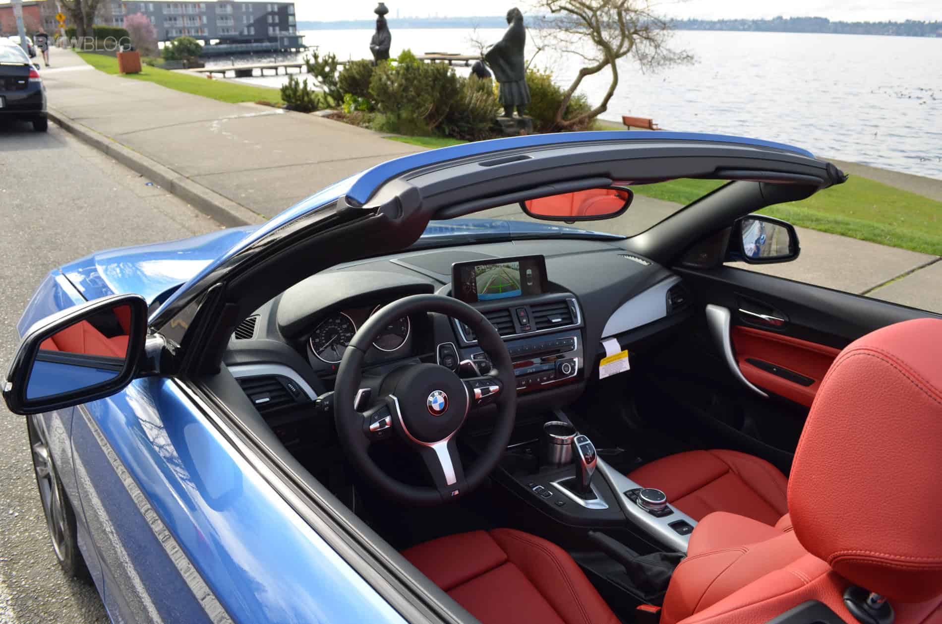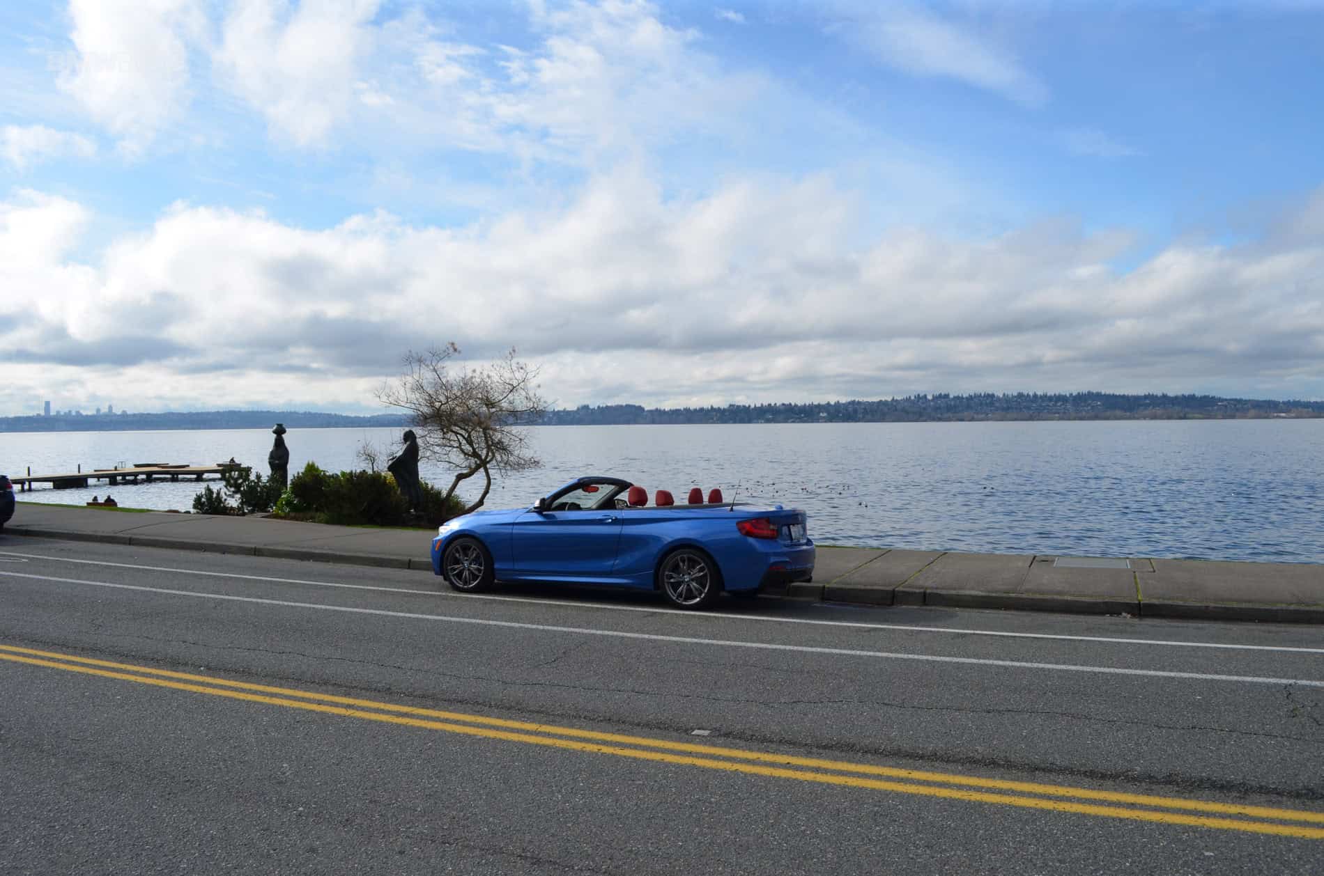 I realize I made good time driving into Kirkland, so I decide to park the car by the waterfront and take some additional photos with the Superman M235i using Lake Washington as the backdrop. Lucky for me, the sun decided to make an appearance and so I dropped the top and revealed its red interior to the world. What a contrast. Punchy blue exterior, brick red interior, black and silver bits to complement the rest of the cabin. I shouldn’t like this color combo. I’m a pretty conservative guy. My last 3 BMWs all had black interiors, aluminum trim and were, in order, Steel Blue, Steel Grey and Space Grey Metallic.
