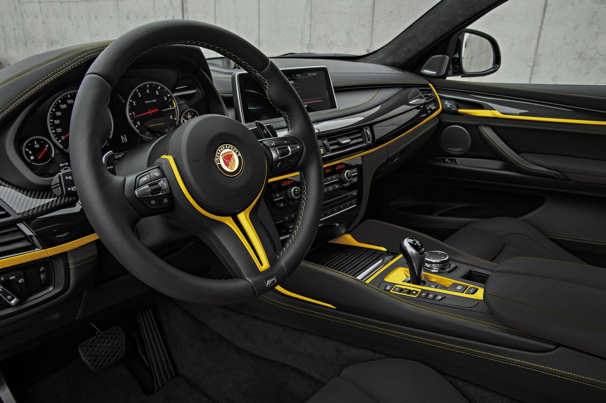 Inside, the tuning shop added yellow stitching and yellow-painted pieces of trim on the center console, the steering wheel and dashboard. The Manhart logo was also embossed on headrests.