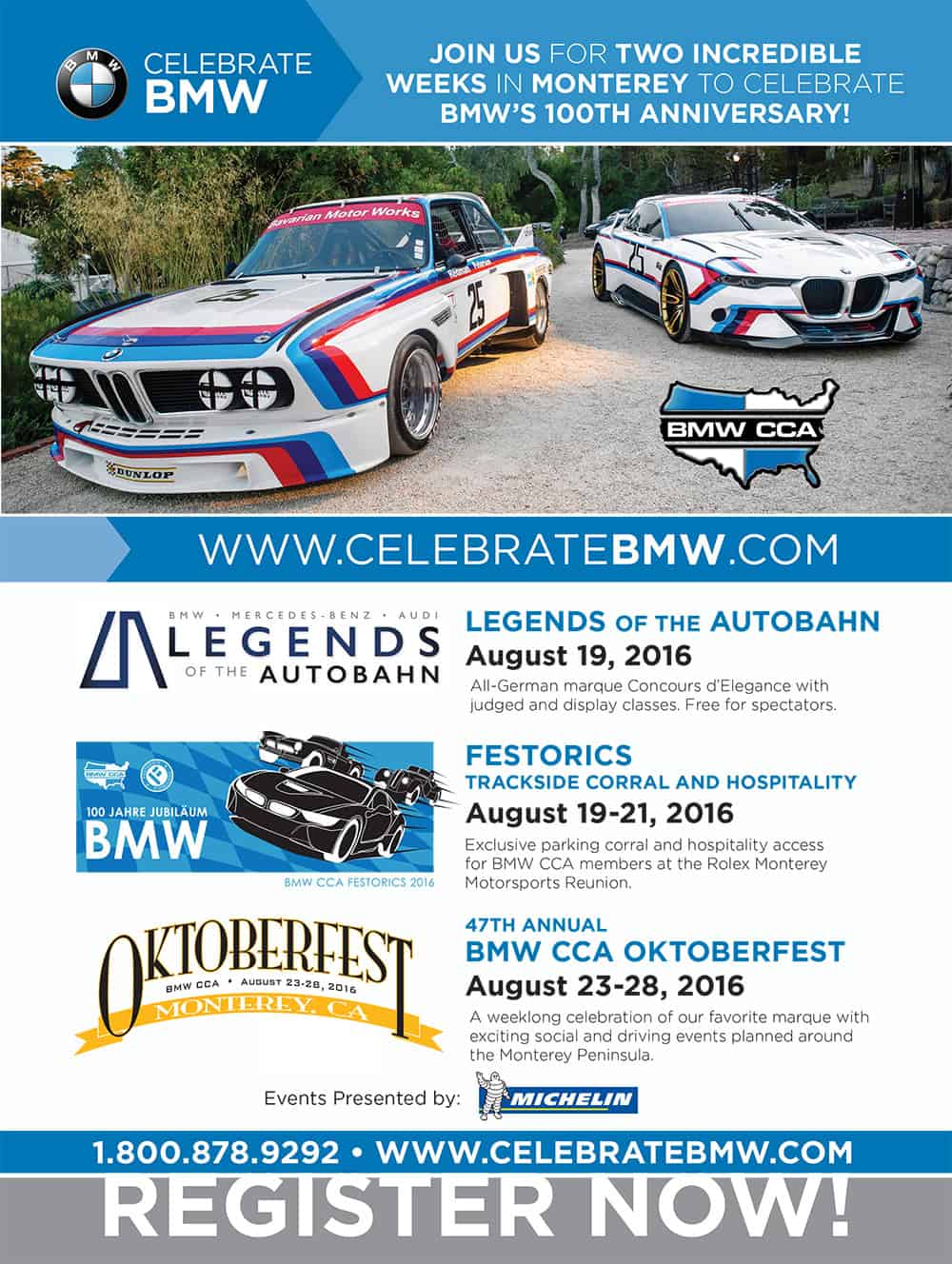 The BMW car and motorcycle clubs of America are joining together for what will be the largest celebration of BMW’s 100th anniversary in the United States this August 19-28 in Monterey, California. Legends of the Autobahn will be held on August 19, the Festorics trackside corral and hospitality on August 19–21, and the 47th Annual BMW CCA Oktoberfest from August 23–28. All three events will combine to form what is being called “Celebrate BMW,” a celebration of 100 years of BMW. And each of the three enthusiast events are presented by Michelin, whose tires are featured on every BMW M series car platform from the 2 Series through the 6 Series.