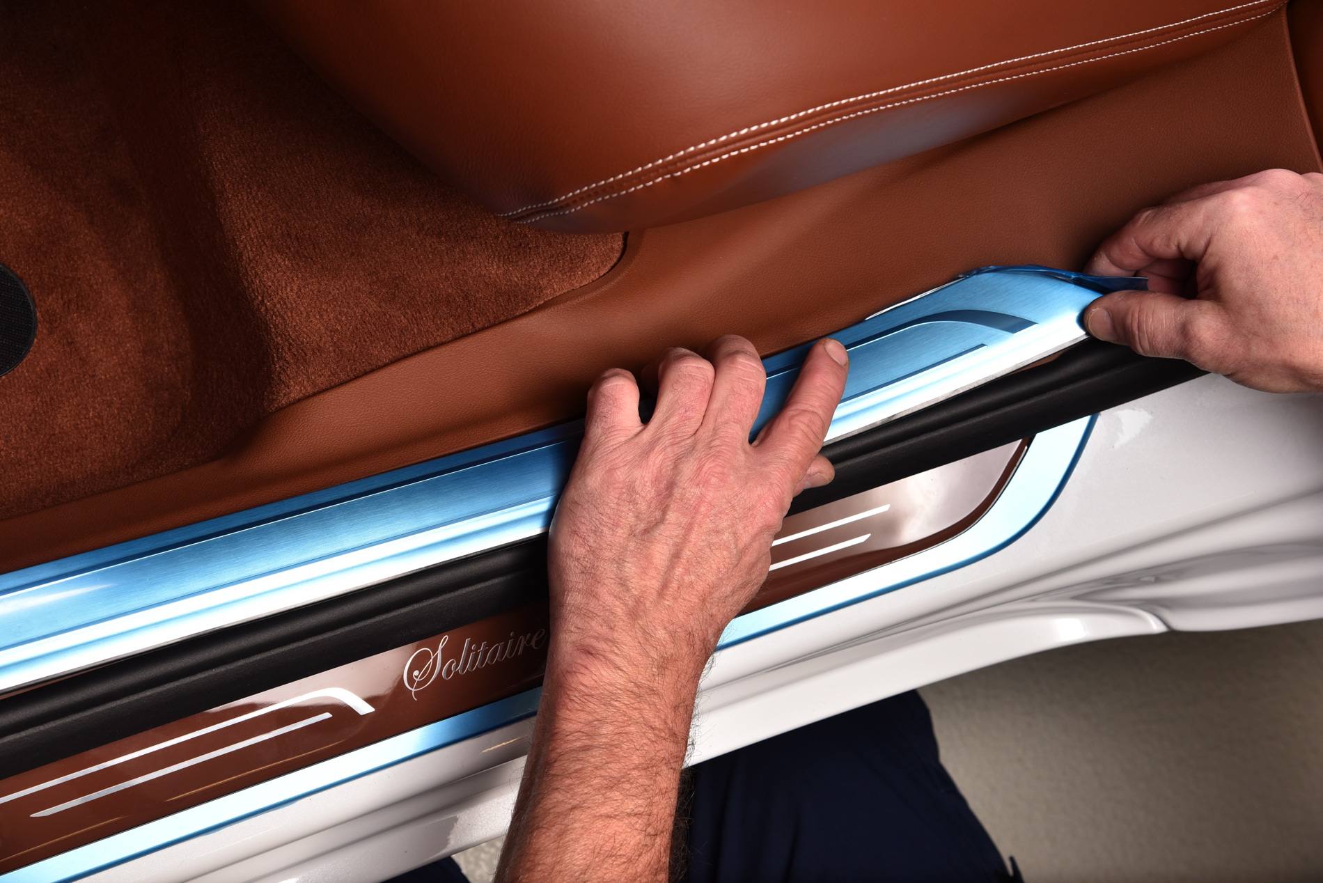 On the exterior, the two exclusive special colors, BMW Individual Metallic Black Gold and BMW Individual Metallic Solitaire White, underscore the expressive design language of the new BMW 7 Series. These colors can only be applied incorporating an extremely complex method, by which fine glass flakes are embedded into one of the final layers of paint, resulting in a particularly pronounced deep gloss. A chrome plaque located on the C pillar of all seven models and bearing the “Solitaire” lettering, as well as a decorative rear trim sporting the name of the edition, provide discreet indication of the vehicle’s uniqueness.