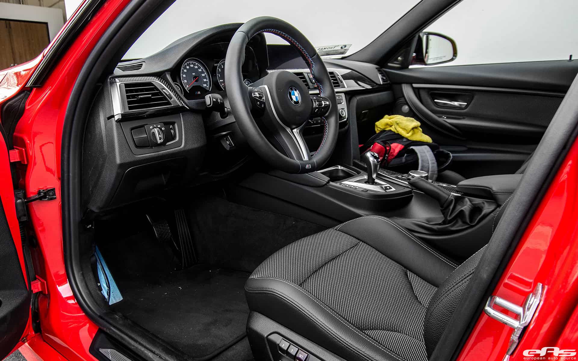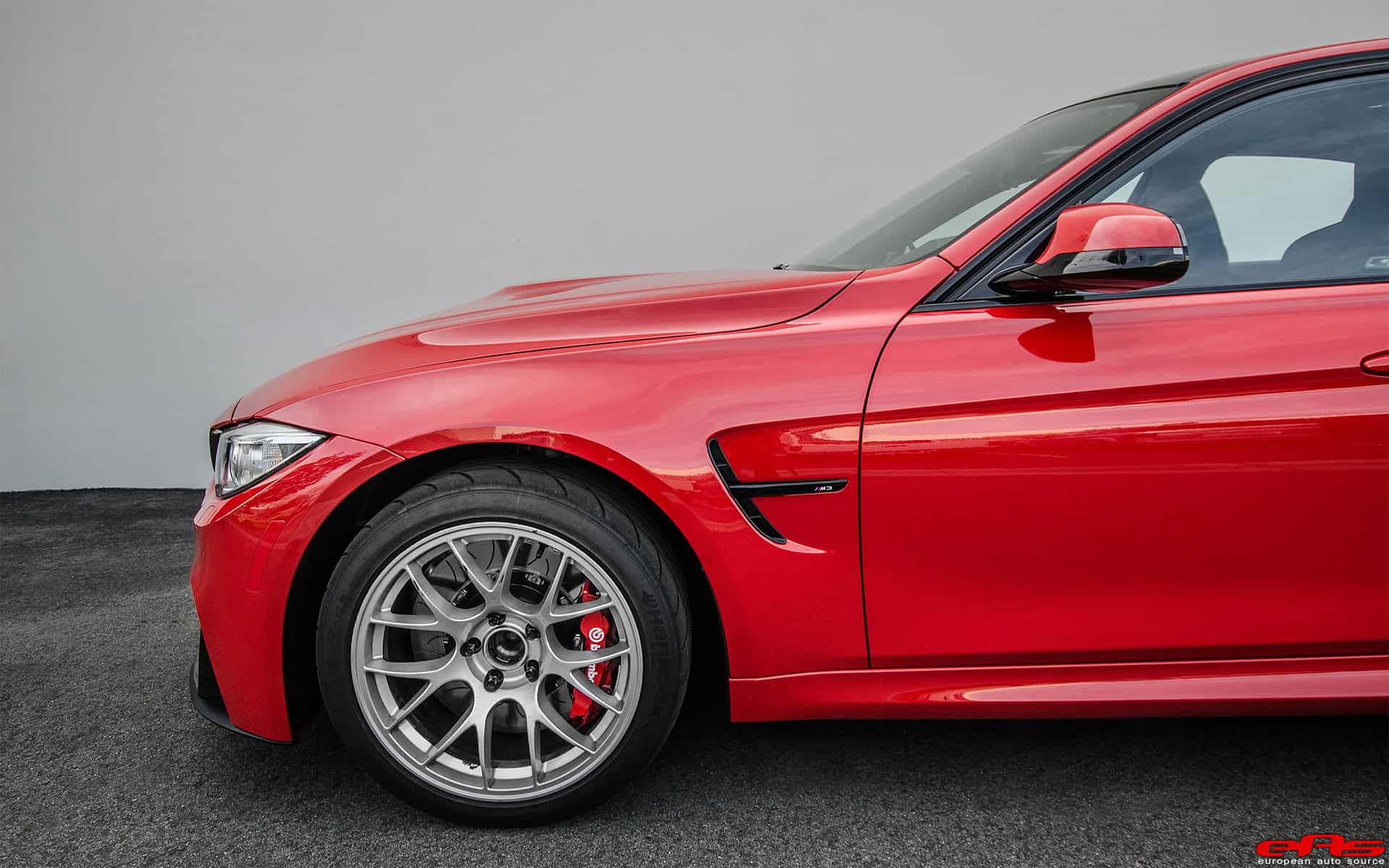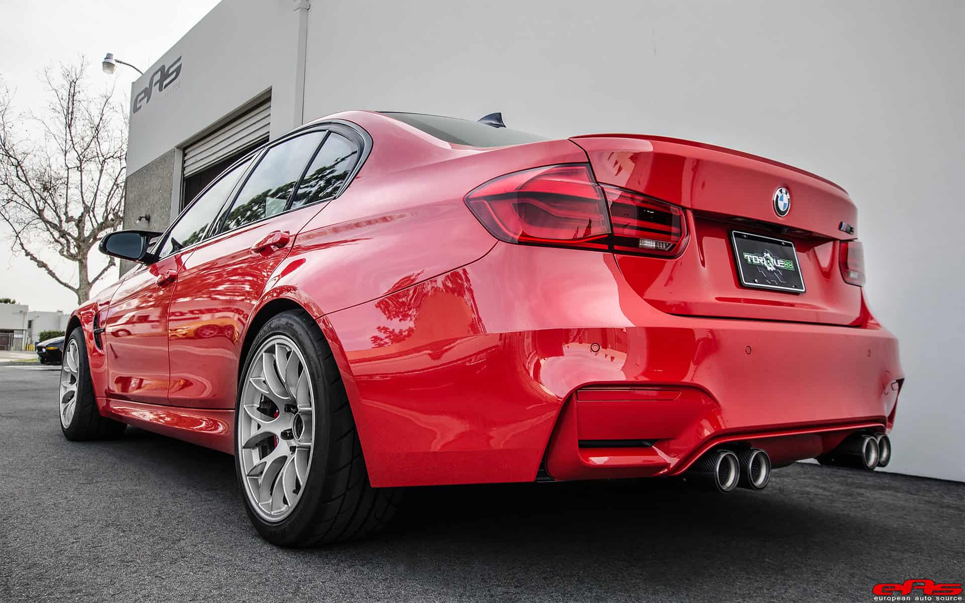This BMW M3 comes with the standard 3.0 Liter BMW TwinPower Turbo engine delivering 425 horsepower. The power output allows the red beast to travel from 0-62mph (0-100km/h) in just 4.1 seconds and reach a top speed of 155mph (250km/h). This M3 comes with Eisenmann downpipes and an M Performance exhaust yielding more power, better throttle response and a throatier sound overall.