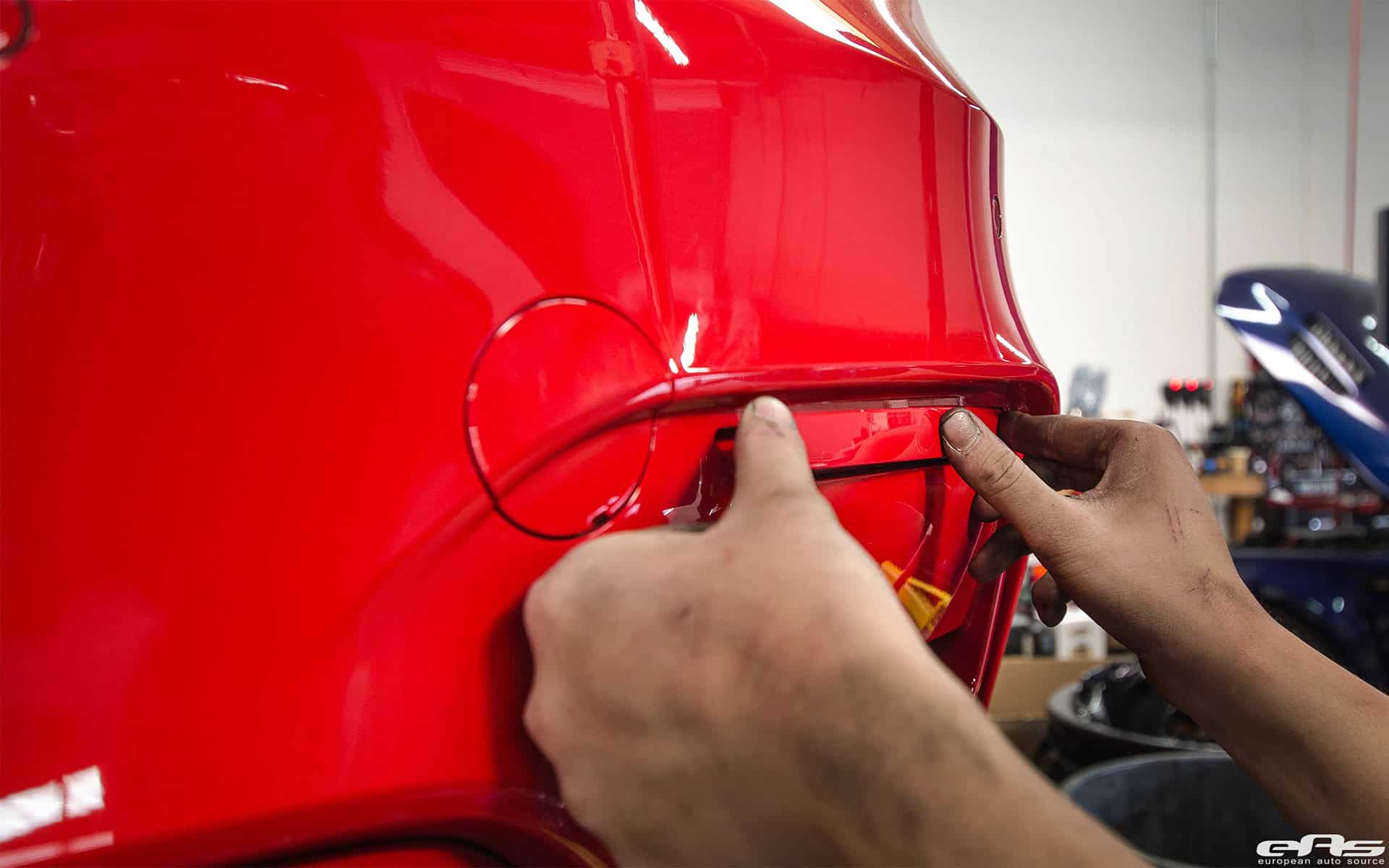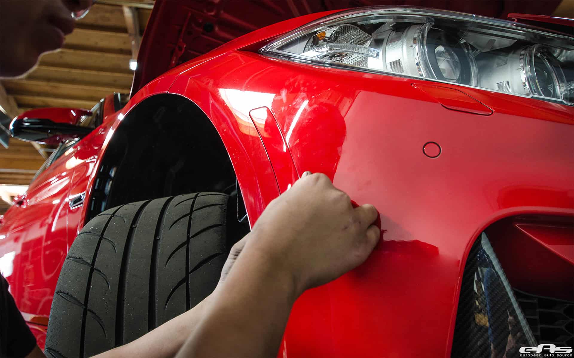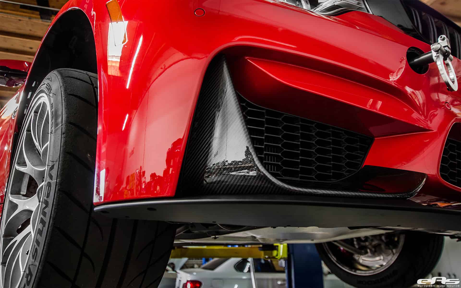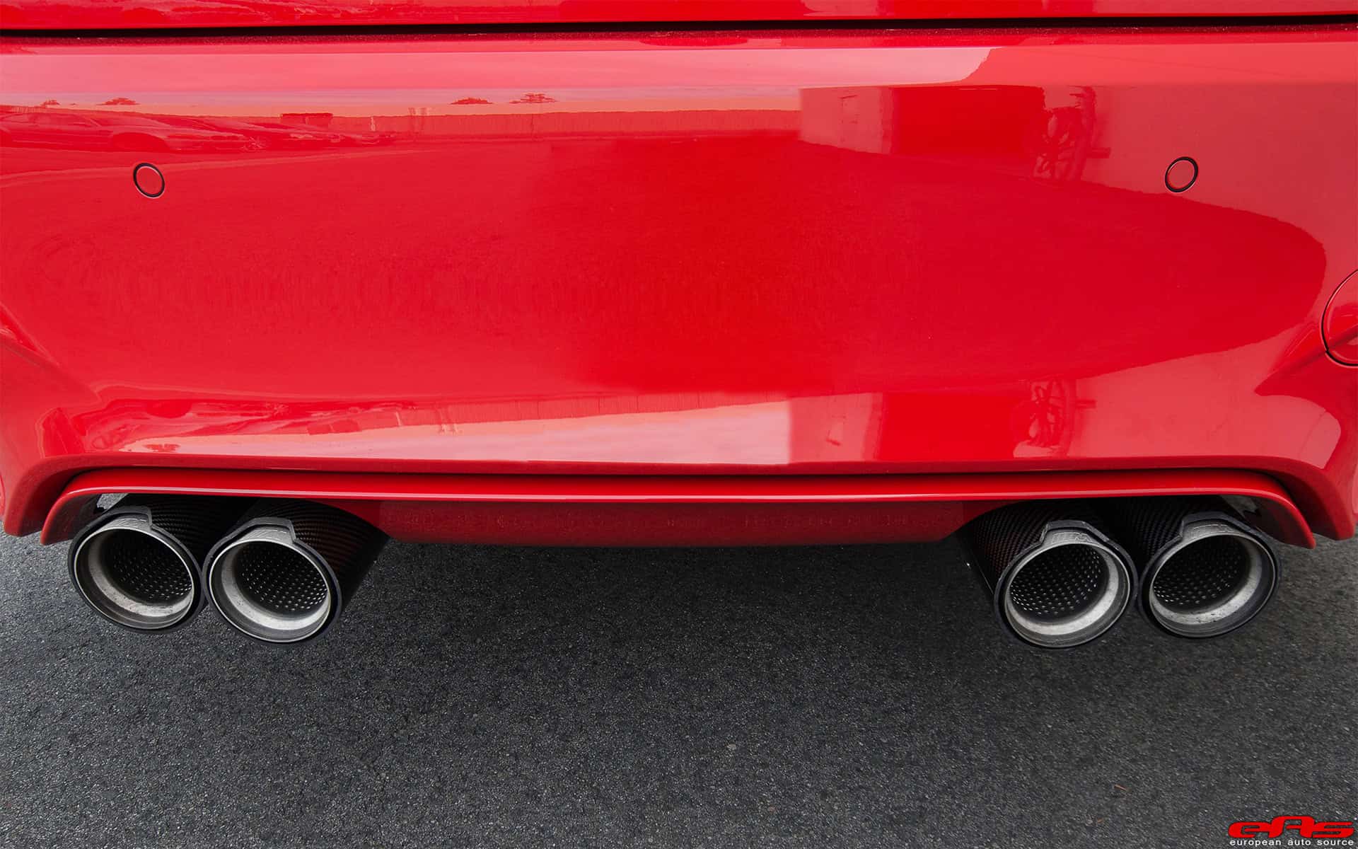 But the special red color was just the beginning of this exciting tuning project. Working with the folks at European Auto Source, the owner of this M3 gave his car a carbon fiber makeover. The M Performance carbon fiber splitters with a front lip were installed on the front fascia before a set of iND painted kidney grilles combined with painted side markers, painted front reflectors, painted rear reflectors and the painted trunk badge were also added to the car.