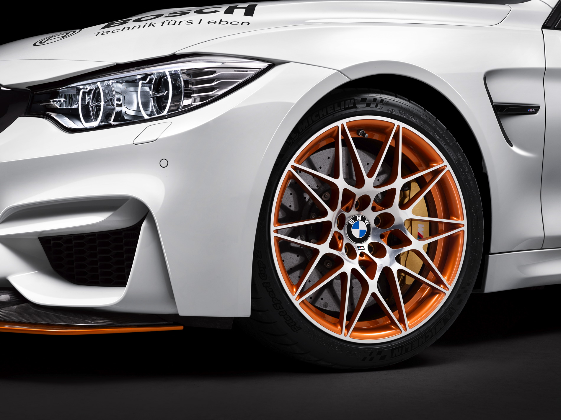 The Michelin Pilot Sport Cup 2 tires in the sizes 265/35 R19 at the front and 285/30 R20 at the rear, which come as standard and were specifically designed for the BMW M4 GTS, contribute to the car’s outstanding handling characteristics. They are mounted on weight-optimised, forged and burnished M light alloy wheels in Acid Orange and feature an exclusive 666 M star spoke styling.