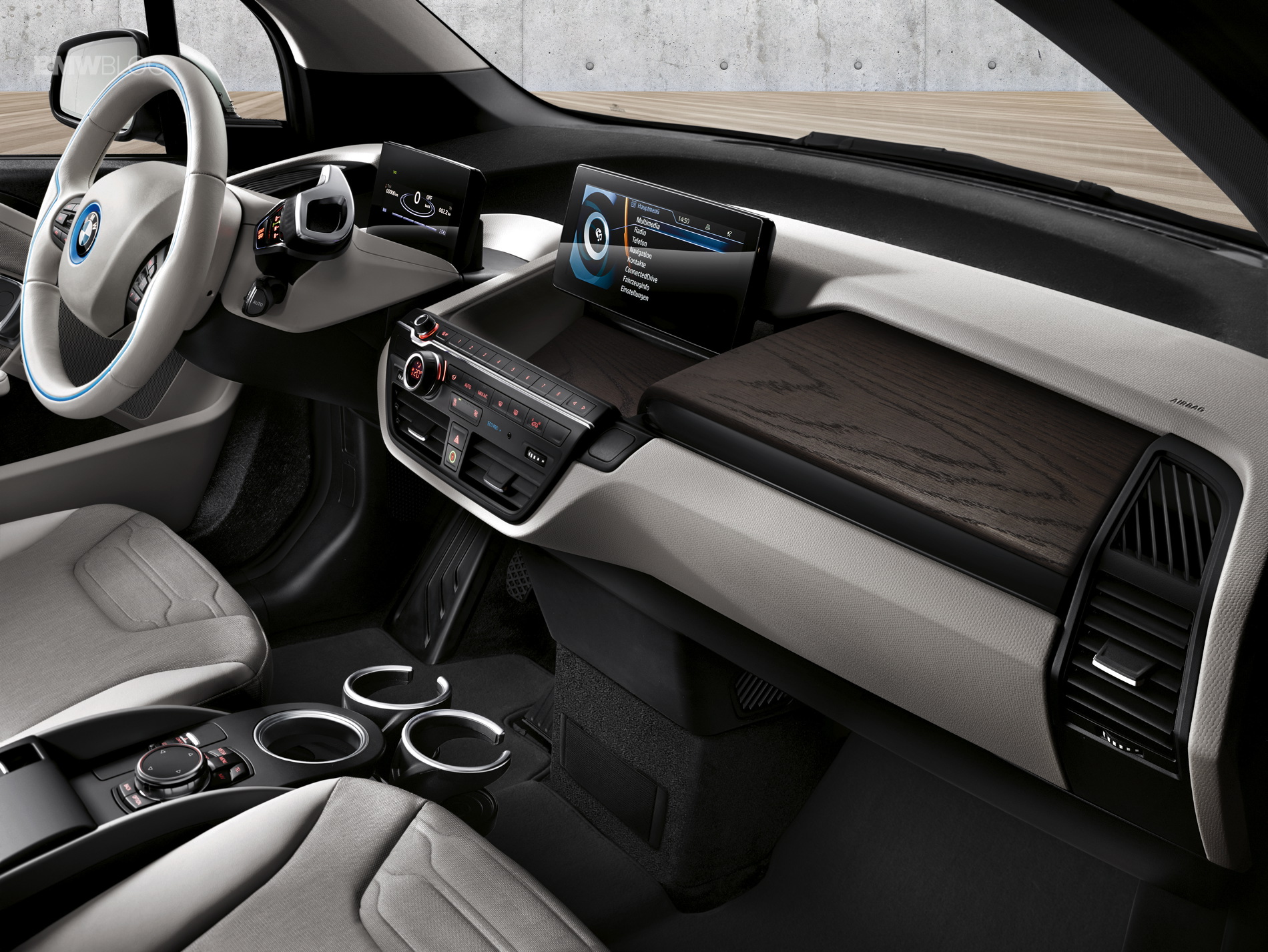 There are also a few interior changes on the new i3. Finally (Let me repeat that!) FINALLY, the US market will be able offered the moonroof option. Much to the chagrin of i3 owners across the country (and particularly the ones in California), until now the moonroof option that was available on the i3 everywhere else in the world, wasn’t available in North America. It will now be offered once the 2017 i3 begins shipping sometime in late August. There is also a new interior option being called Deca World (to go along with Mega, T\era & Tera Worlds). Deca World replaces Mega World as the base trim and is an attractive Black fabric with BMW i Blue trim. It has been available in Europe since the i3’s launch, where it’s called “Atelier”. There’s also a new dark oak wood option to go with the lighter Eucalyptus wood dash panels. Customers who order other of the two top interior trim levels (Giga or Tera World) will now be able to choose which wood trim they prefer.