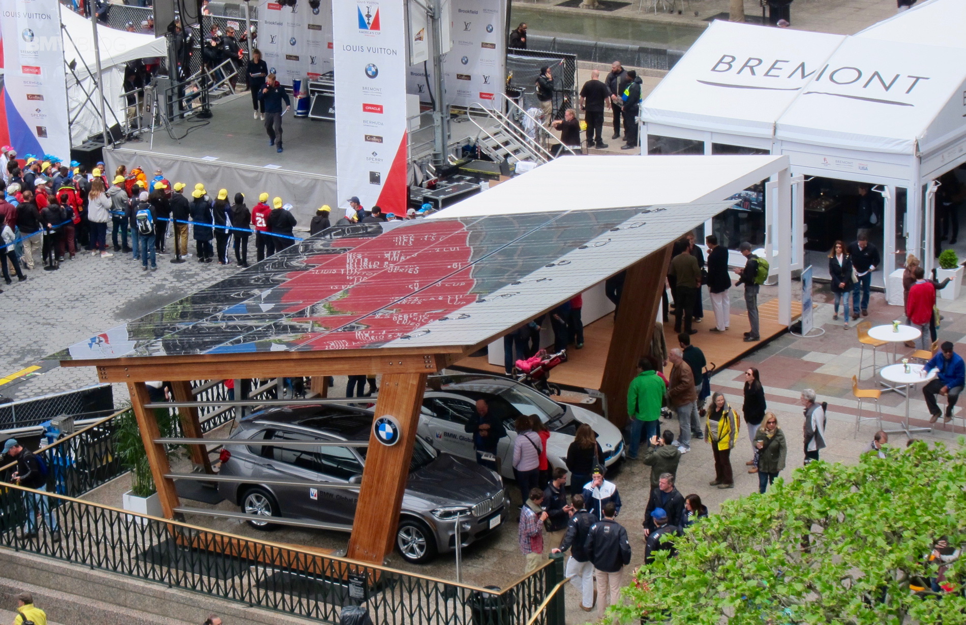 BMW has set up two BMW i Solar Carports on Bermuda, each capable of charging eight electric vehicles, one at Team Oracle base and one in the city center of Hamilton. BMW i Solar Caports are largely made from the bamboo material, structural stainless steel and solar panels. The result is beautiful, functional and sustainable structure. Bamboo has an excellent CO2 balance as it takes in a lot of CO2 during its rapid growth cycle and an extremely positive environmental balance.