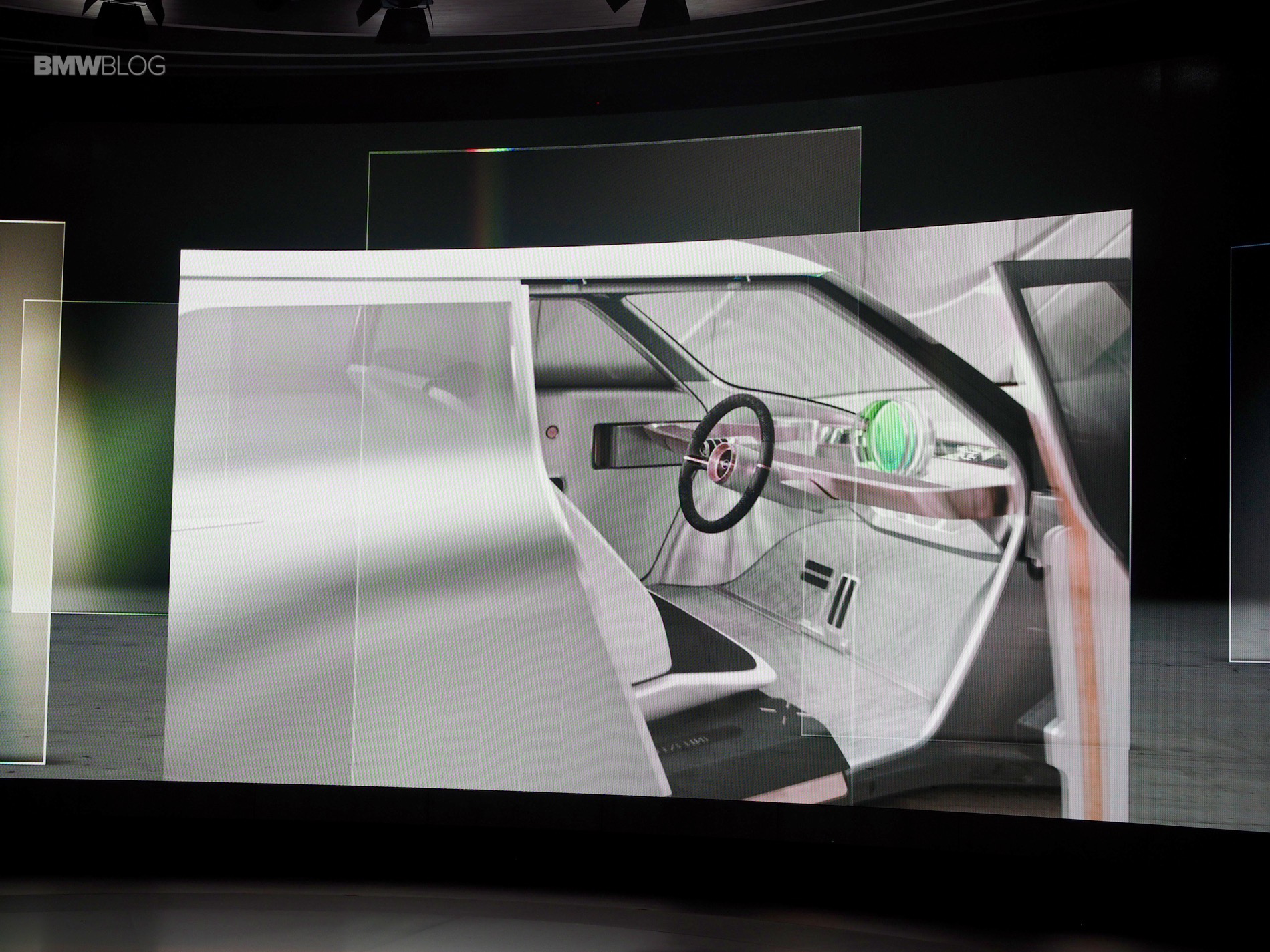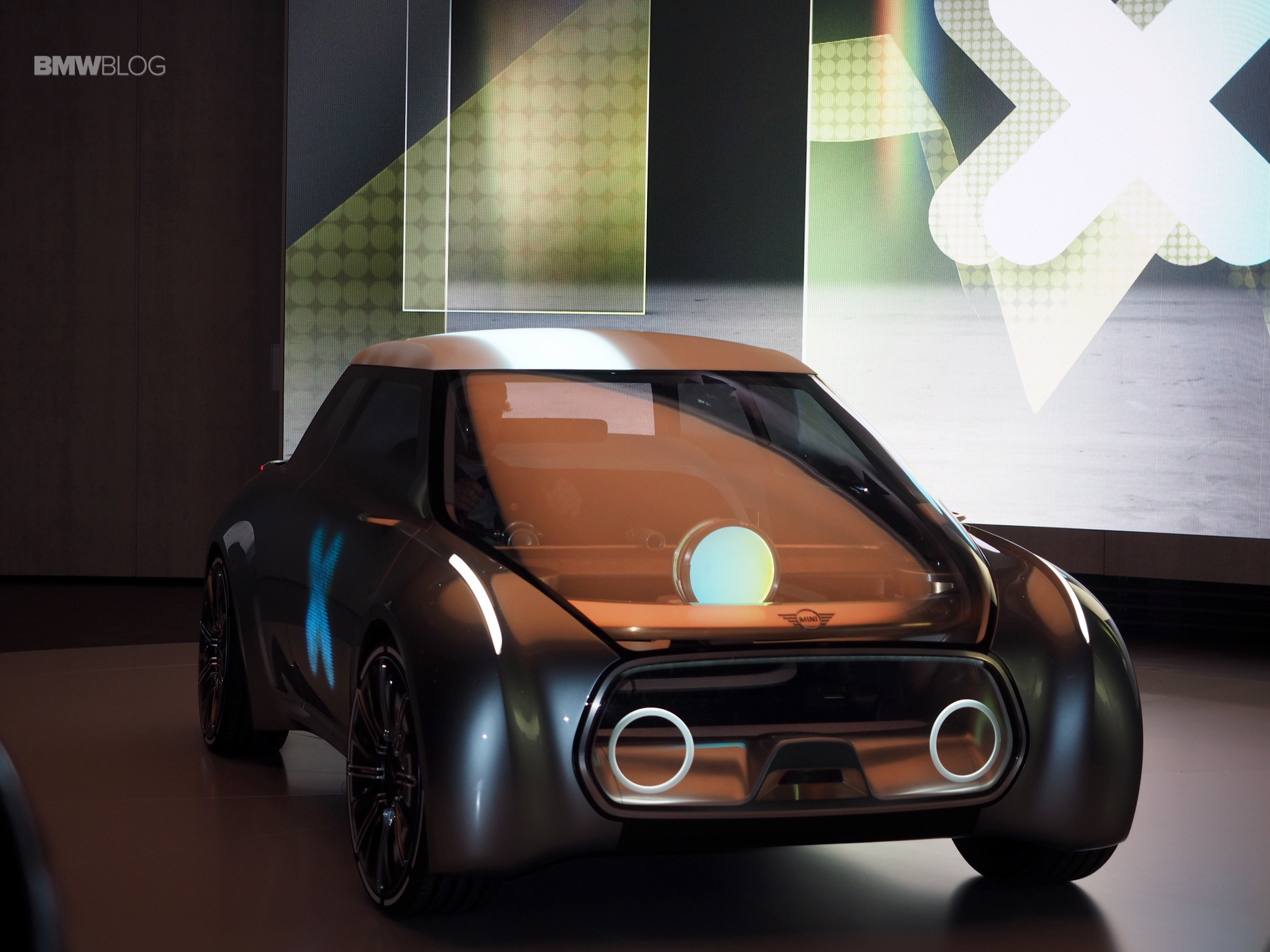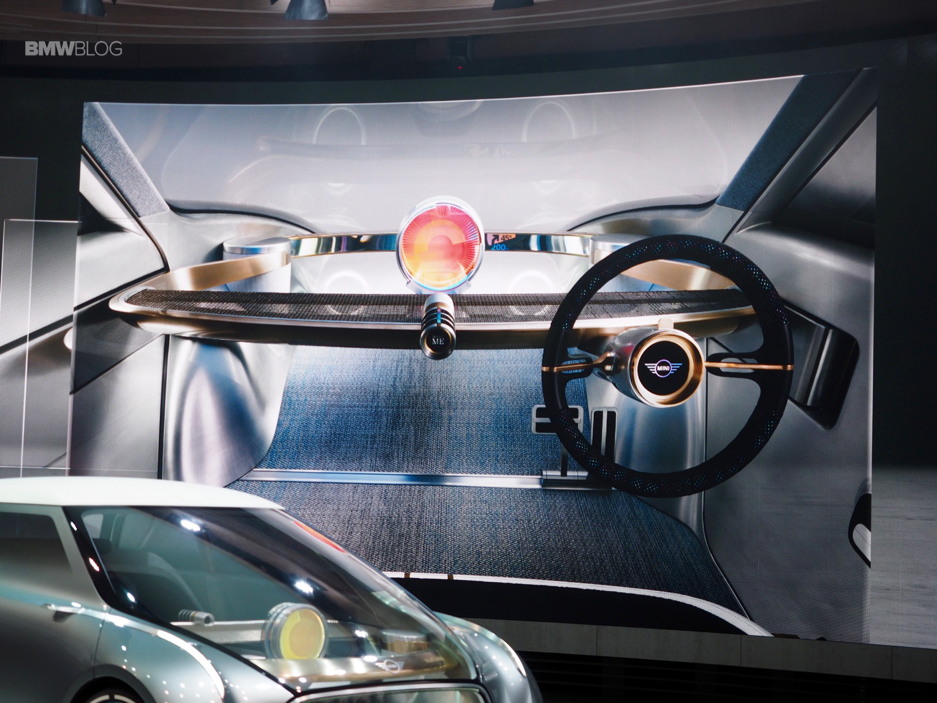 On the inside of this MINI Concept is a centrally-positioned circular instrument, similar to the center screen on current MINIs, called the “Cooperizer”. It changes color like a kaleidoscope, as the multi-faceted digital intelligence selects different personality, entertainment, communications and autonomous settings for the driver.