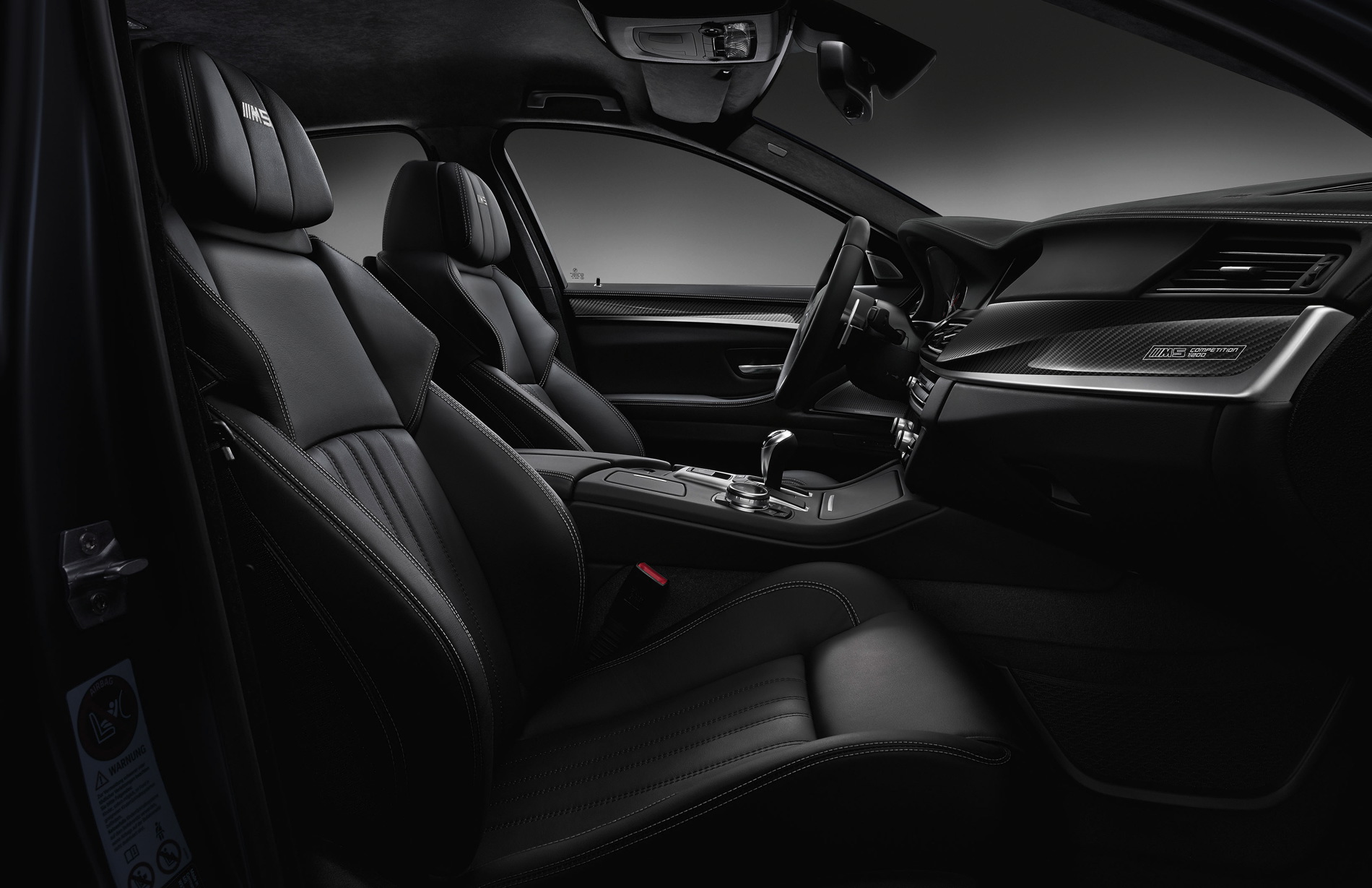 The BMW M5 “Competition Edition” comes with exclusive body colors –100 vehicles in Carbon Black metallic and 100 in Mineral White metallic respectively. The 20-inch, forged and polished, double-spoke M light alloy wheels in a Jet Black finish and with mixed tires (265/35 ZR20 at the front, 295/30 ZR20 at the rear) further enhance the car’s looks. M Performance parts in carbon such as the rear diffuser, the gurney on the boot lid and the mirror caps set further dynamic accents. The high gloss black kidney grilles and side gills bearing the lettering ”M5 Competition”.