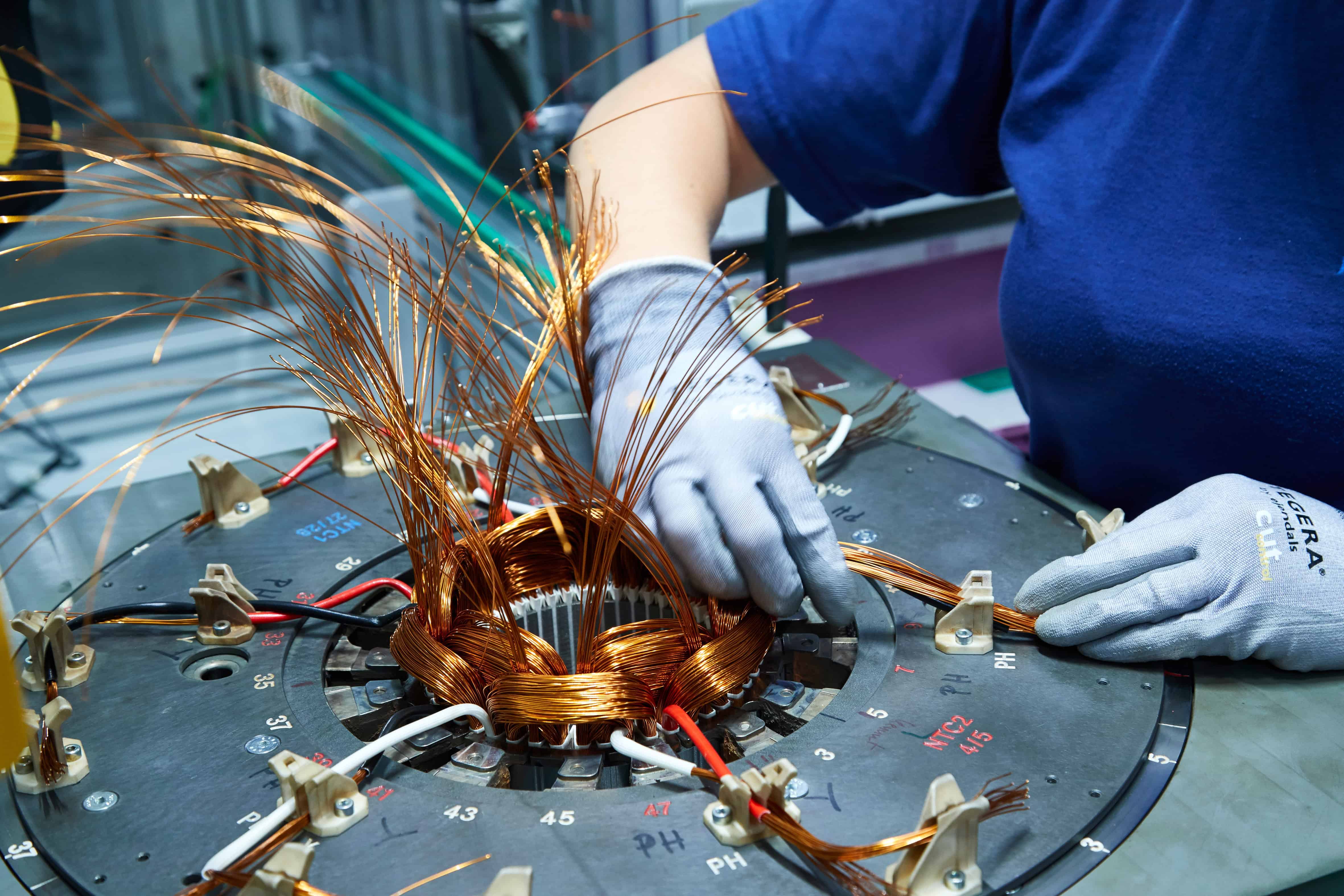 The high specific output and sporty characteristics of eDrive motors are a result of the extensive optimization of the permanently excited synchronous electric motor technology on which these motors are based. For example the stator consists of up to two kilometers (1 ÂĽ miles) of copper wiring, which is specially wound for extra compact dimensions. The stator production process comprises the packaging and insulating of the individual sheet metal sections, and drawing in and forming the coils.