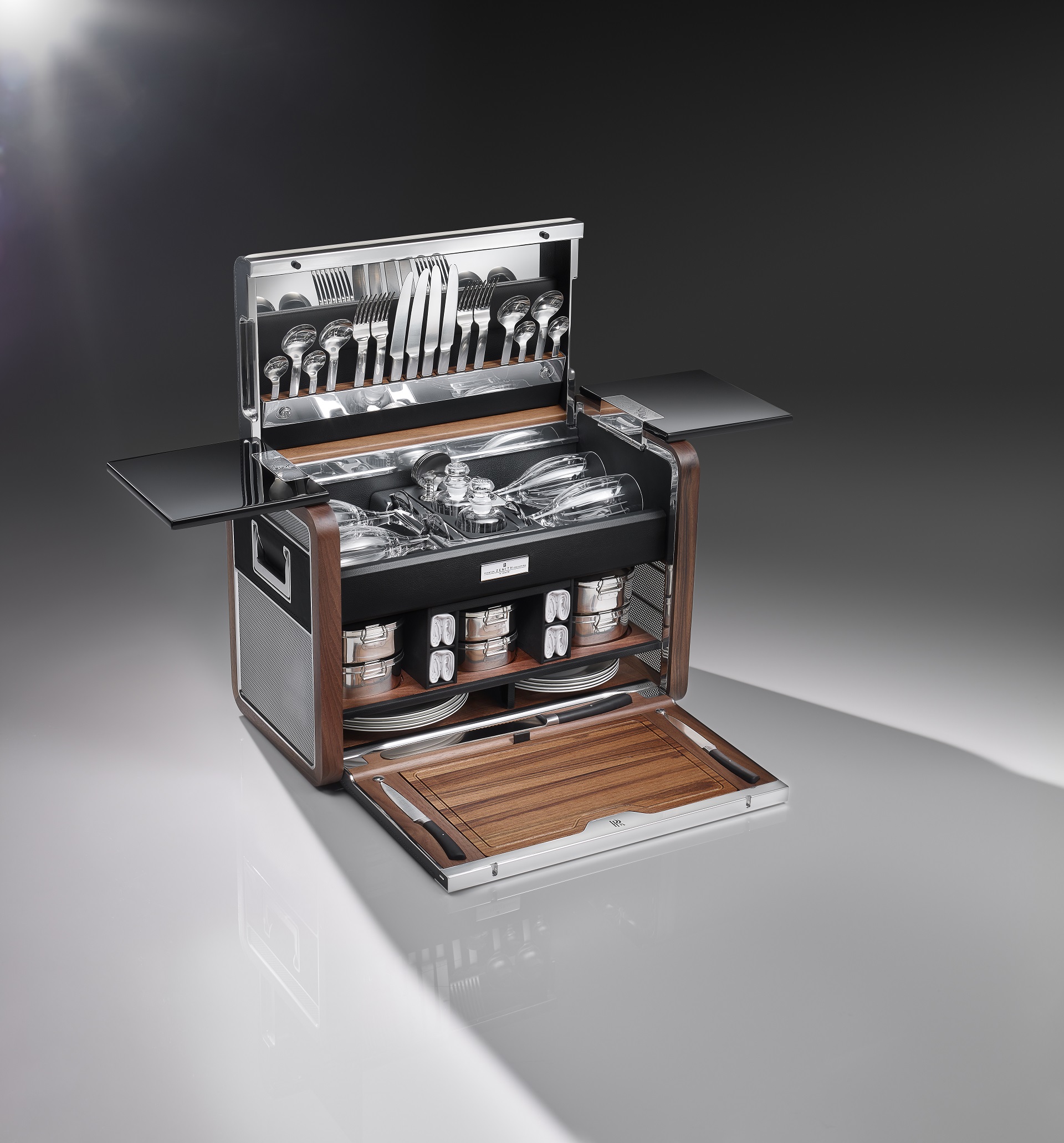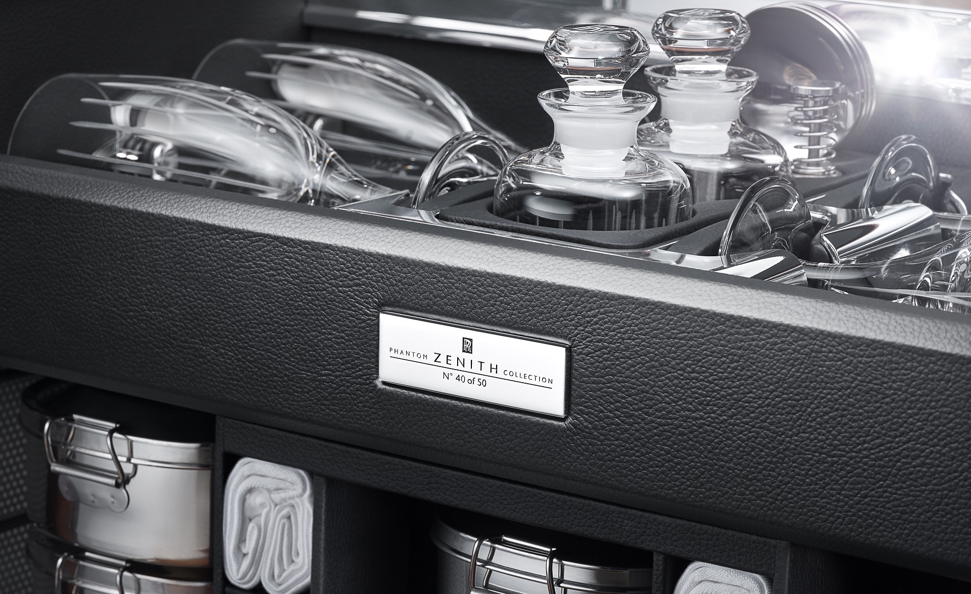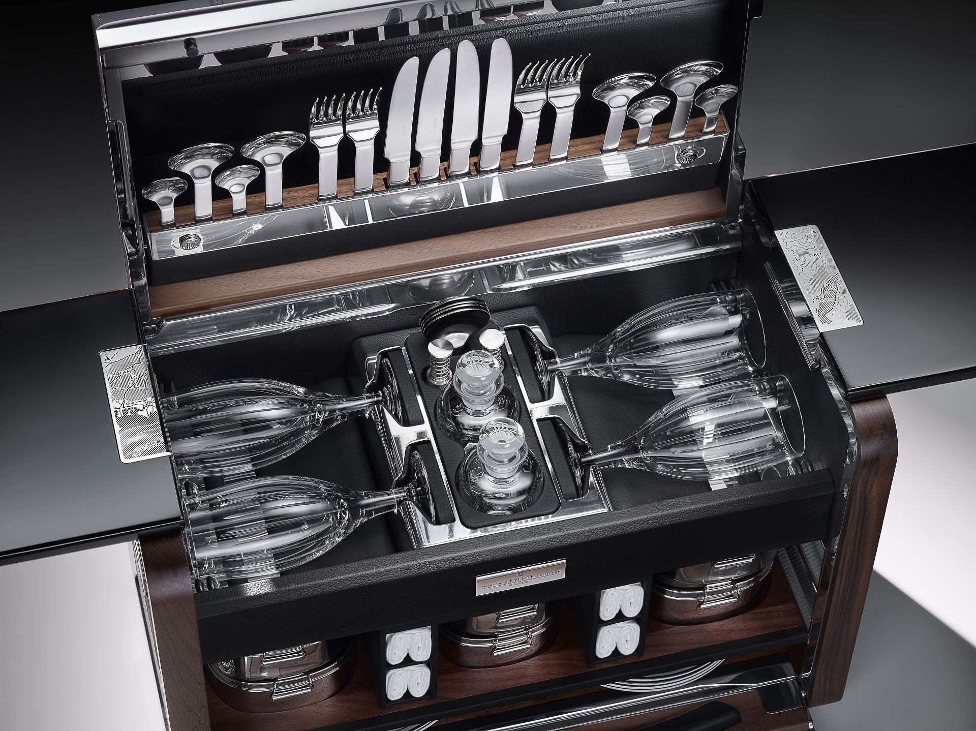 Piano Black picnic tables housed within the hamper fold out on milled-aluminum hinges. Like the armrest cappings inside the car, the hinges reference the history of Rolls-Royce cars, engraved with the locations of the global debut of the experimental versions of each car – Villa D’Este on the shores of Lake Como for 100EX, the progenitor of the Phantom Drophead Coupé; and Lake Geneva for the 101EX, the car that would become the Phantom Coupé.