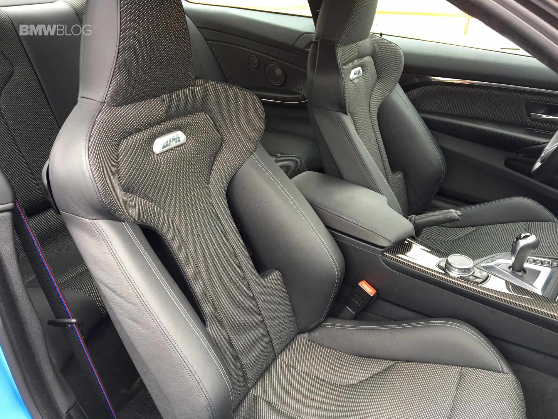 On the inside, the Comp Pack brings new sport seats which basically just have some holes in them where your kidneys are. This looks cool, but it also allows rear passengers to poke you in the spine mercilessly. My tester had the cloth/leather combo which was actually quite nice. The seats don’t get too hot and they hold you in well. The actual support of them is superb and really held me in tight. But if there’s a complaint with them it would be that they might be too tight. I’m only 5’9″ 155 lbs and they were seriously snug on me. A larger person might find them unbearable. Also, it has M-colored stripes on the seatbelts. I think that alone is worth the $5,500.
