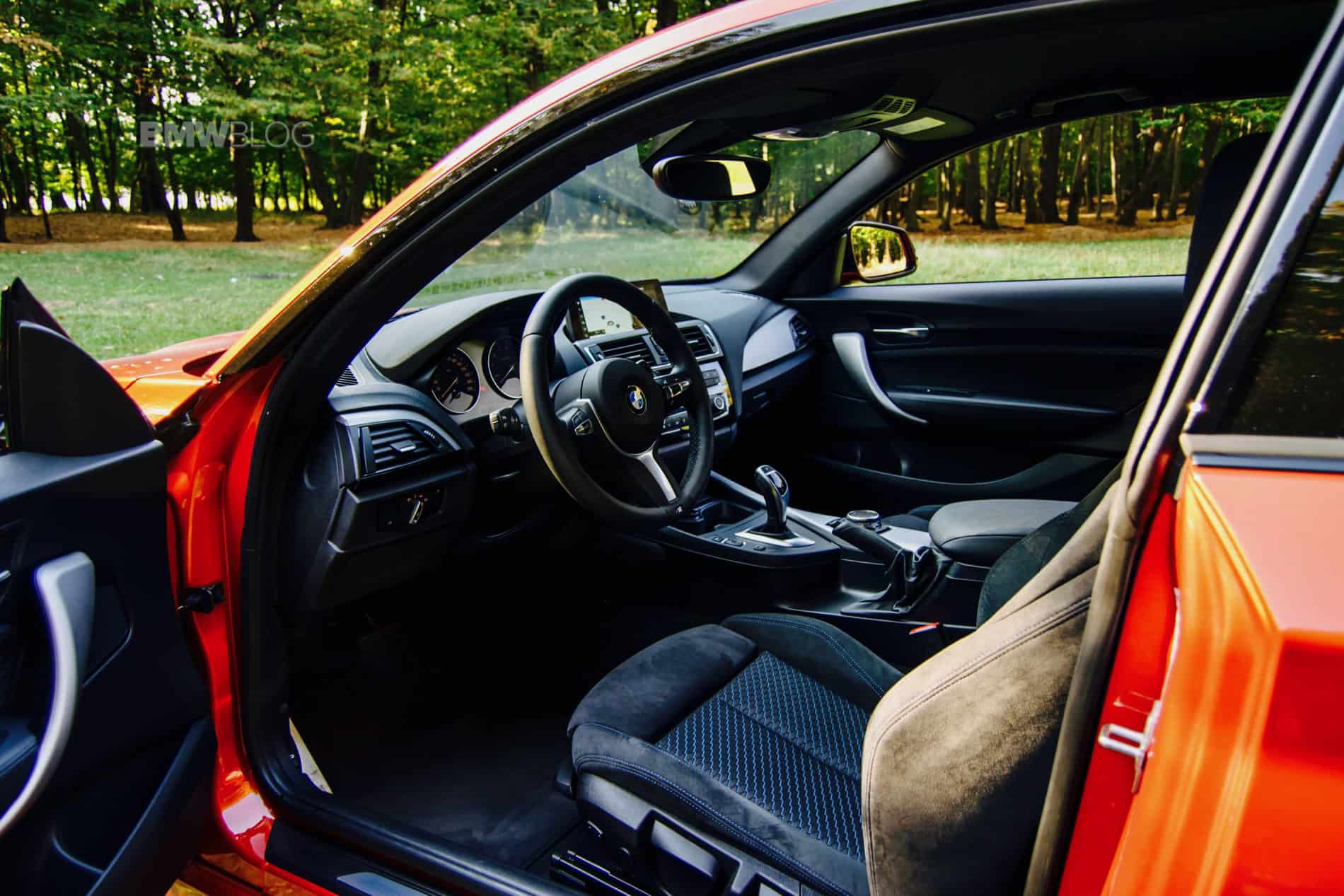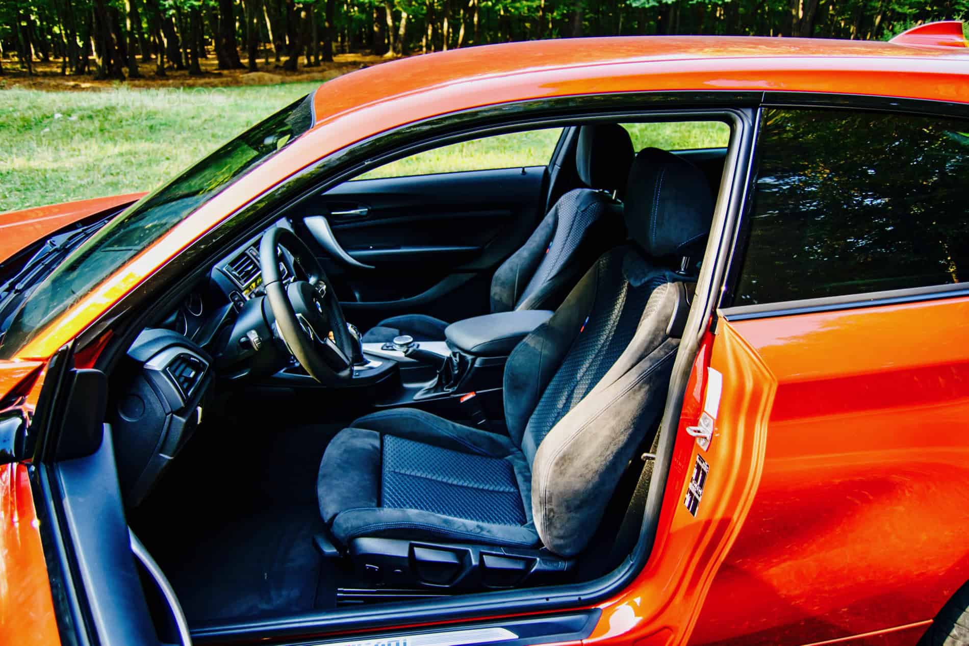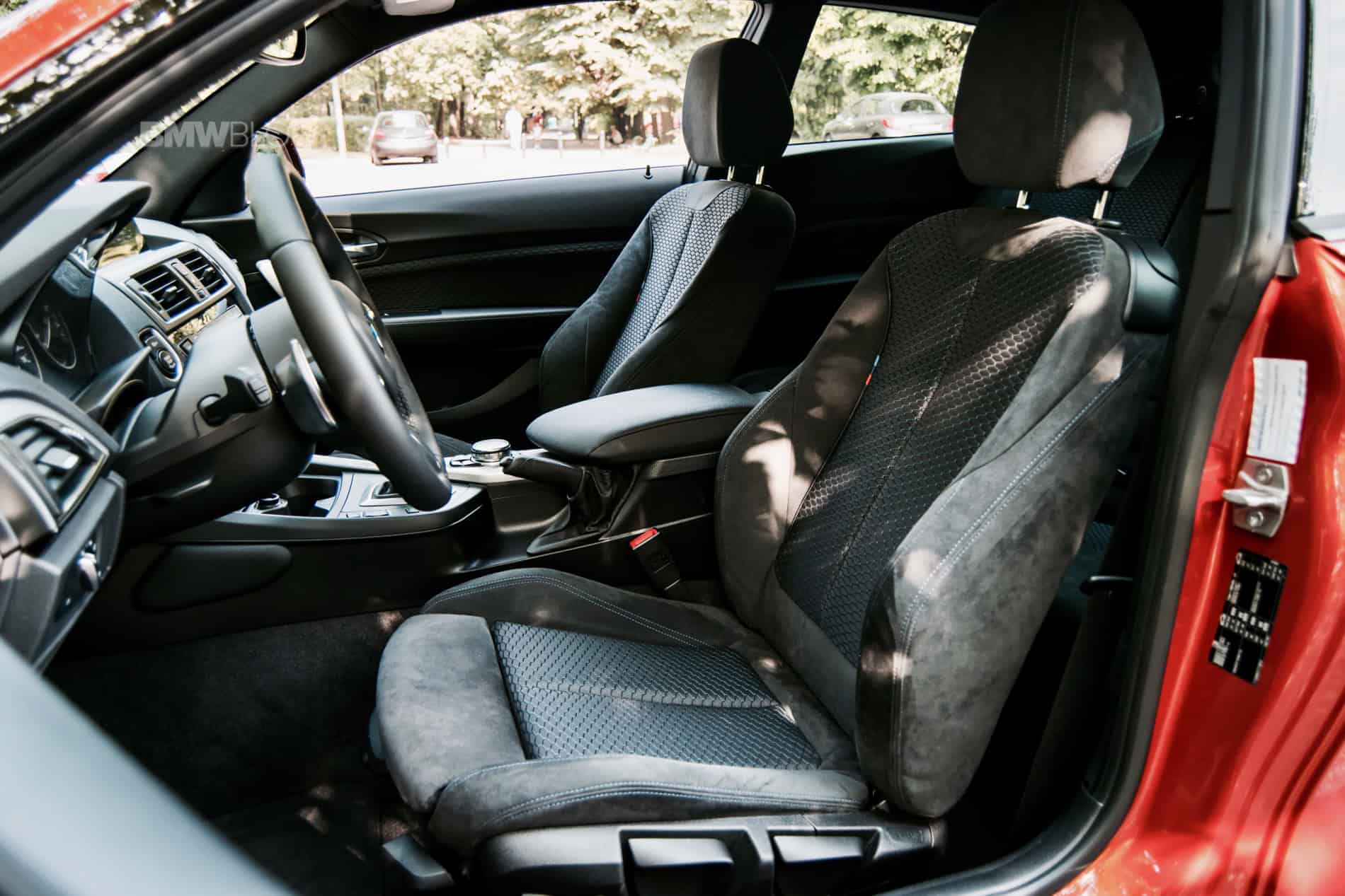 Inside, the cabin room is rather limited. It’s a small car by any standard and you feel it. Getting in the back isn’t all that hard to do but you might get a bit claustrophobic back there if you’re a big guy, such as myself (6-ft, 240 lbs), mostly due to the small windows. As standard you get the M Sport package that brings the traditional Alcantara/cloth seats, with their blue hexagonal motif. The seat backs are a bit on the firm side but you get the side bolstering you’ll be screaming for once you kick things up a notch.