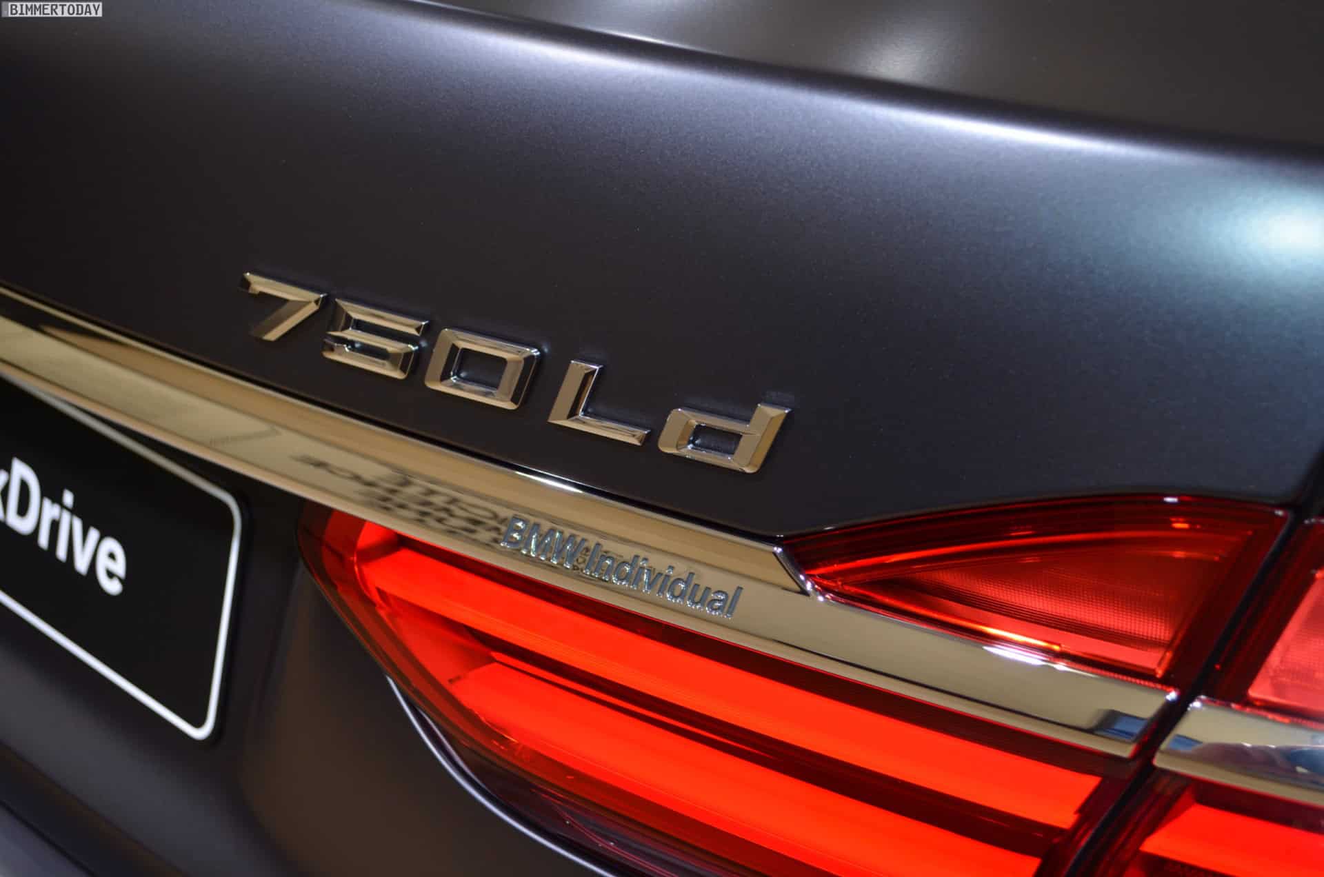 The second world premiere at the BMW stand at the 2016 Paris Motor Show was the new BMW 750d xDrive with a quad turbo diesel engine. Maybe not as flashy as the X2 Concept premiere, the powerful and economical 7 Series is just as impressive at a first glance. The car presented in Paris is the BMW xDrive 750Ld wearing a matte finish in the Individual Frozen Artic Grey color with some metallic flakes at closer inspection. The chrome-plated elements of the Design Pure Excellence package also provide some shiny accents for the matte paintwork.