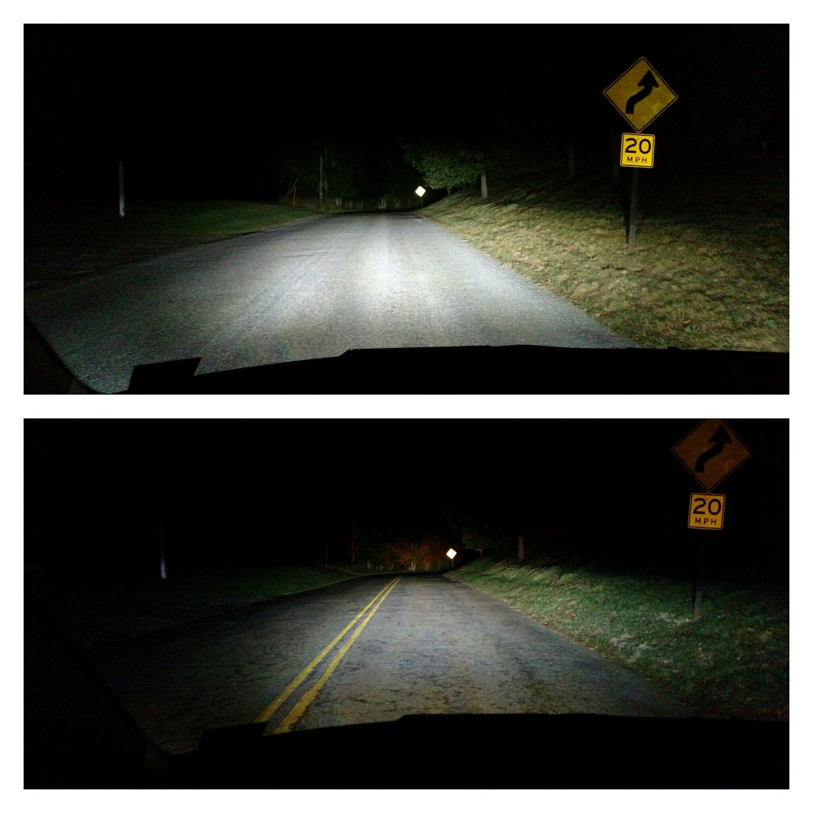 On the road, the new LED high beams (top pictures) clearly offer a better illumination pattern as well as a brighter light directly in front of the vehicle. I can now better see if there’s a deer approaching the side of the road from the trees and vegetation off to the side. It’s actually an even better improvement than the pictures seem to illustrate. Click on the images to enlarge.