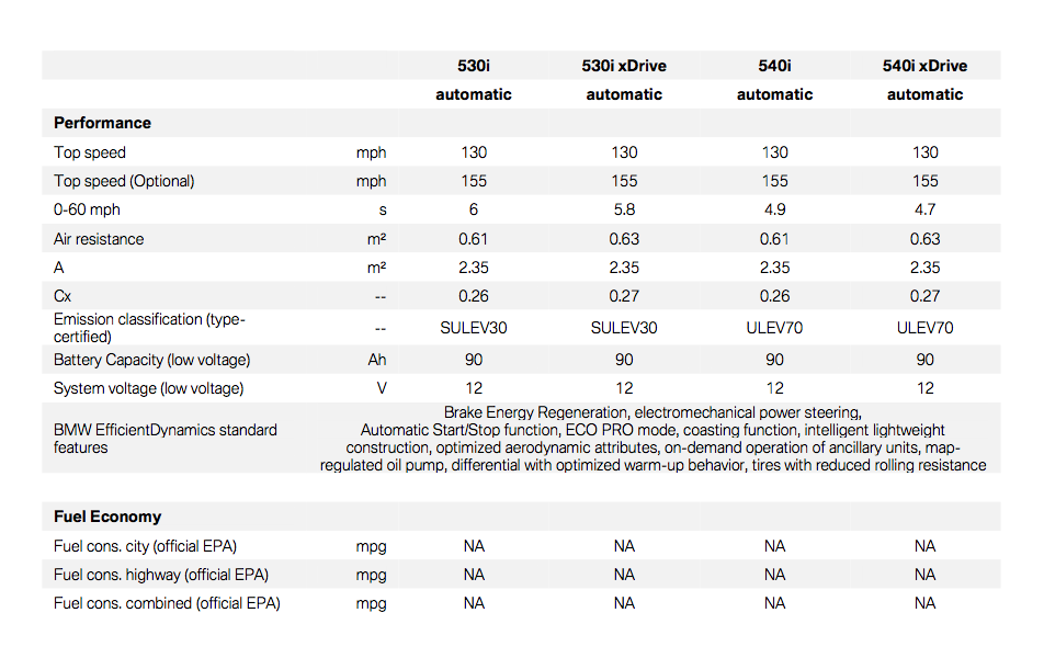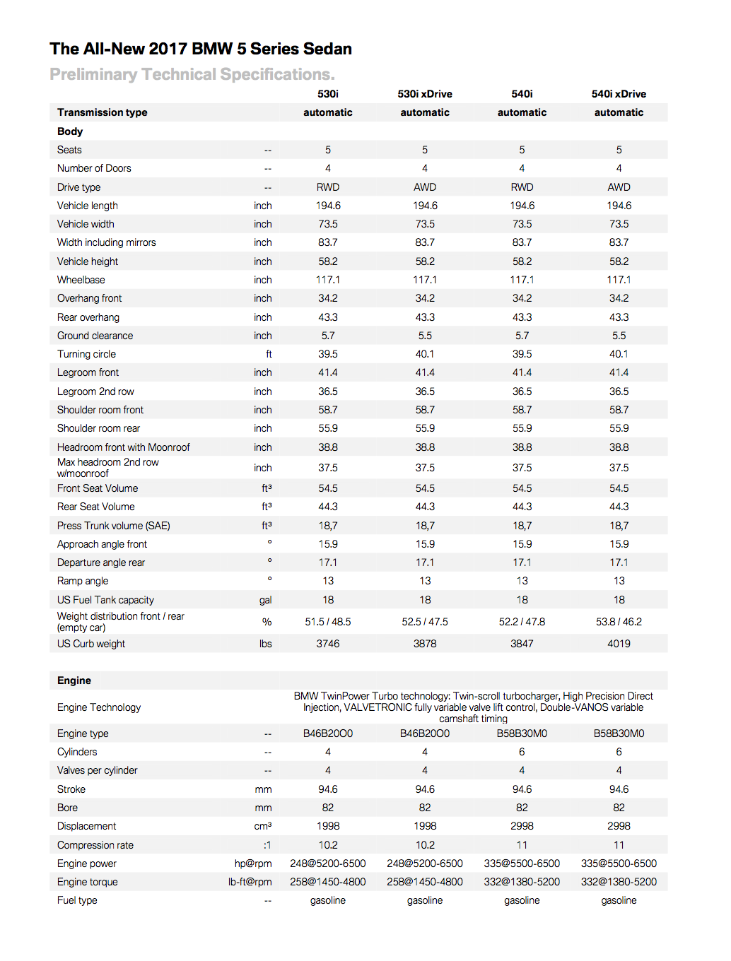 In every other market aside from North America, two diesel variants will be available as well. The 520d and 530d will use a 2.0 liter turbo-four and 3.0 liter turbo-six diesel, respectively. For the 520d, that means 190 hp and 295 lb-ft of torque, 0-60 mph in 7.6 seconds and 4.0 l/100 km (58 mph US) with the eight-speed automatic (expect the economy and performance to drop a bit with the six-speed manual). For the 530d, this means 265 hp and 457 lb-ft of torque, 0-60 mph in 5.7 seconds and 4.5 l/100 km (52 mpg US).
