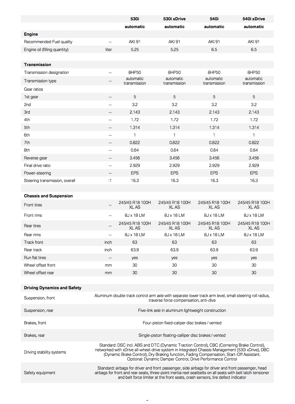 BMW 530i/BMW 530i xDrive: Four-cylinder petrol engine, eight-speed Steptronic transmission.