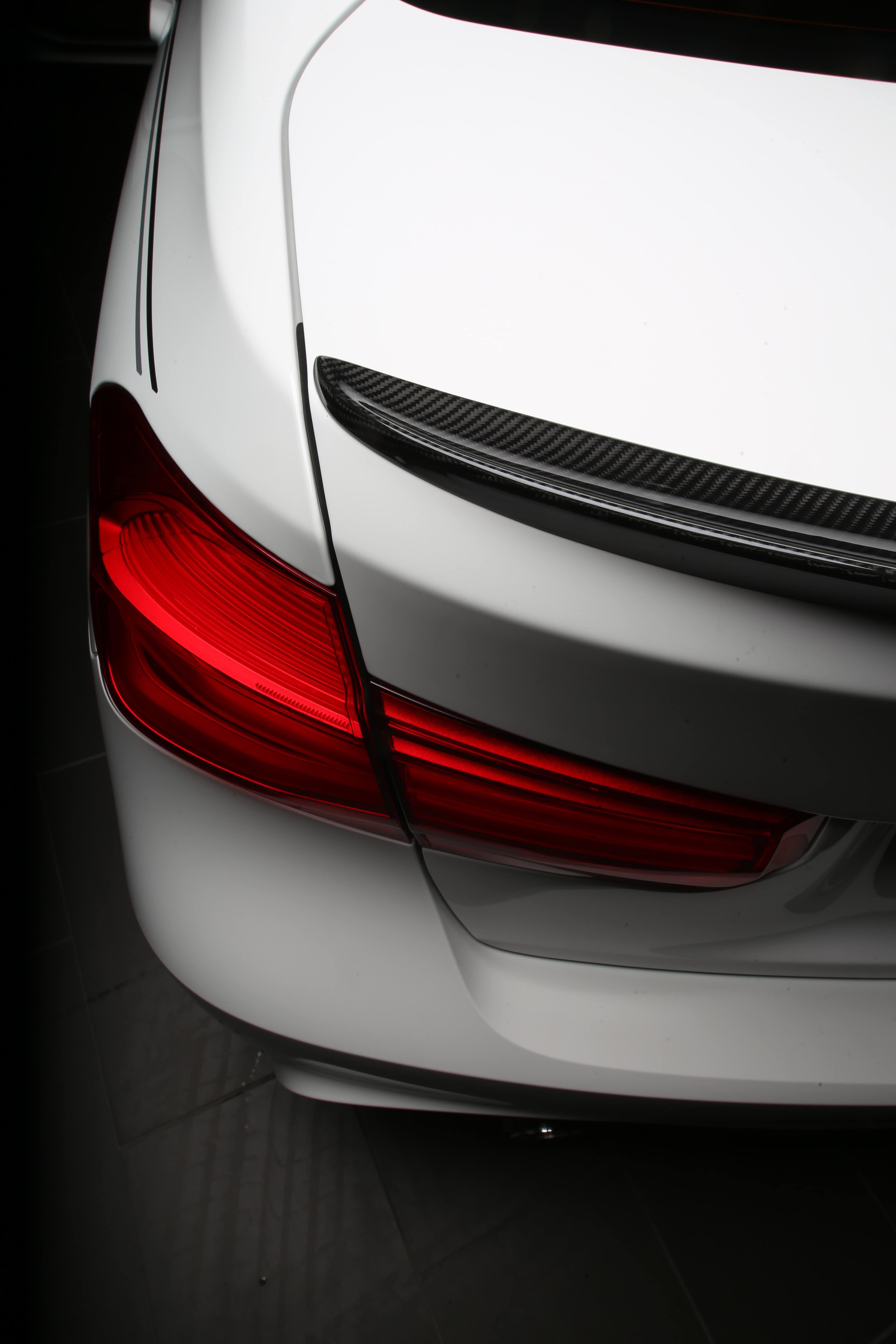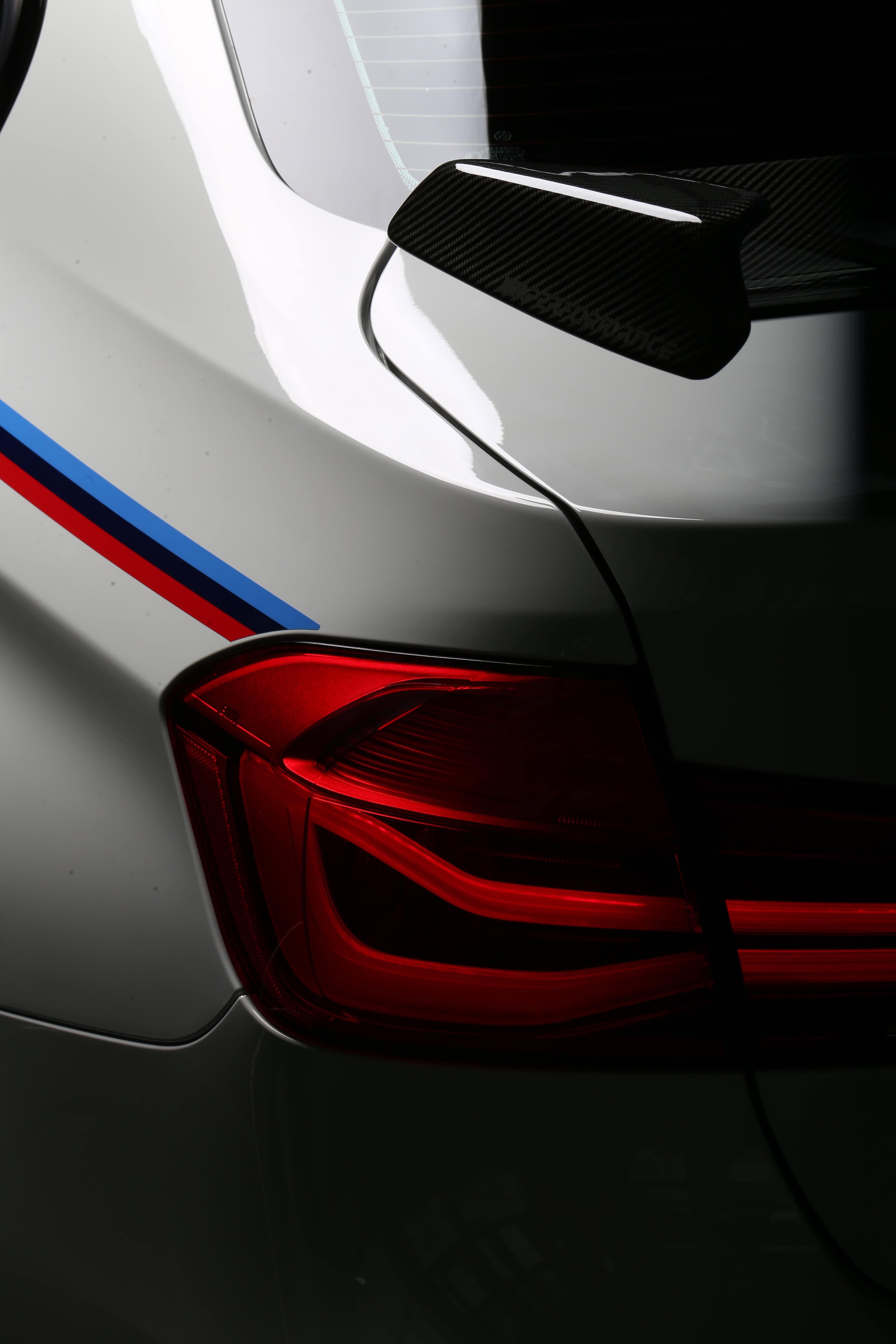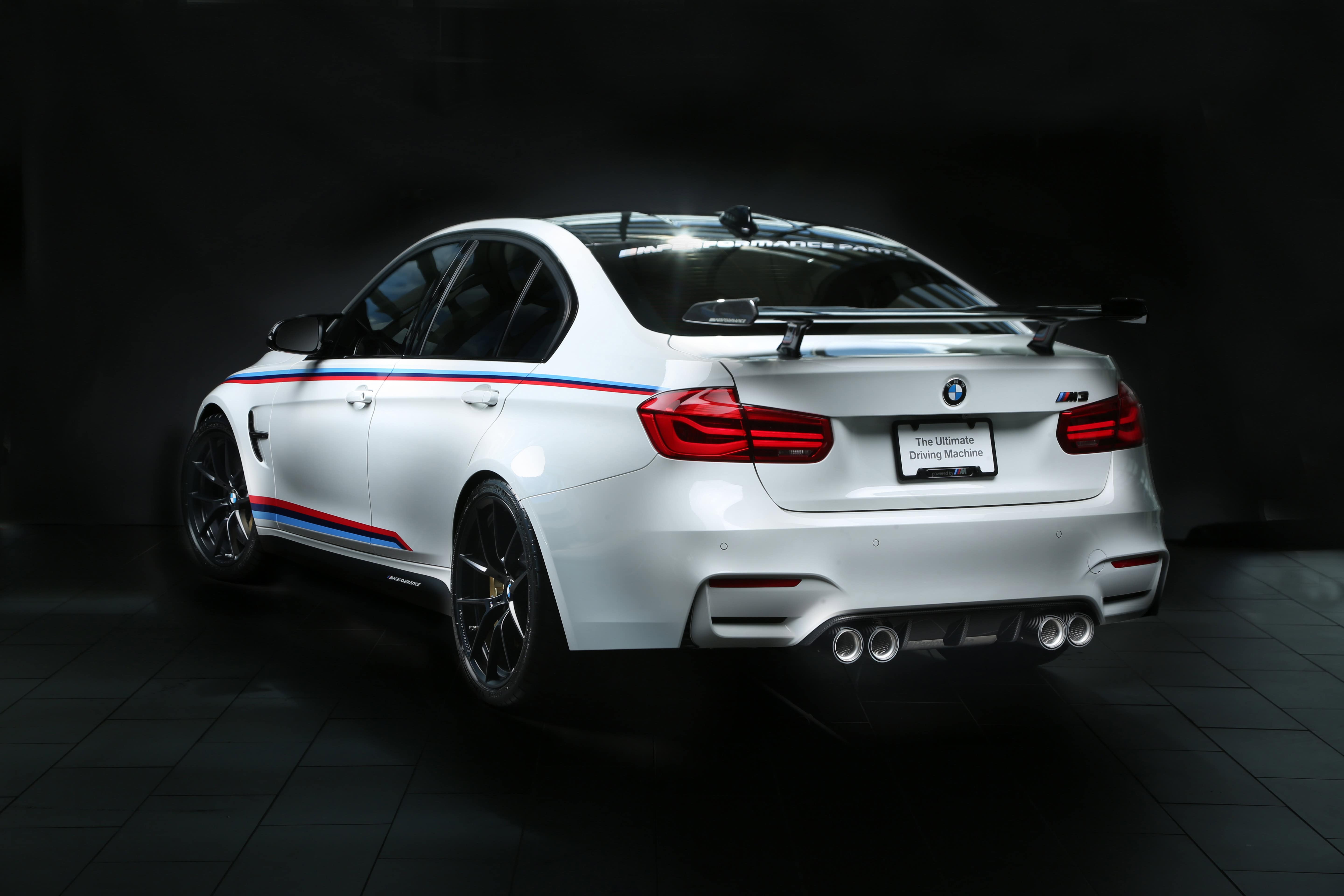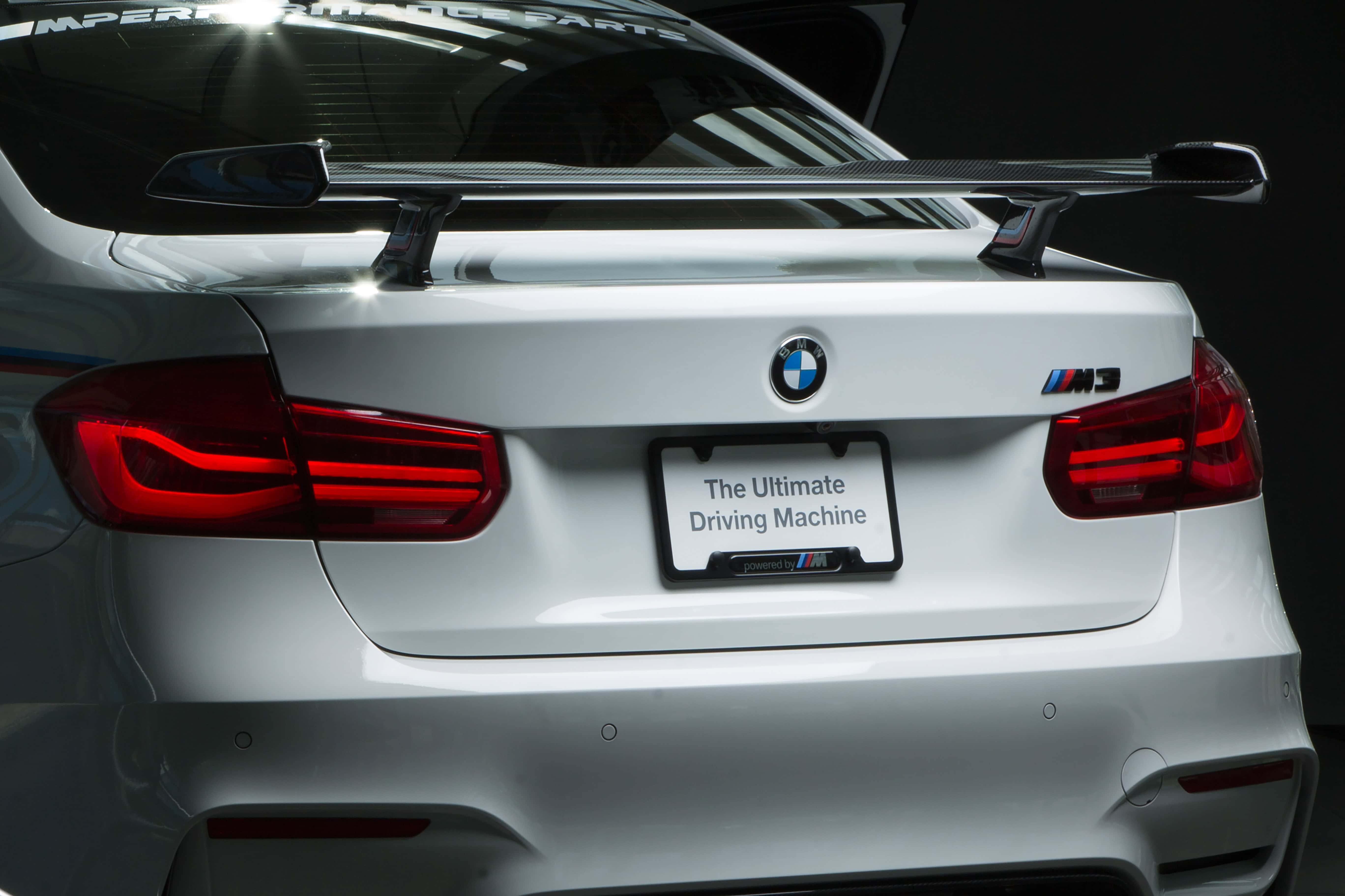 The BMW M Performance rear wing will be making its world premiere at the 2016 SEMA Show. This aerodynamic component is made completely from carbon fiber (wing, side sections, support brackets) and is accentuated with racing stripes, bringing motorsport know-how to the streets for a production M3. Market launch is planned for mid-year on 2017.