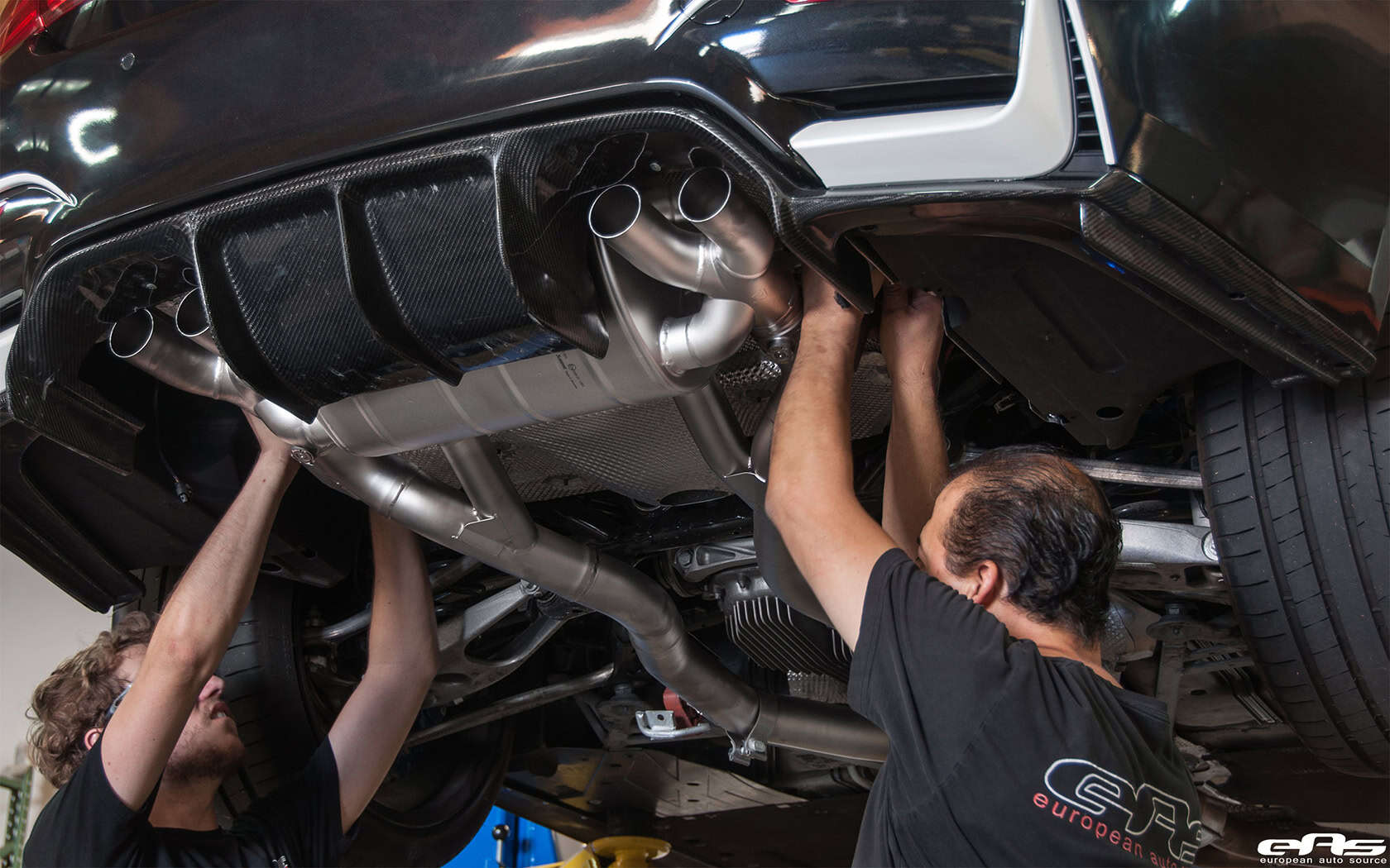 With this exhaust system, increases in both power and torque add to the sensory experience. This is combined with an improved throttle response, better sound and improved agility. For this exhaust system, the owner went with a set of quad exhaust tips made from carbon fiber. Akrapovic has designed the slip-on exhaust system with bigger pipes than the stock exhaust, yielding lower back pressure and more power, especially at lower RPMs, all this while being lighter than the factory exhaust rear section.
