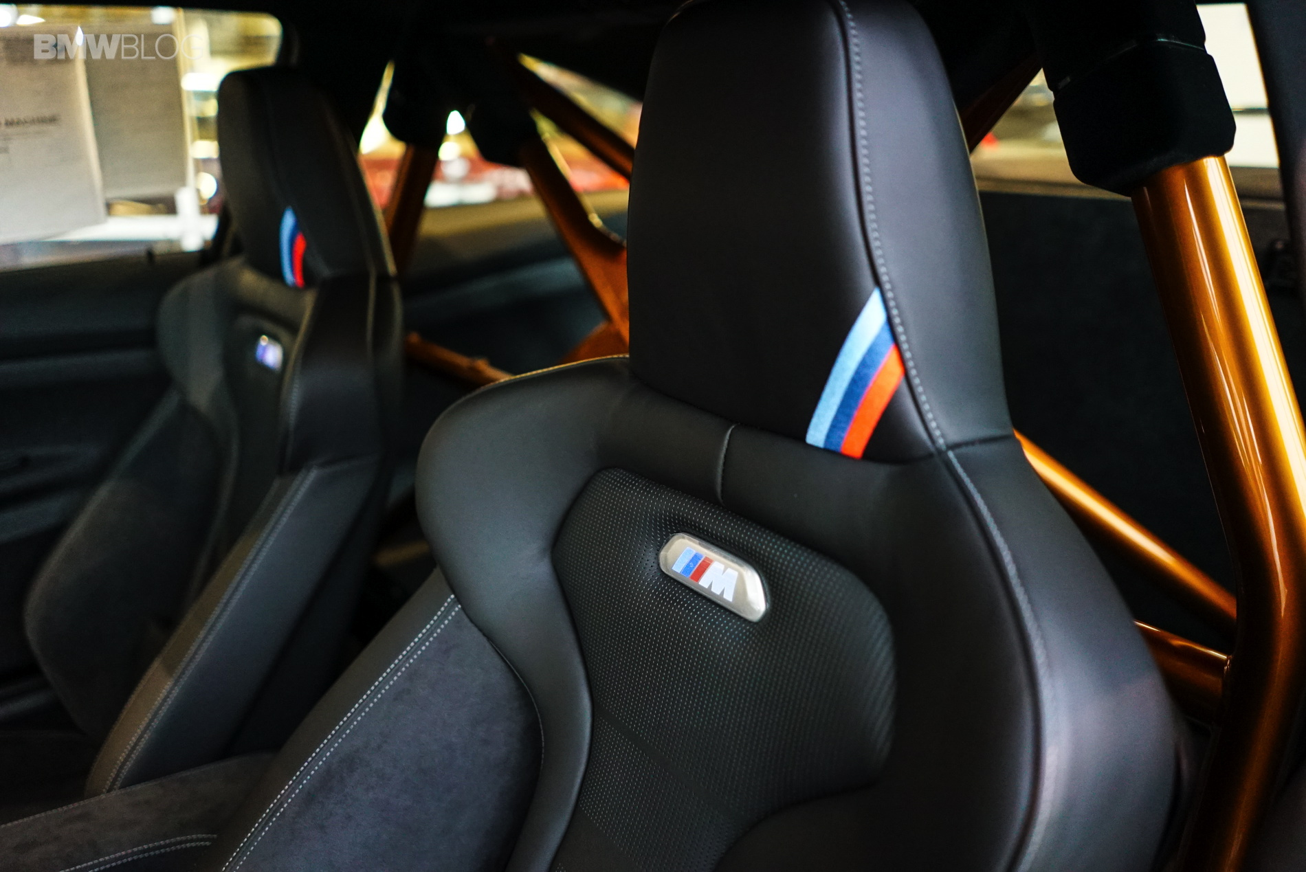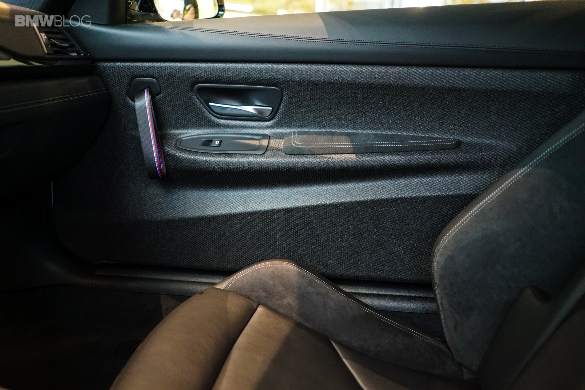 Back to the interior of the car, where carbon prevails once again as the door panels are covered in it. If you look in the rear area where your standard M4 would have two small seats, the GTS houses a serious-looking roll-cage painted in the same acid orange color that you see on the wheels and front aero-splitter. Door grab-handles? I don’t think so. Those add extra weight! BMW gives you a nice, black, nylon strap which has the M colors sewn in. I told you BMW means business!