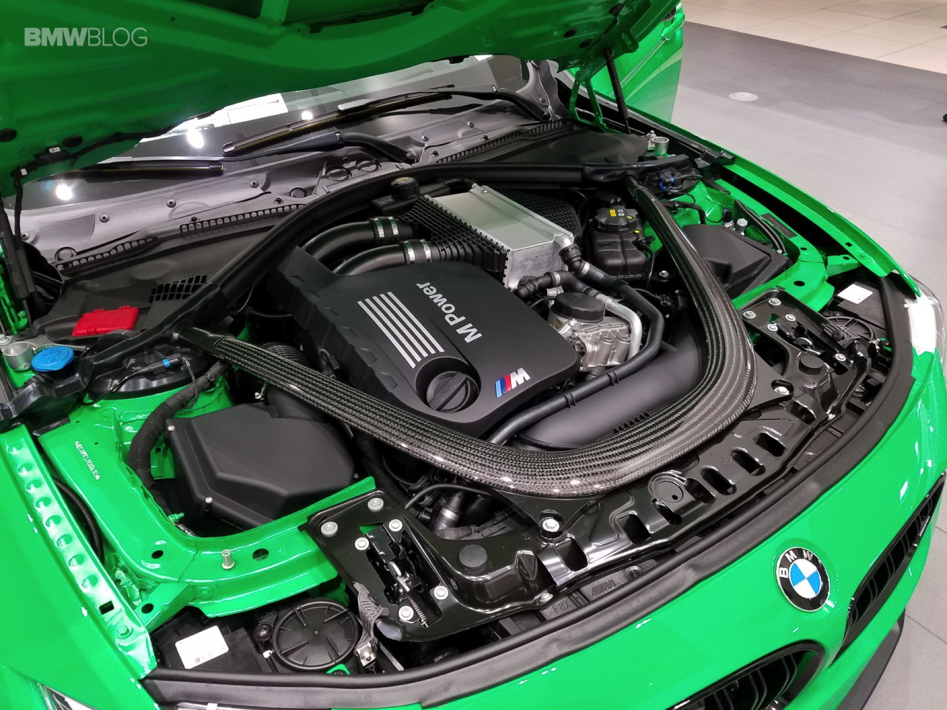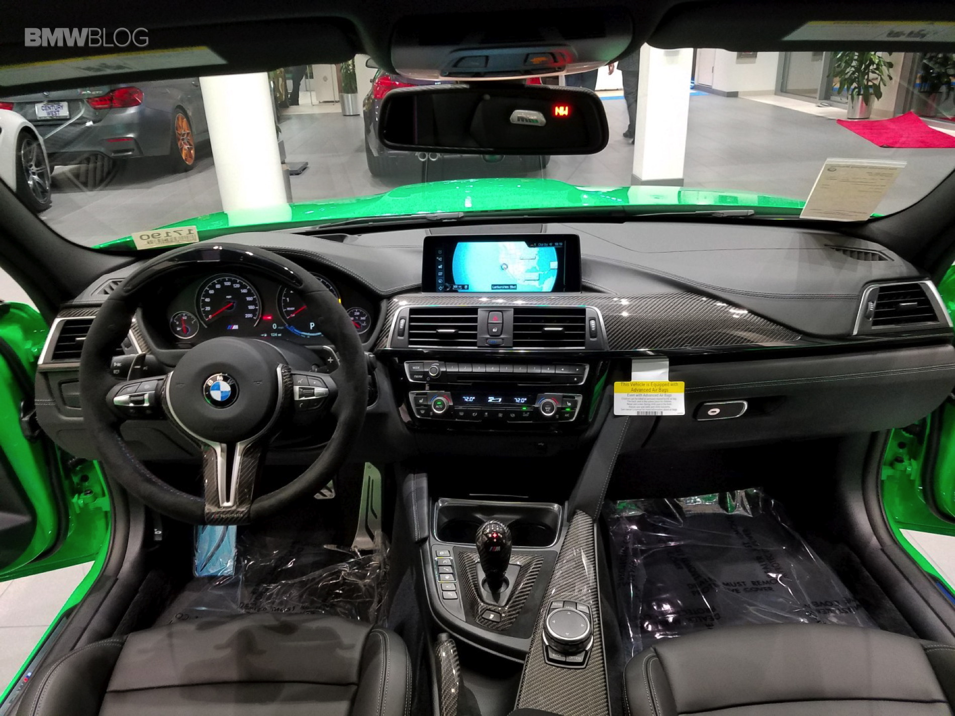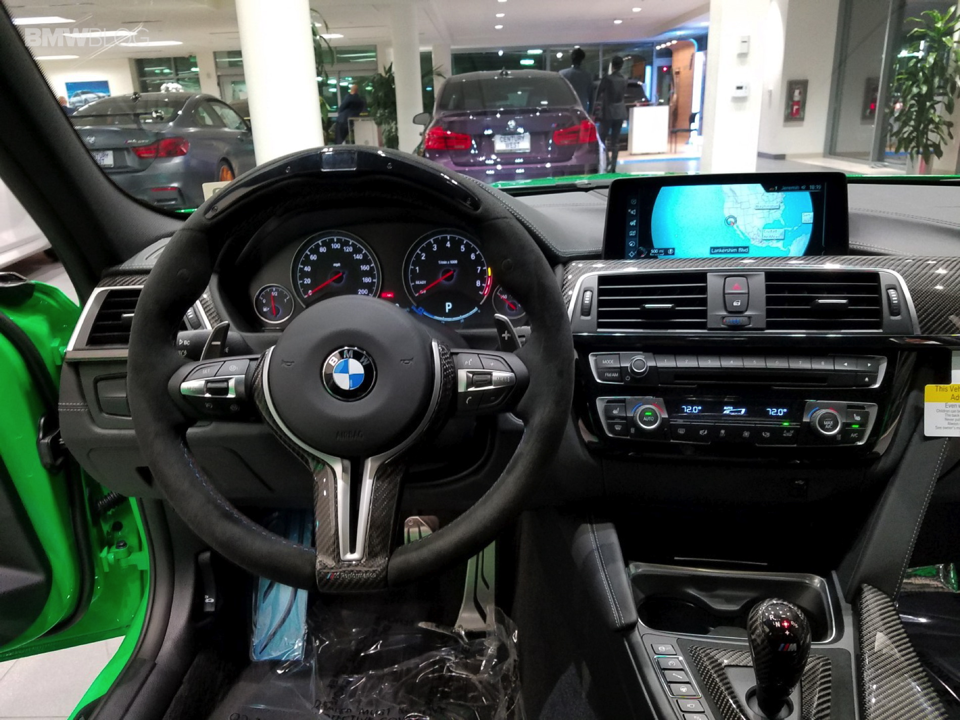 And stand out it does. This eye-popping M3 features the Signal Green color from the BMW Individual Catalog and every carbon-fiber part from the BMW Performance program: Carbon Fiber Front Aero kit, mirror caps, M-DCT selector, brake handle, rear diffuser and center console cover. And because that wasn’t enough unique, Marino has added stainless pedals, the BMW Electronic Performance Steering wheel, Performance Analyzer (for iOS and Android), painted-to-match trunk-lid spoiler and LED door projectors.