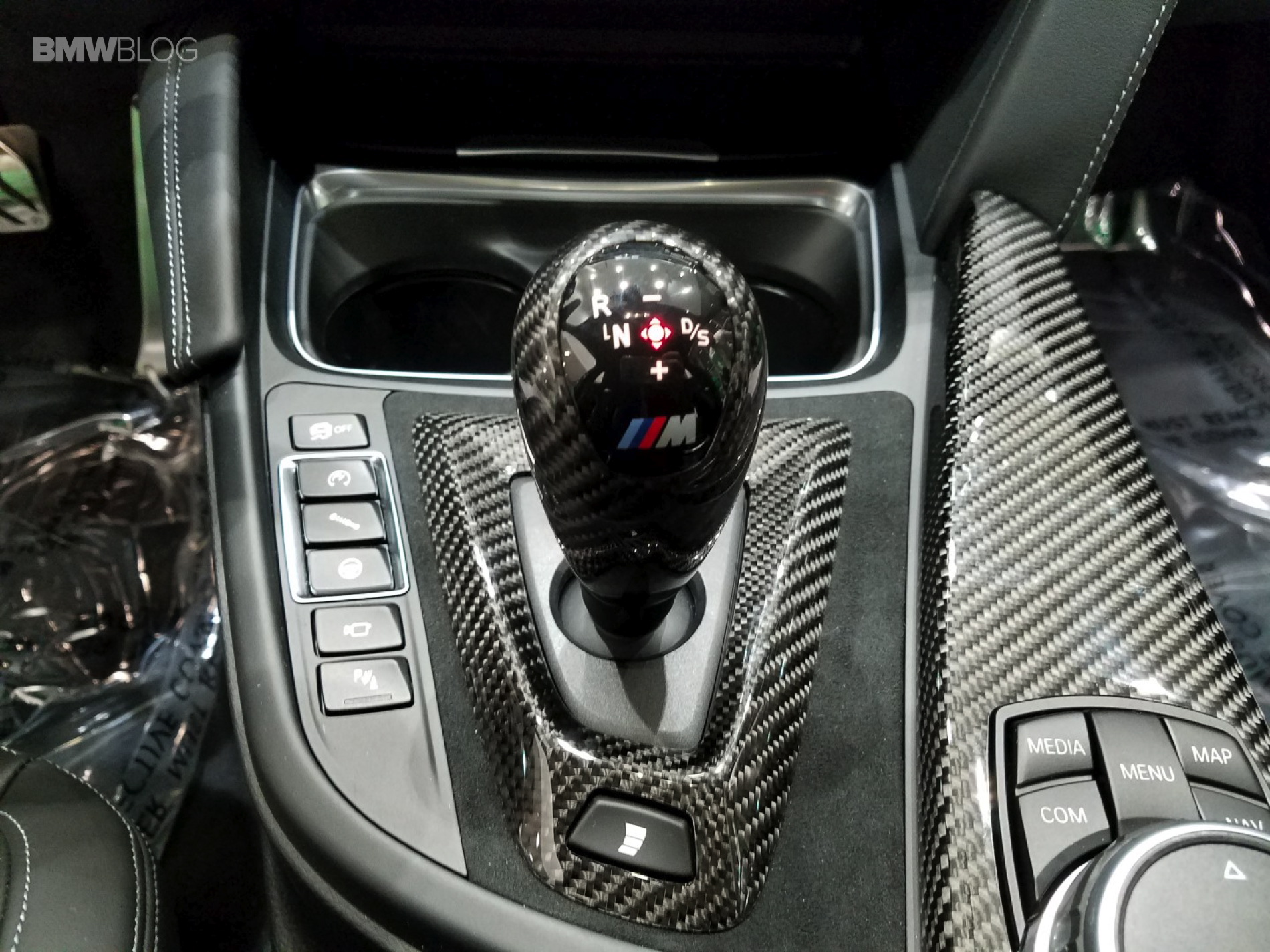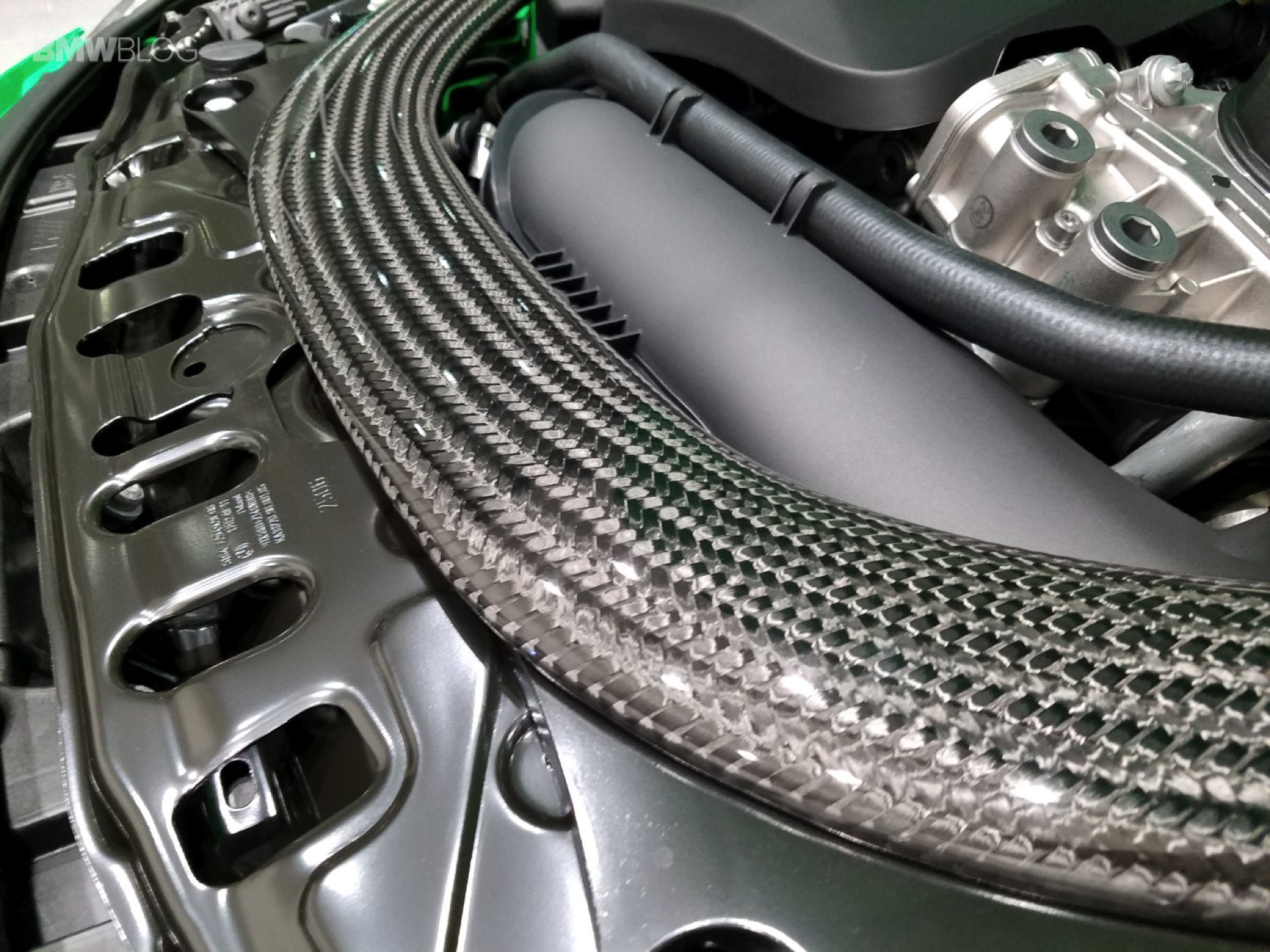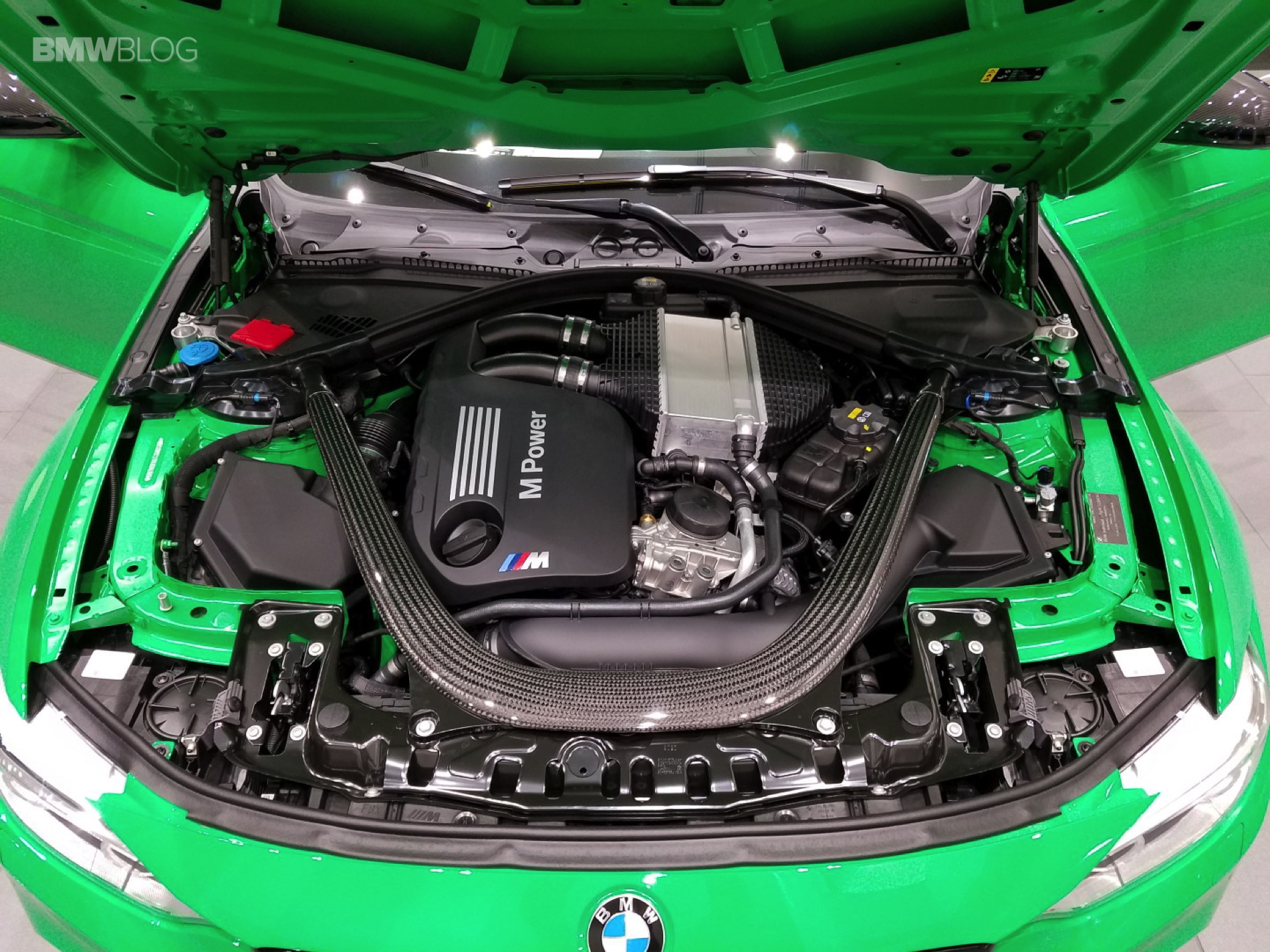 And stand out it does. This eye-popping M3 features the Signal Green color from the BMW Individual Catalog and every carbon-fiber part from the BMW Performance program: Carbon Fiber Front Aero kit, mirror caps, M-DCT selector, brake handle, rear diffuser and center console cover. And because that wasn’t enough unique, Marino has added stainless pedals, the BMW Electronic Performance Steering wheel, Performance Analyzer (for iOS and Android), painted-to-match trunk-lid spoiler and LED door projectors.