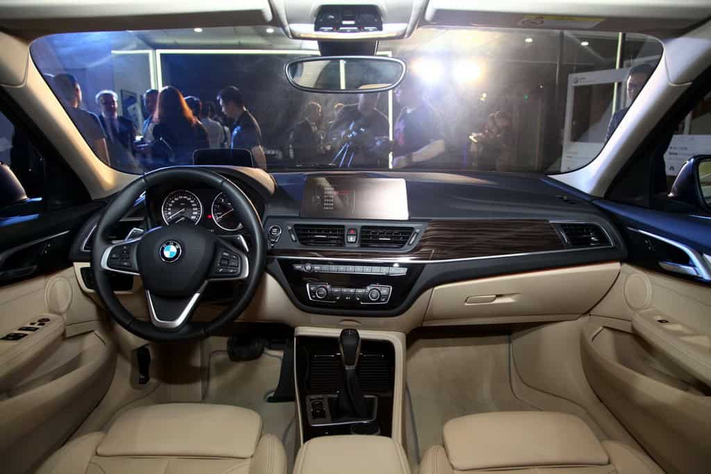 The top-end model has a dual-tone beige and black color combo with a floating dashboard that has a center console angled towards the driver. It features a three-spoke multi-function steering wheel, Start & Stop button, electric brake, full color Head-Up Display, 8.8-inch LED central screen, and BMW iDrive system.