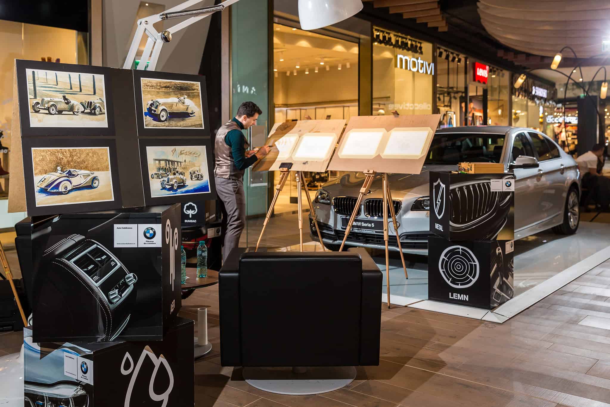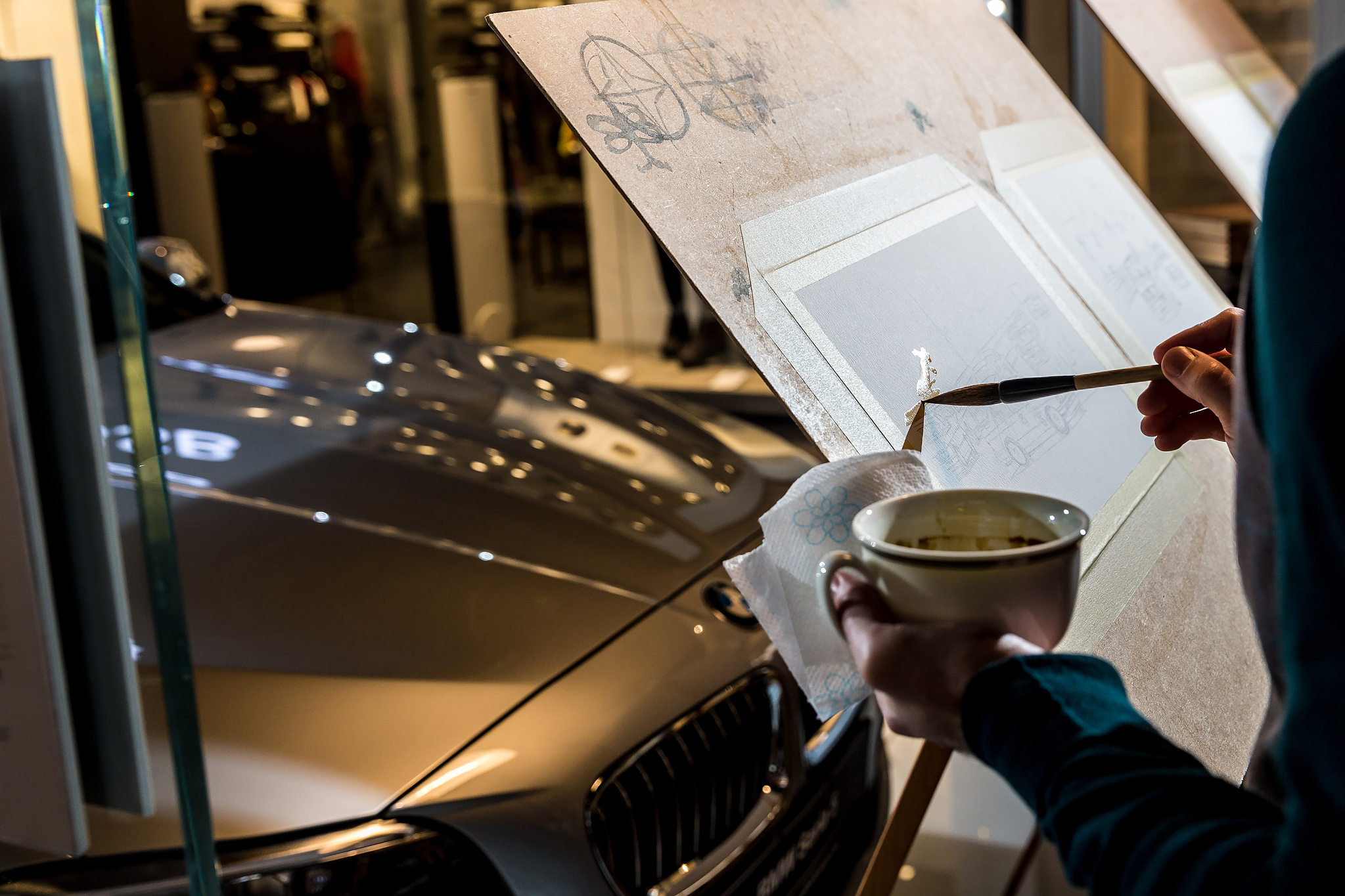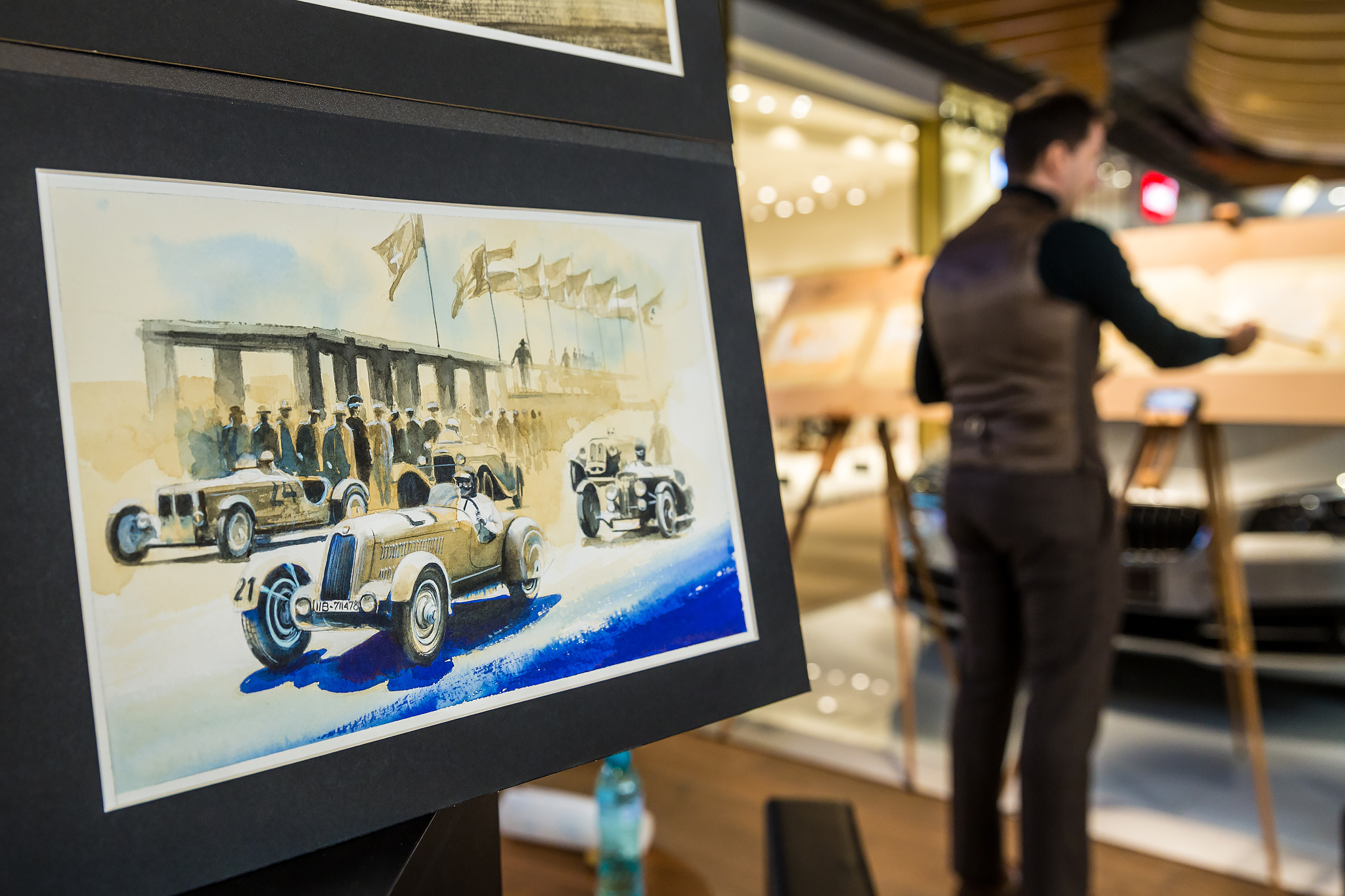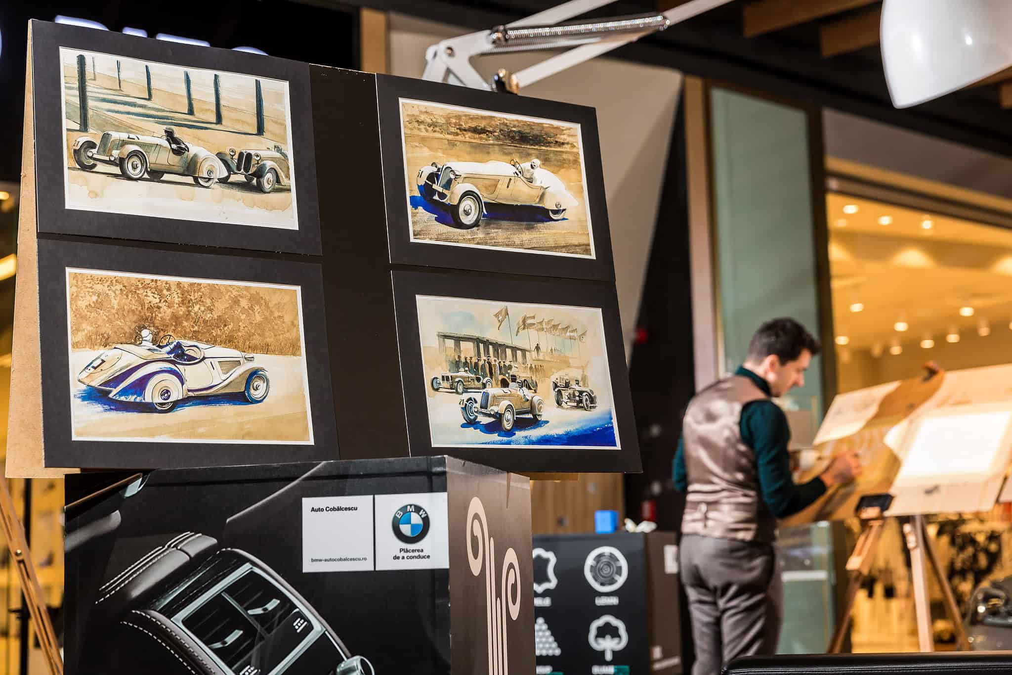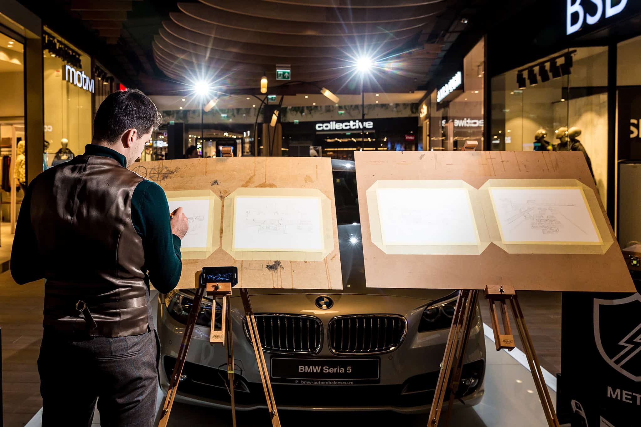 He set out to draw pictures from BMW’s 100-year history on November 7th and over the next 30 days his goal was to complete the 100 pictures so that they can be showed in a special exhibition for fans and curious bystanders at the same time. Furthermore, a choice was made that he would do so while surrounded by people and BMW models altogether, in one of the biggest shopping malls in Europe at the moment.