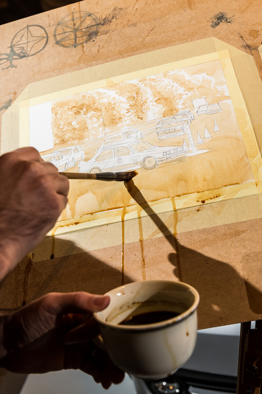 Enter stage: Adrian Mitu. You may not know his name but the Romanian painter has risen to a certain amount of celebrity due to his unconventional way of painting; he’s made a name for himself using coffee as his main coloring material.