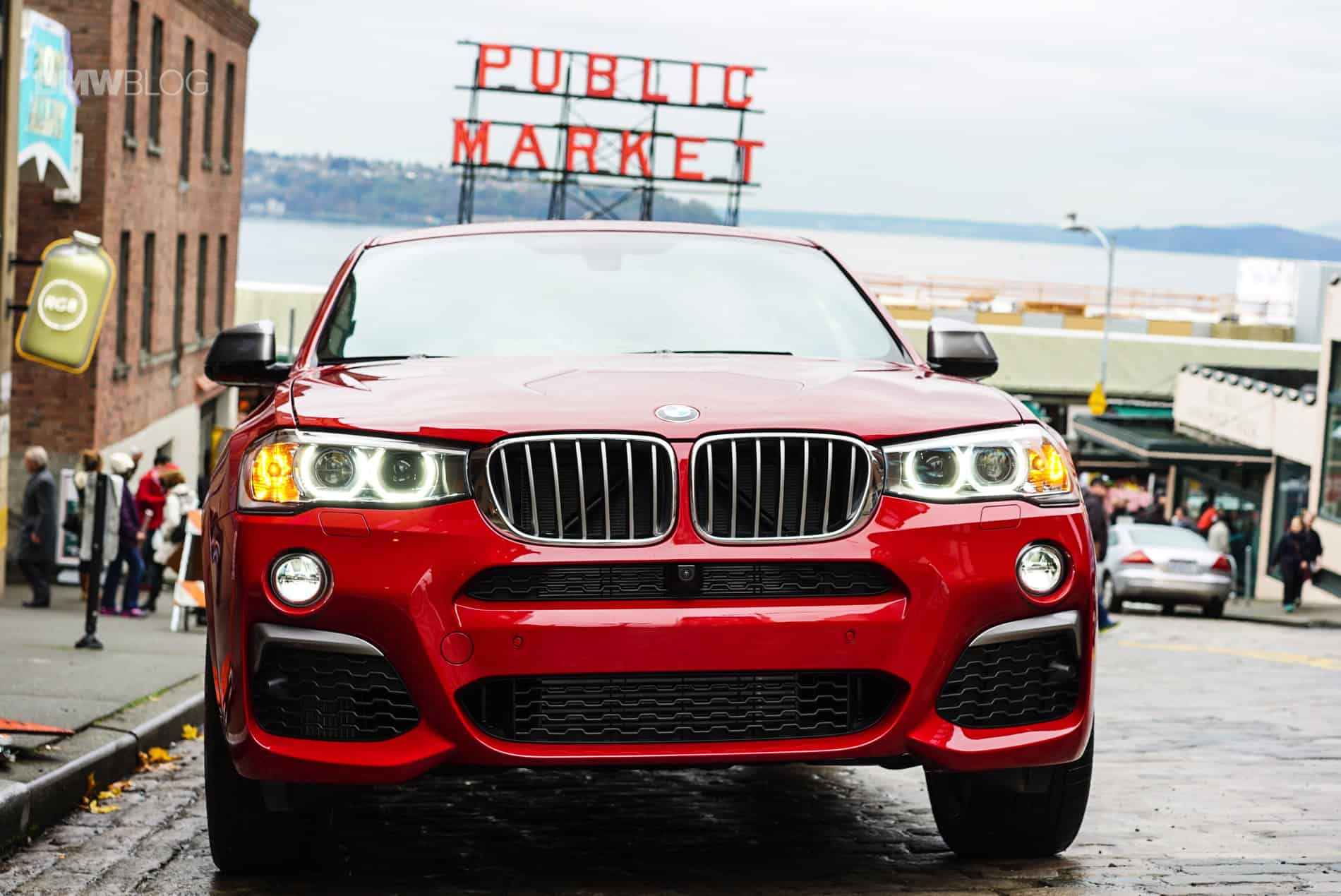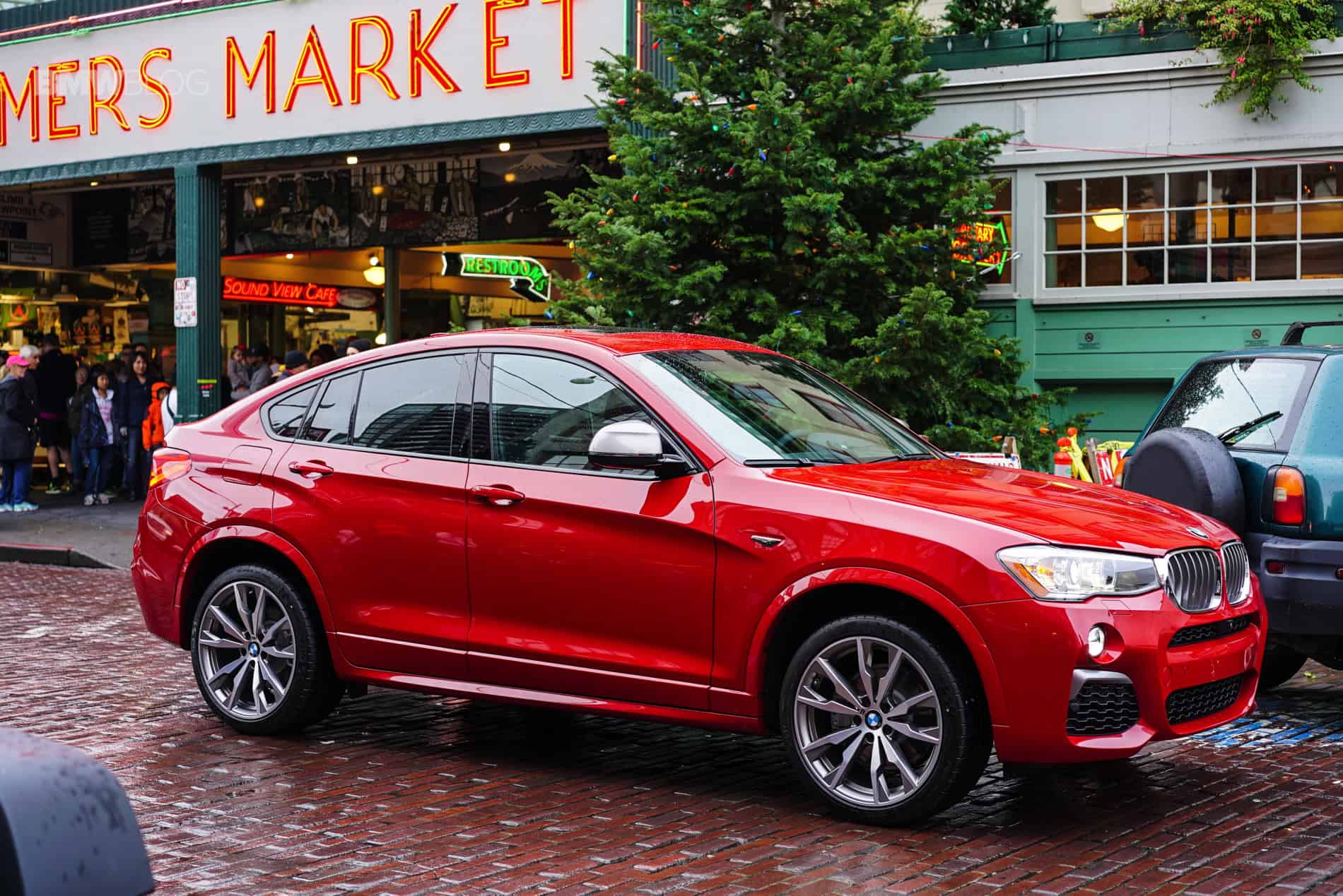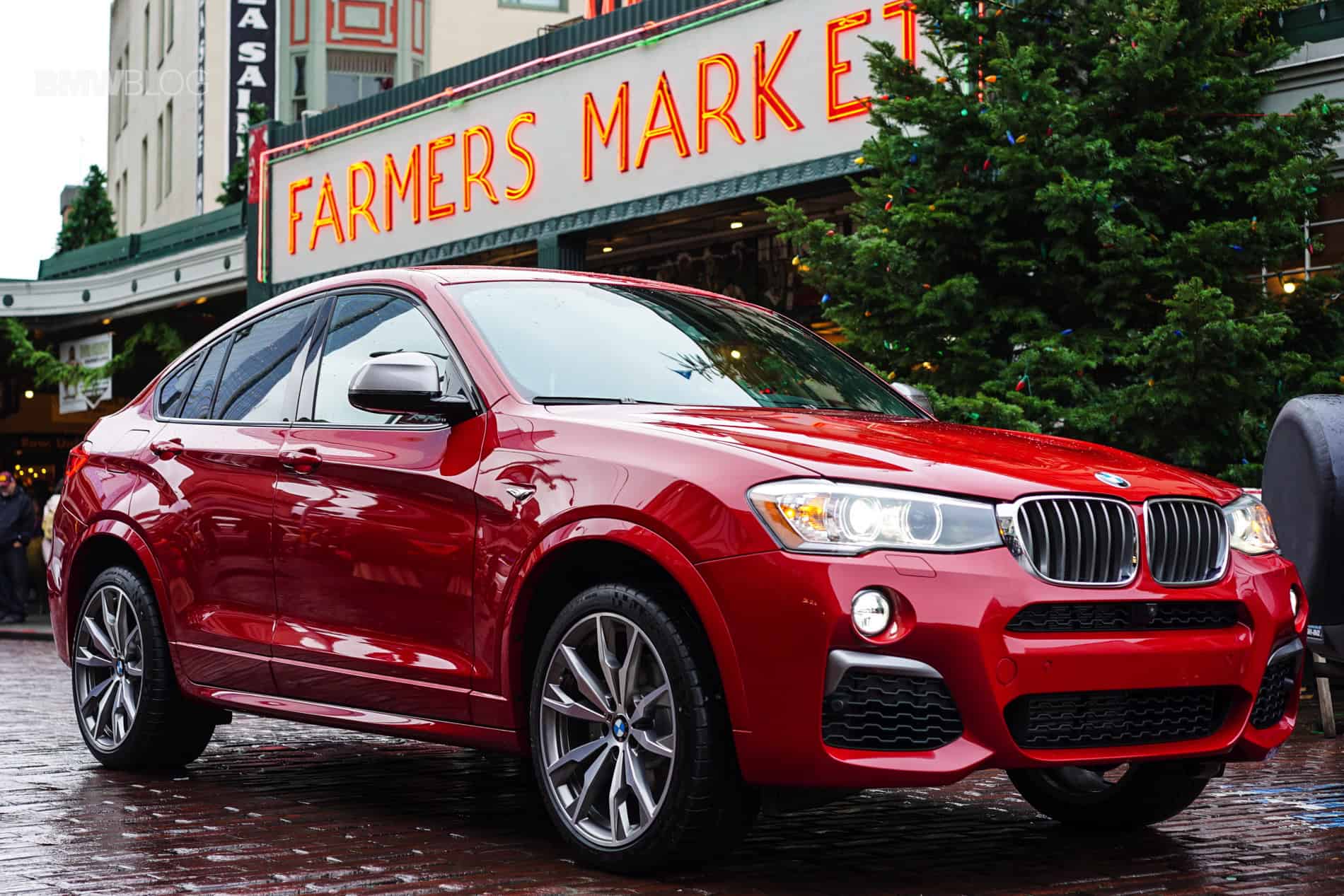 Pulling into the famous Pike Place Market, the narrow street lined with delivery vehicles and produce awaited us. Tons of people walking about looking at fruits and flowers and fish. As we’re trying to snap some photos of the X4 amongst the people, a gentleman walks up from the crowd and gives the car a good look. Because it’s a loaner from BMW Seattle it still has the price and option sheet affixed on the rear left passenger window. He gives it a quick read, looks at the X4 once again and nods “it’s pretty, and that red, you can see it from a mile away.” He’s right. Even among the beautifully decorated Christmas trees that can be found throughout Seattle in front of various businesses this time of year, this Melbourne red X4 M40i stands out and catches your eye. Just like that one year when you were 12-years old and you noticed a glowing gift under your Christmas tree that had your name on it. You wanted to open it but you were told you’d have to wait. Except this present is looking you straight in the face and is asking you to drive it hard. Not on Christmas Eve, but right now.